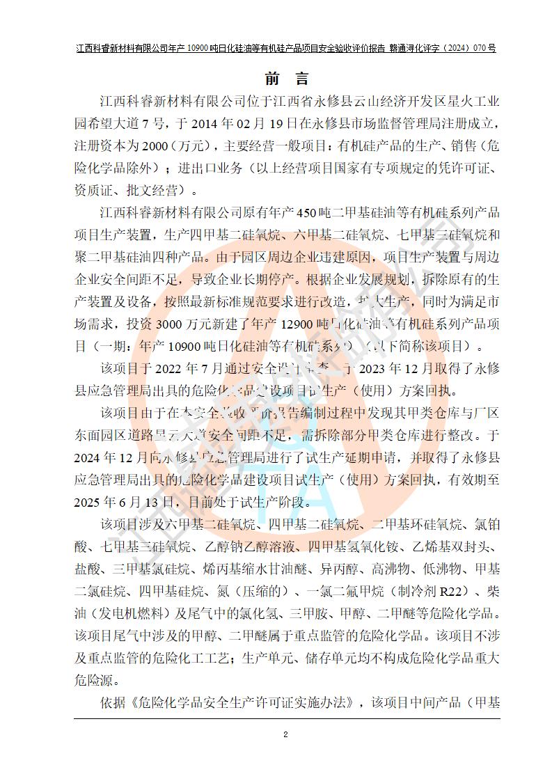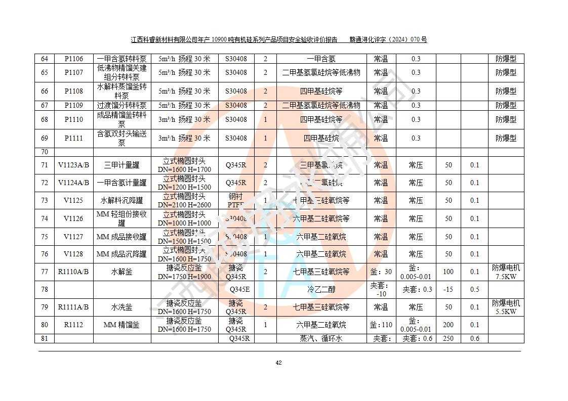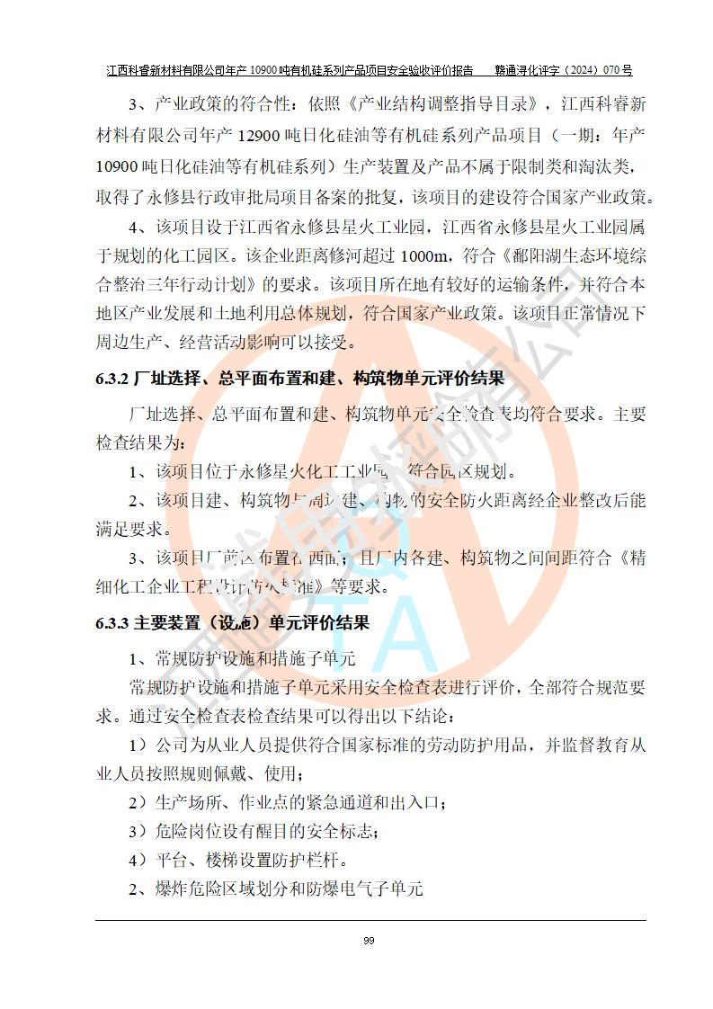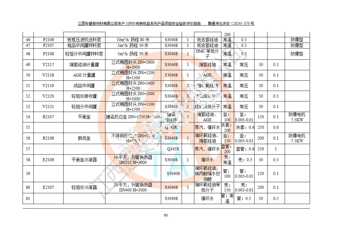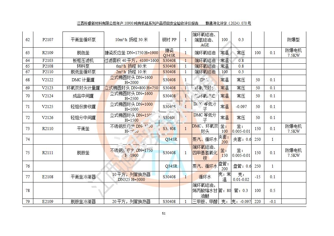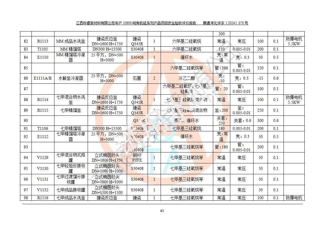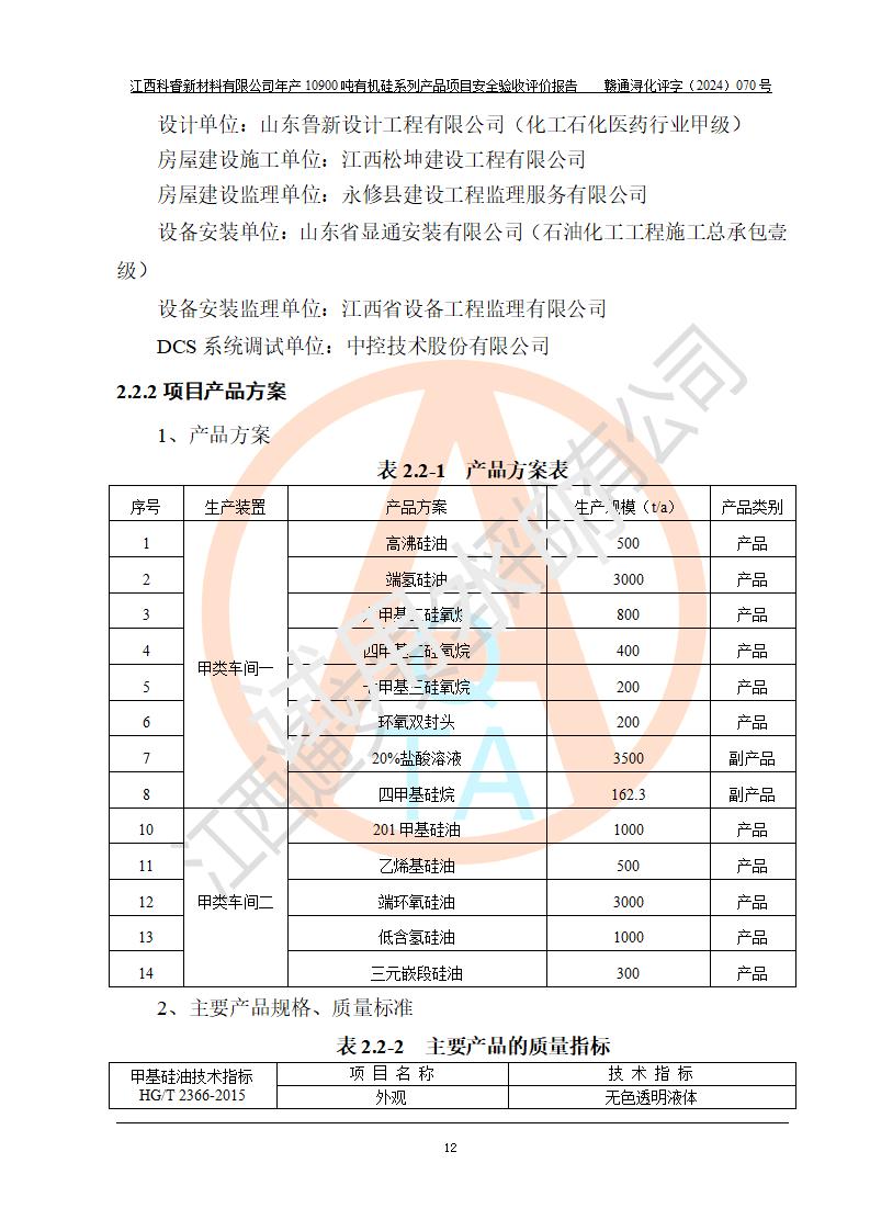 評價報告名稱 | 江西科睿新材料有限公司年產(chǎn)12900噸日化硅油等有機硅系列產(chǎn)品項目 (一期:年產(chǎn)10900噸日化硅油等有機硅系列)安全驗收評價 | |||||