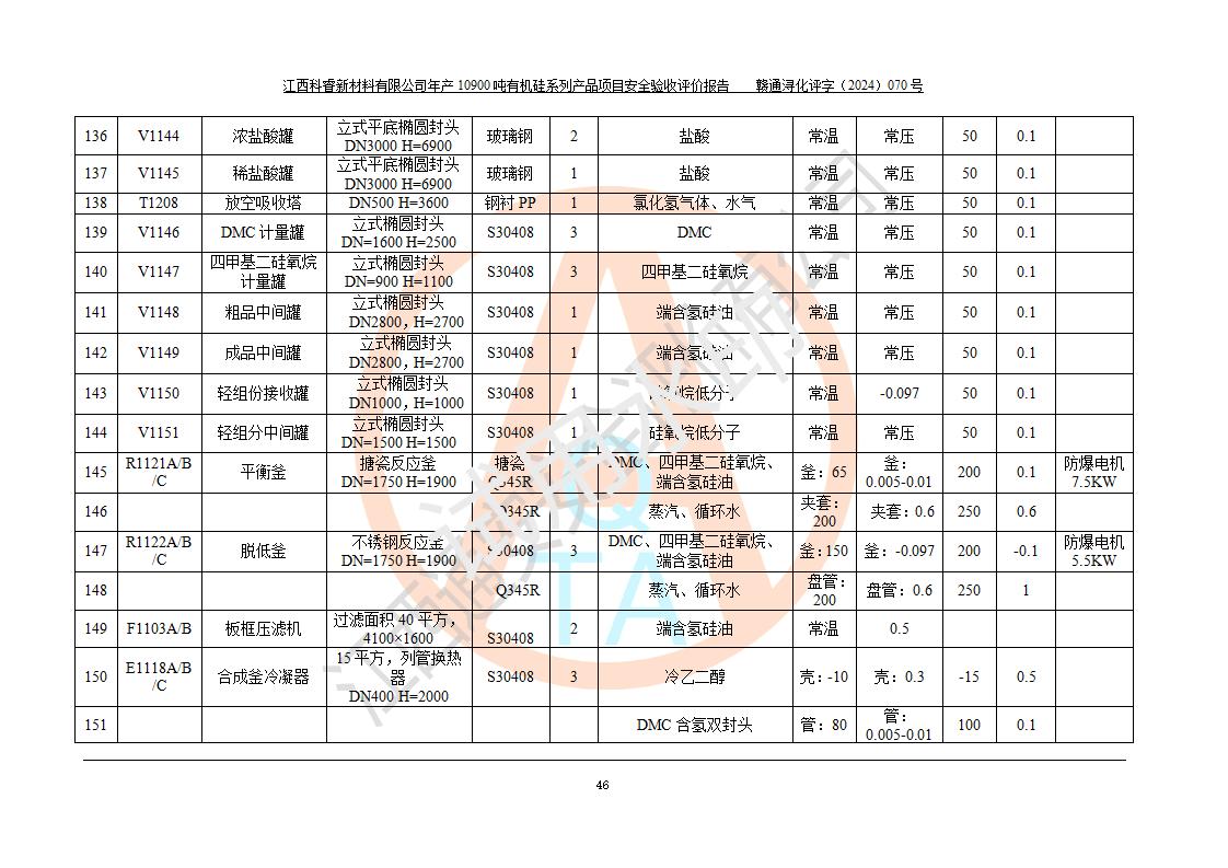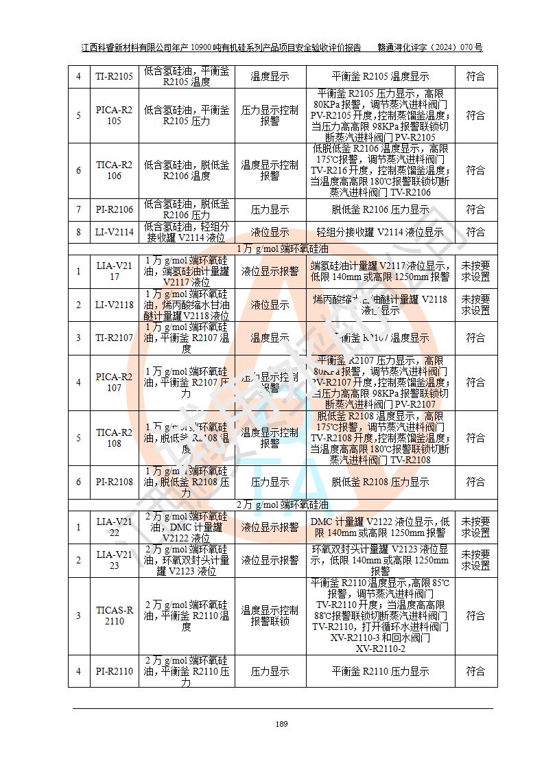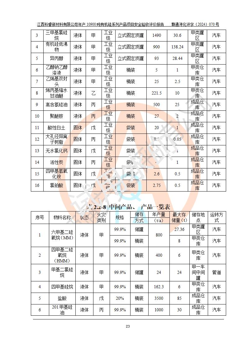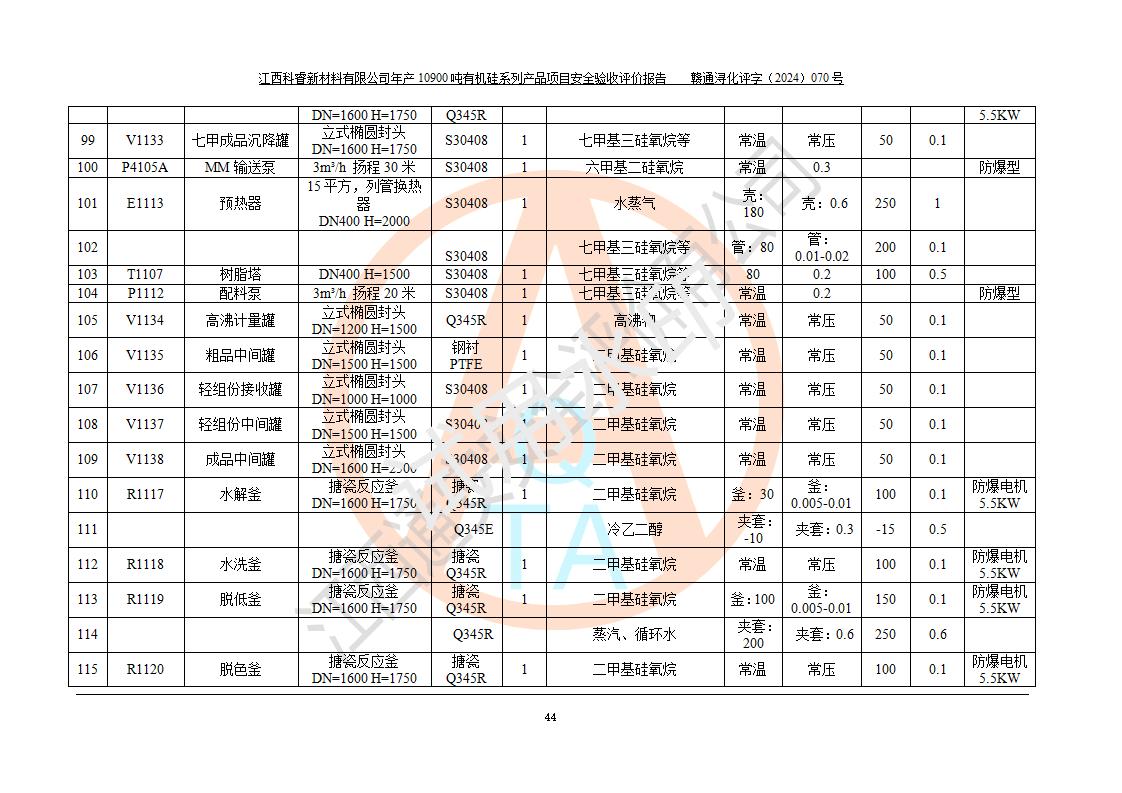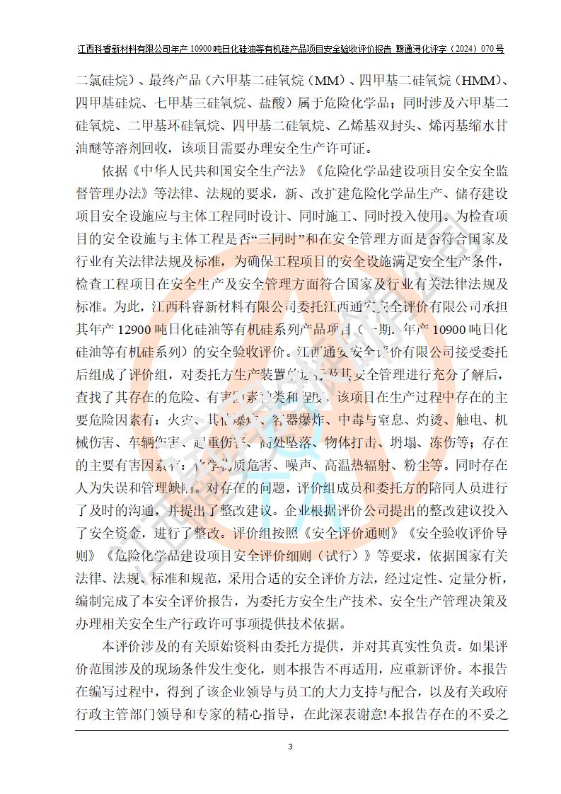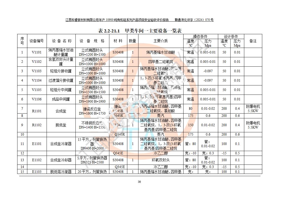 評價報告名稱 | 江西科睿新材料有限公司年產(chǎn)12900噸日化硅油等有機硅系列產(chǎn)品項目 (一期:年產(chǎn)10900噸日化硅油等有機硅系列)安全驗收評價 | |||||