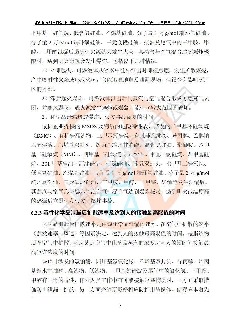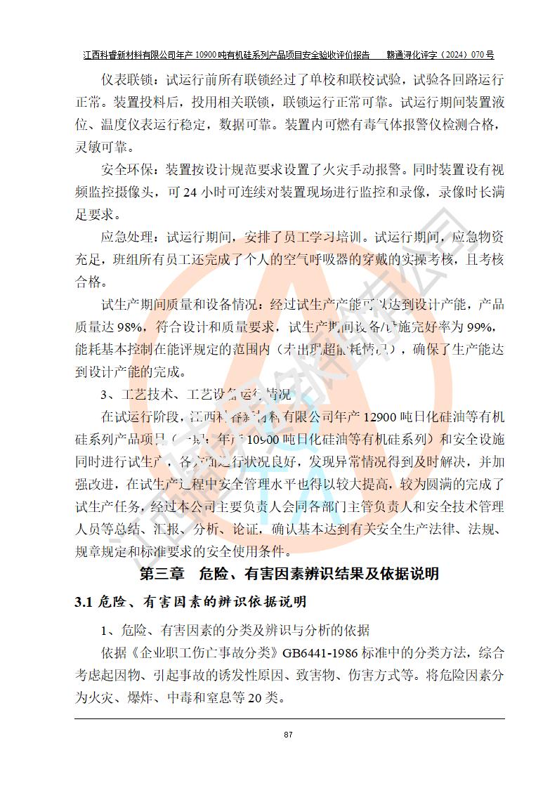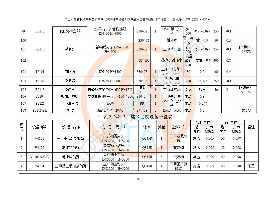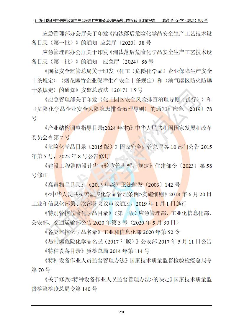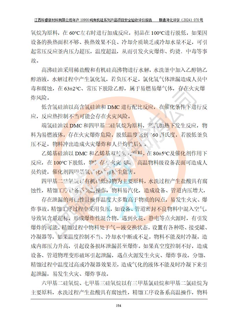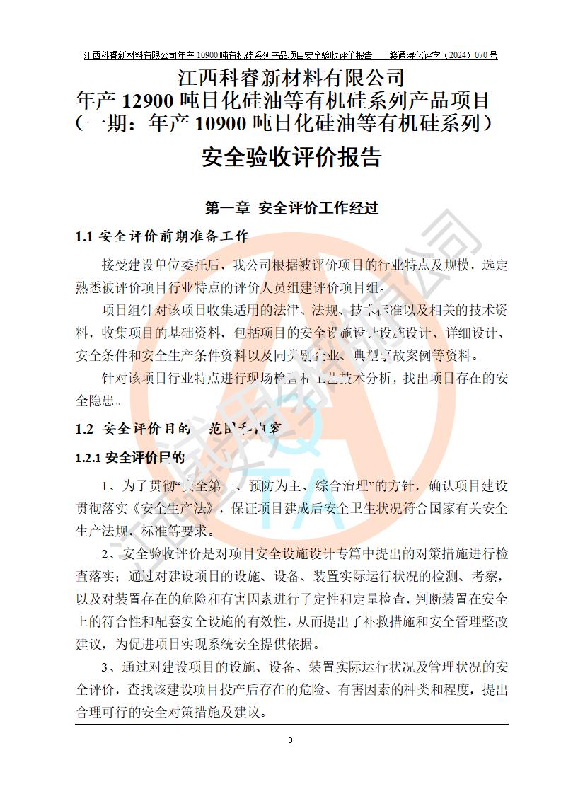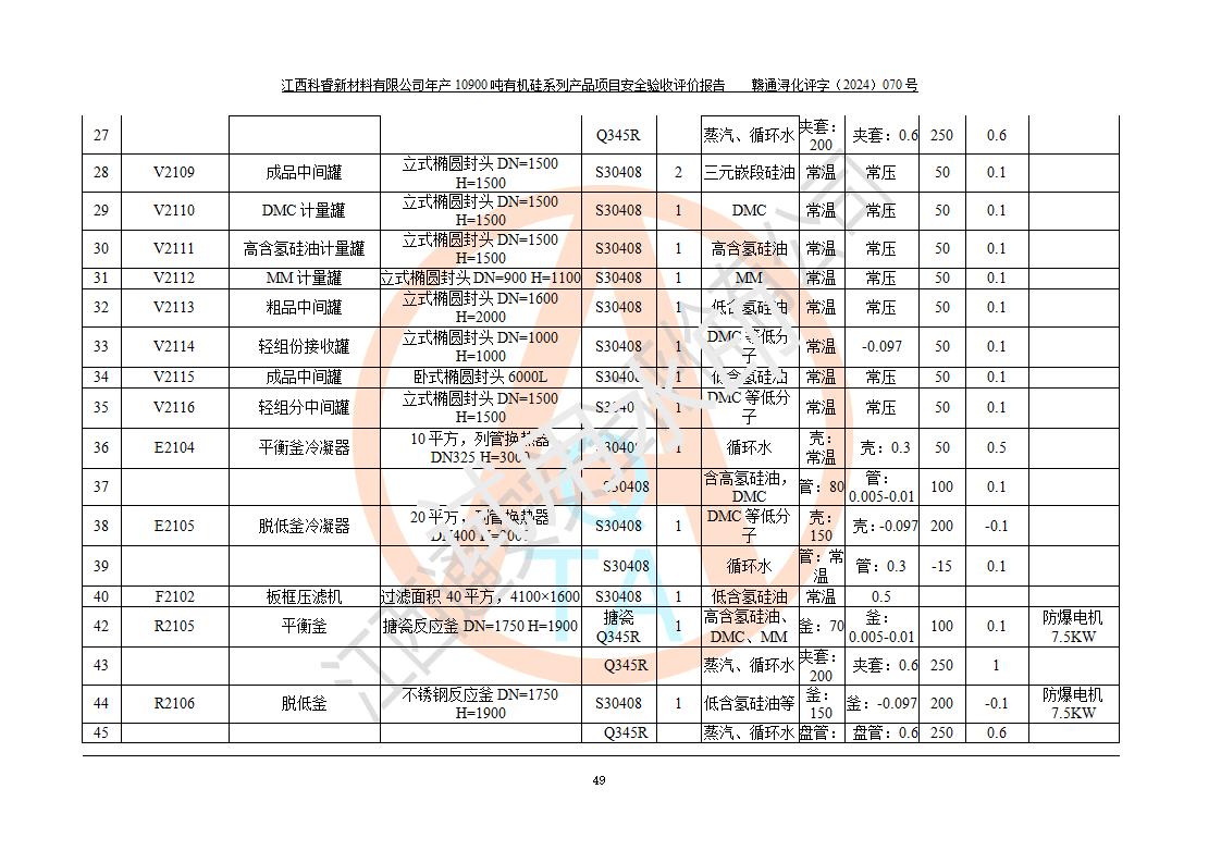 評價報告名稱 | 江西科睿新材料有限公司年產(chǎn)12900噸日化硅油等有機硅系列產(chǎn)品項目 (一期:年產(chǎn)10900噸日化硅油等有機硅系列)安全驗收評價 | |||||