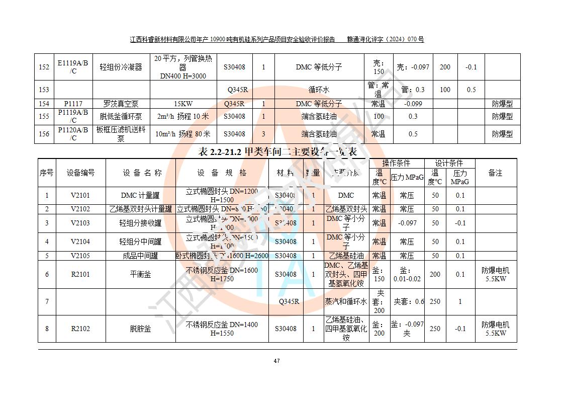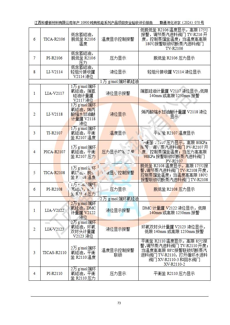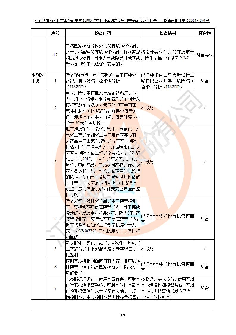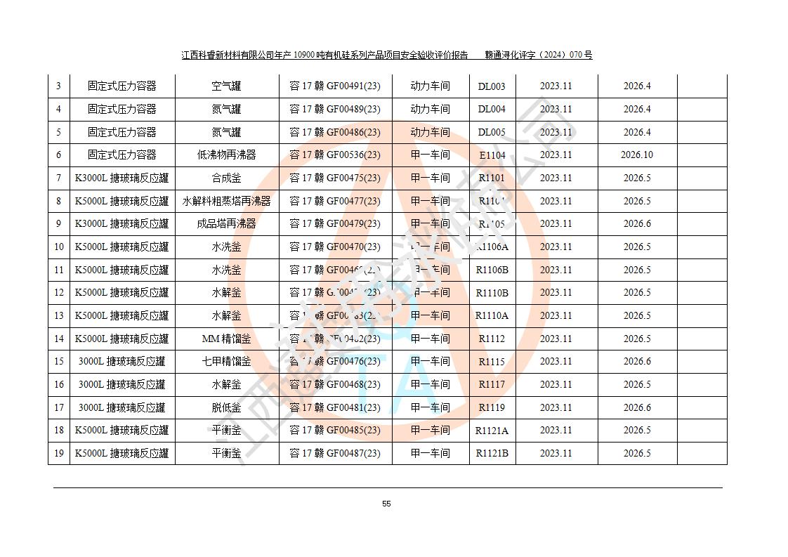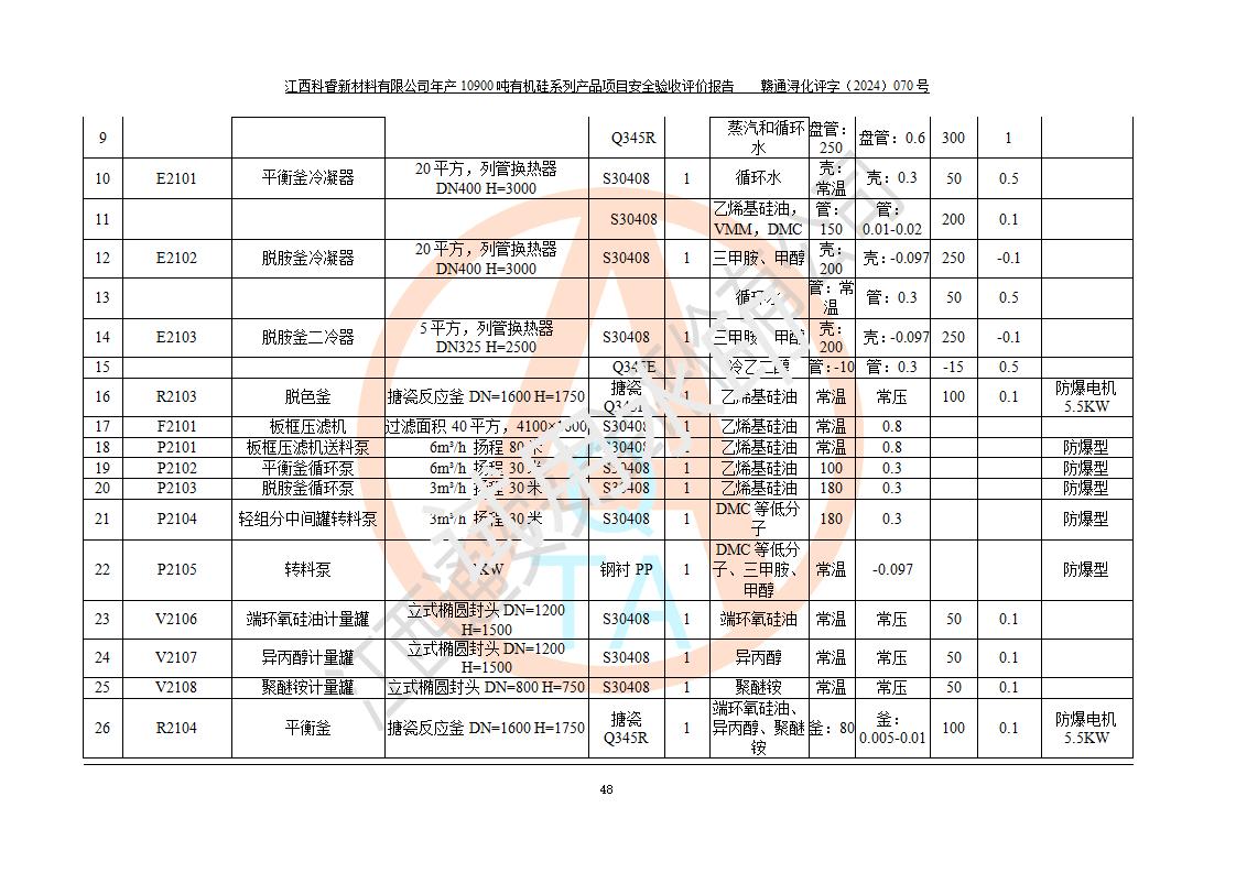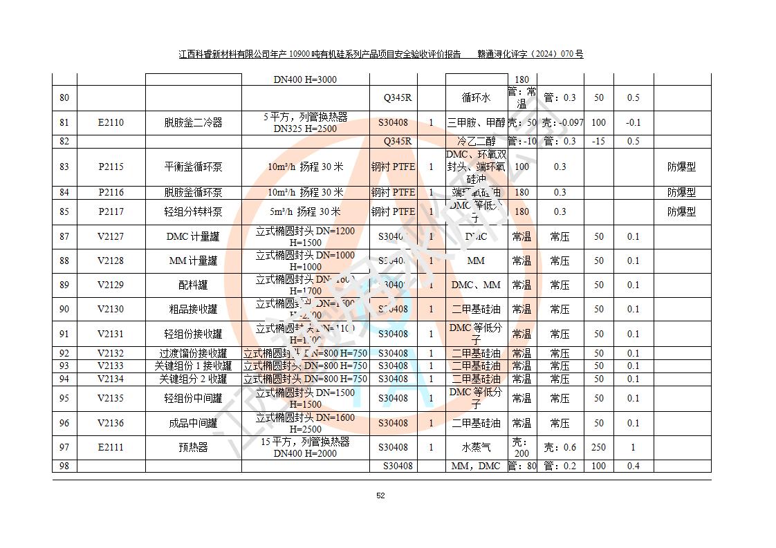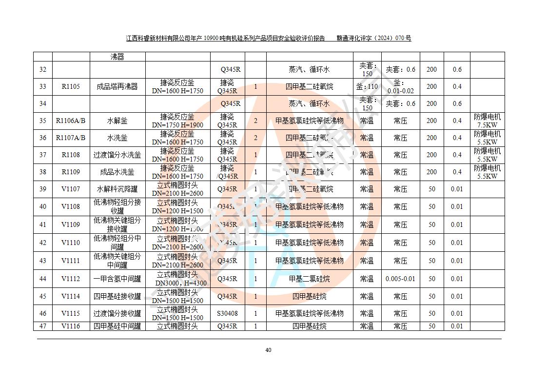評價報告名稱 | 江西科睿新材料有限公司年產(chǎn)12900噸日化硅油等有機硅系列產(chǎn)品項目 (一期:年產(chǎn)10900噸日化硅油等有機硅系列)安全驗收評價 | |||||
