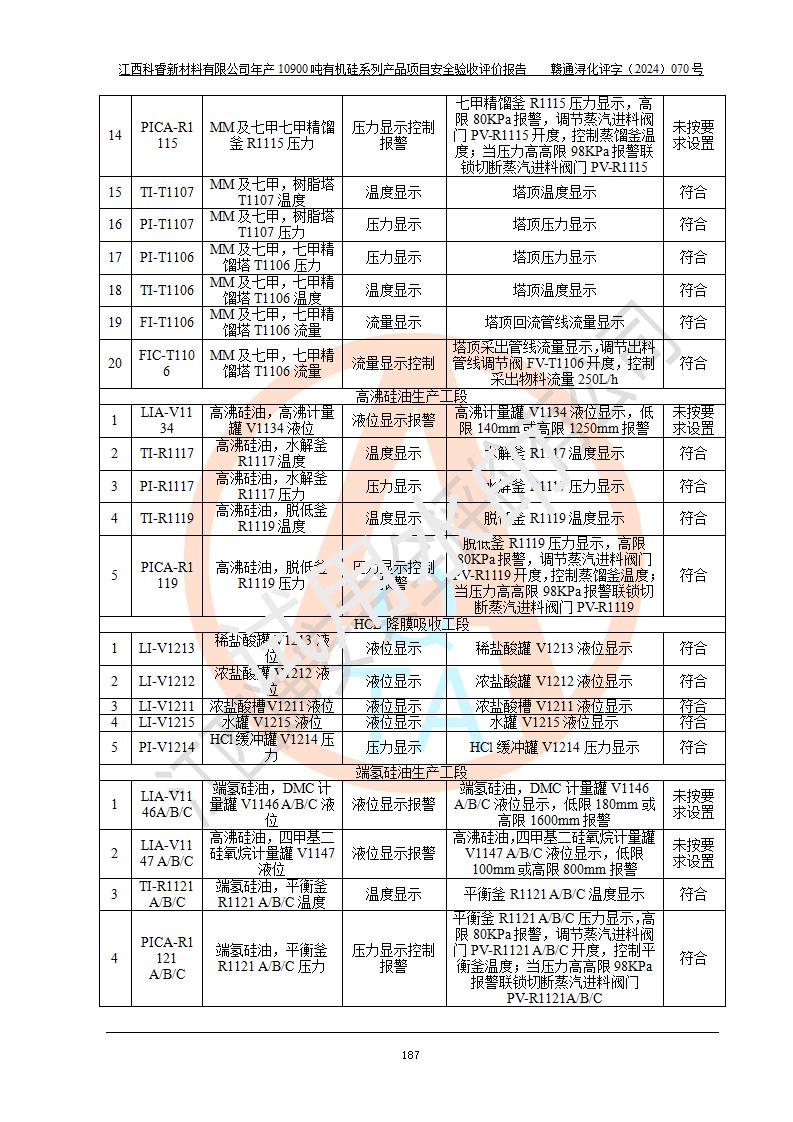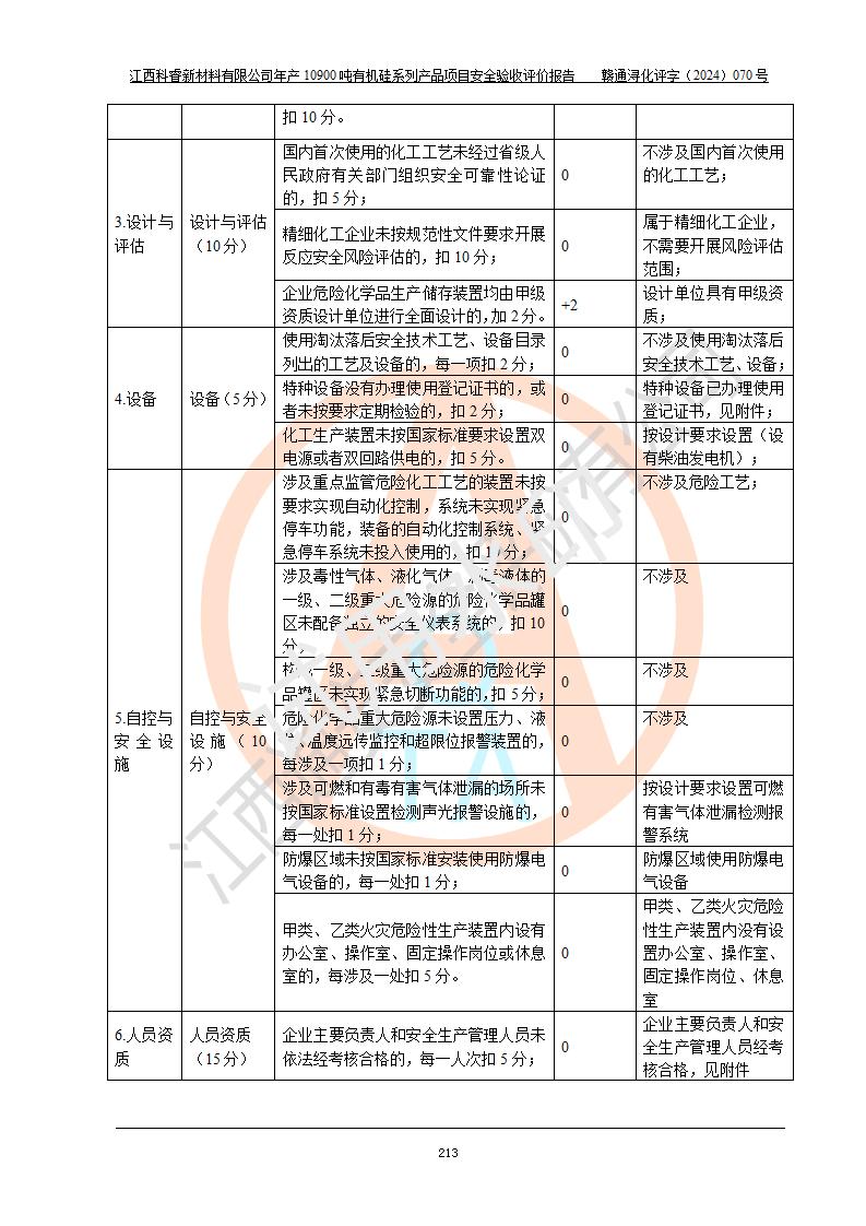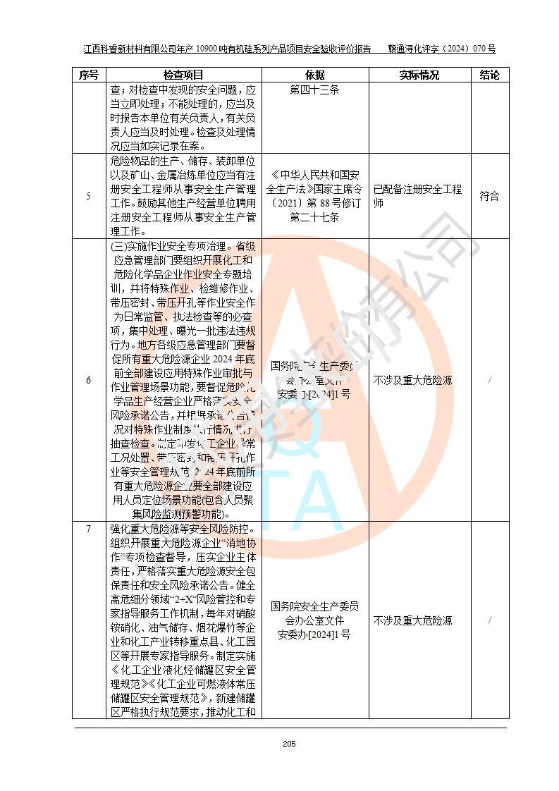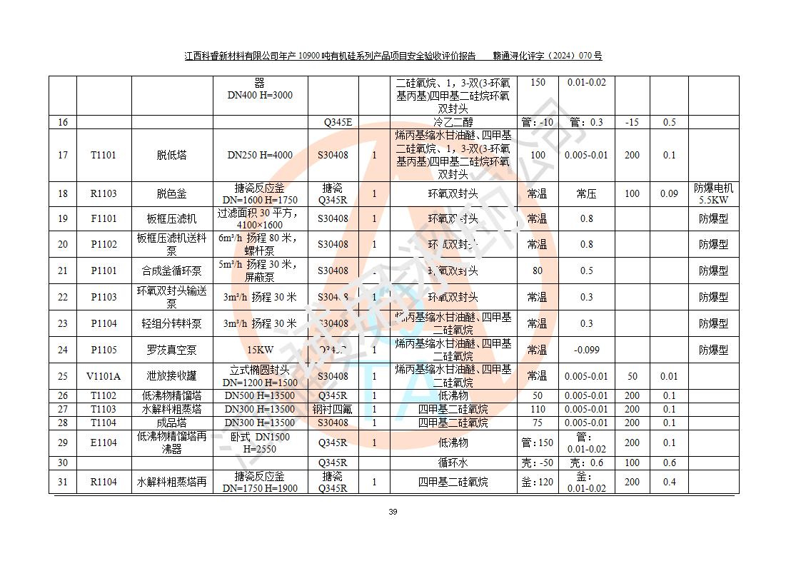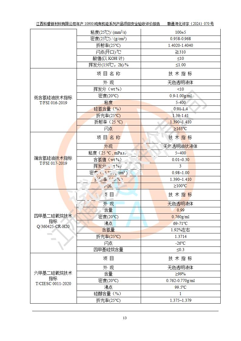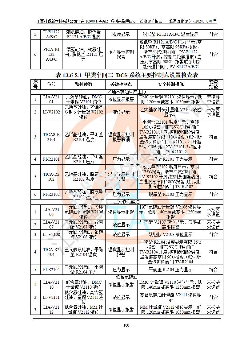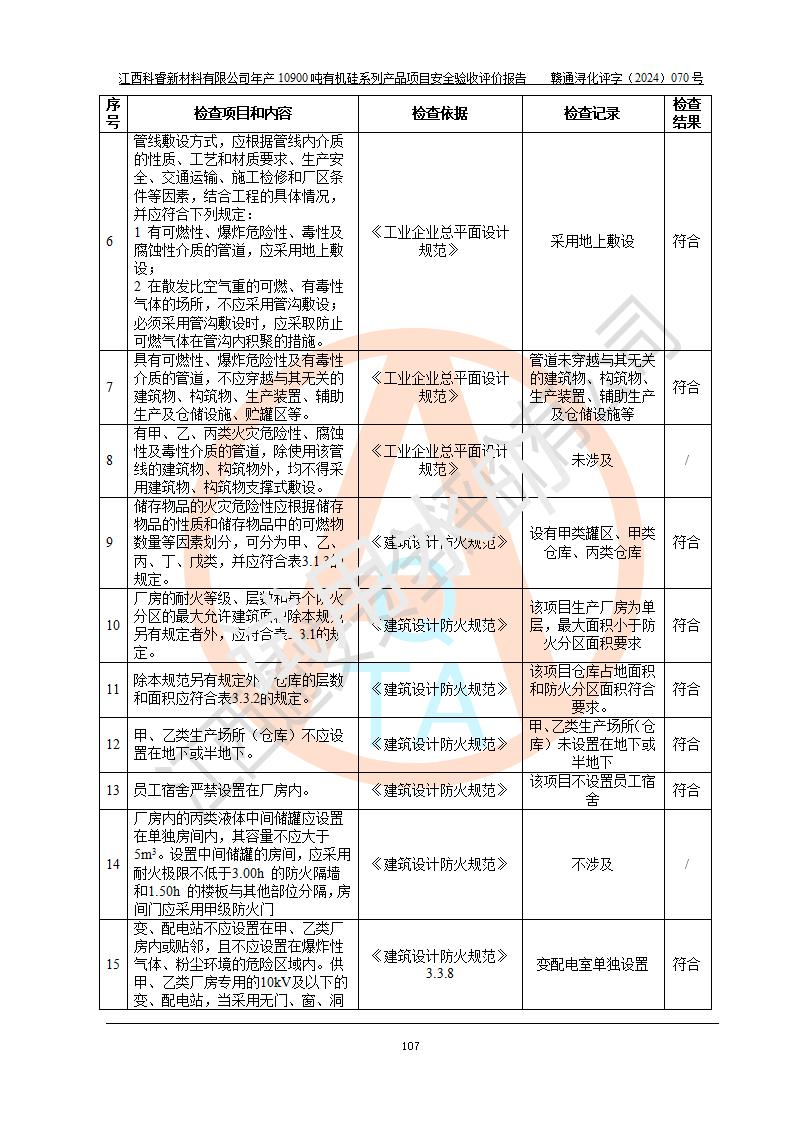 評價報告名稱 | 江西科睿新材料有限公司年產(chǎn)12900噸日化硅油等有機硅系列產(chǎn)品項目 (一期:年產(chǎn)10900噸日化硅油等有機硅系列)安全驗收評價 | |||||