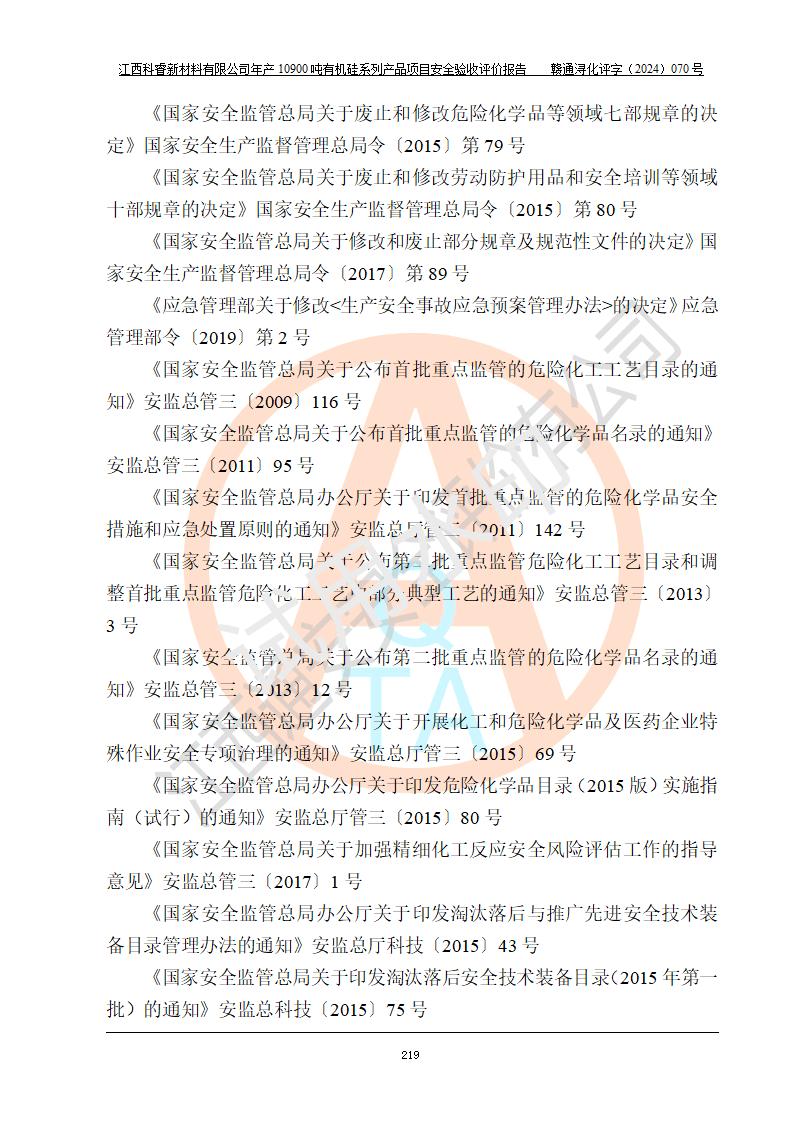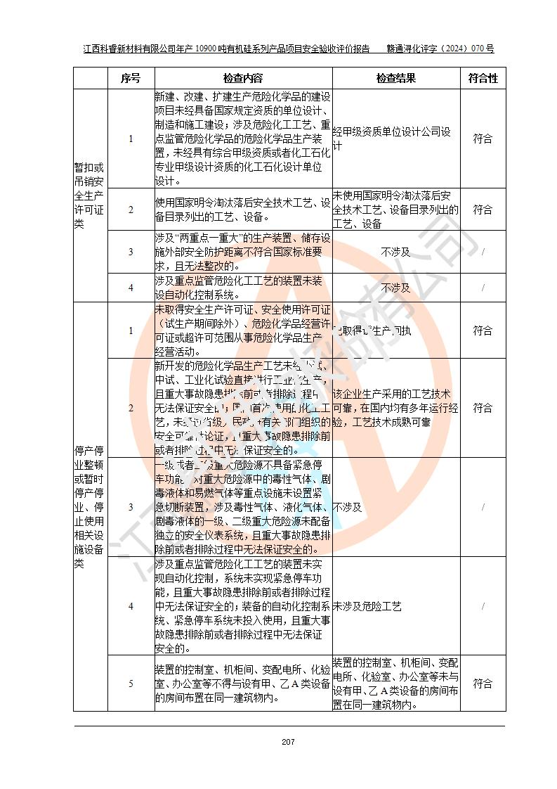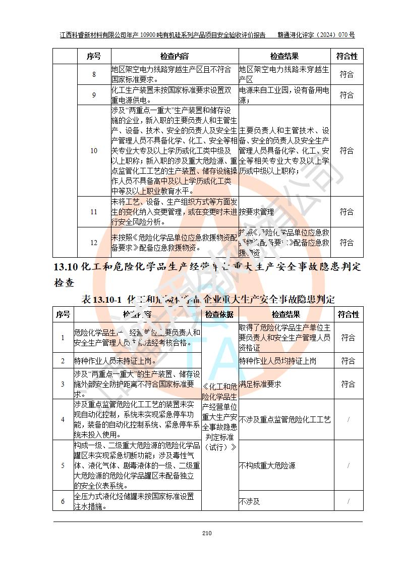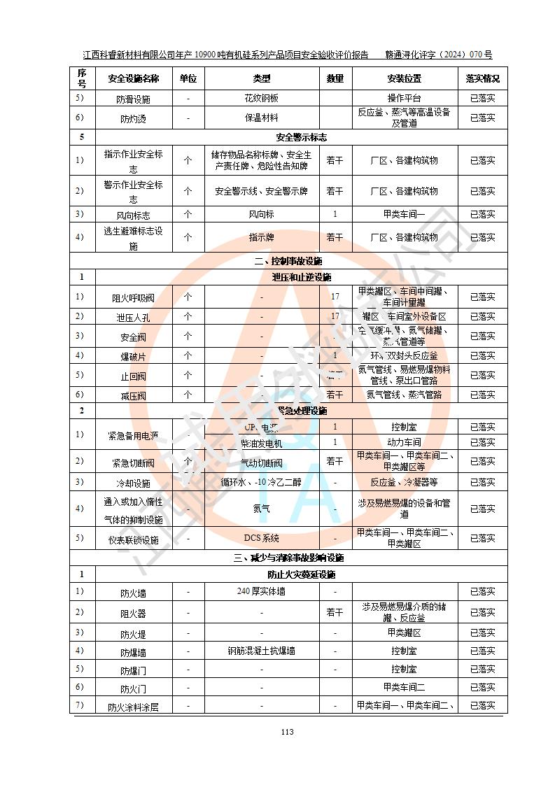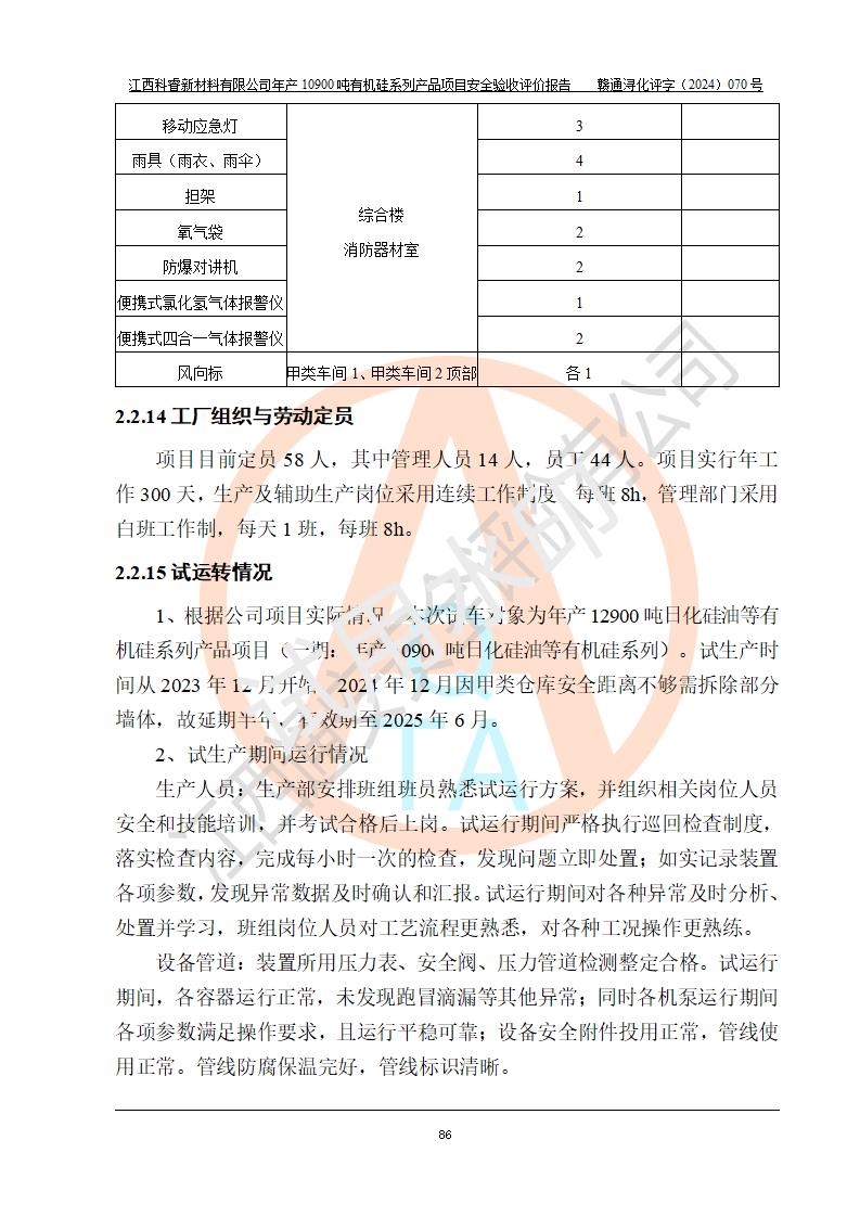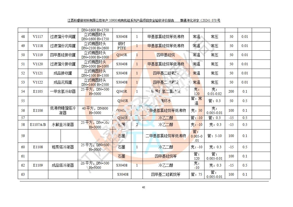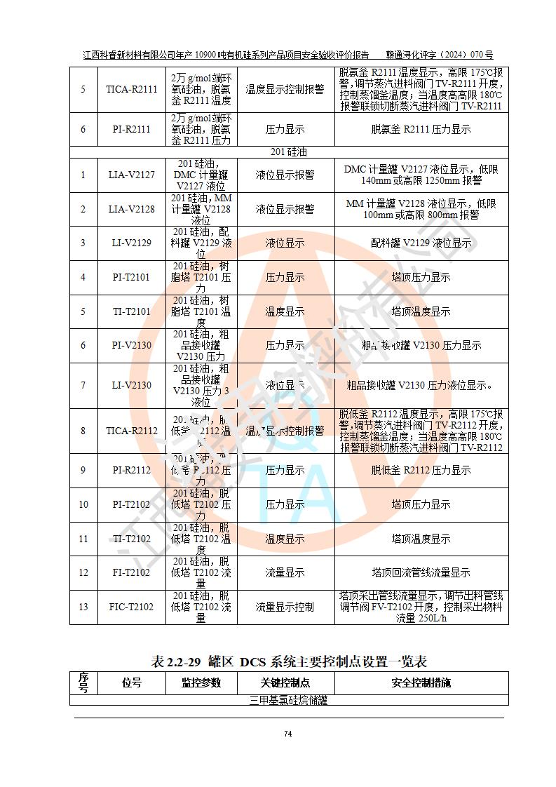 評價報告名稱 | 江西科睿新材料有限公司年產(chǎn)12900噸日化硅油等有機硅系列產(chǎn)品項目 (一期:年產(chǎn)10900噸日化硅油等有機硅系列)安全驗收評價 | |||||