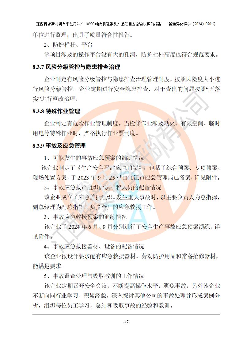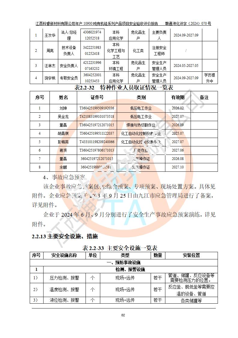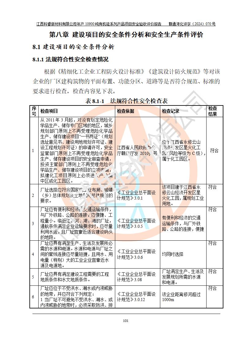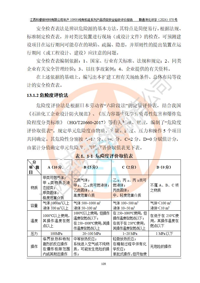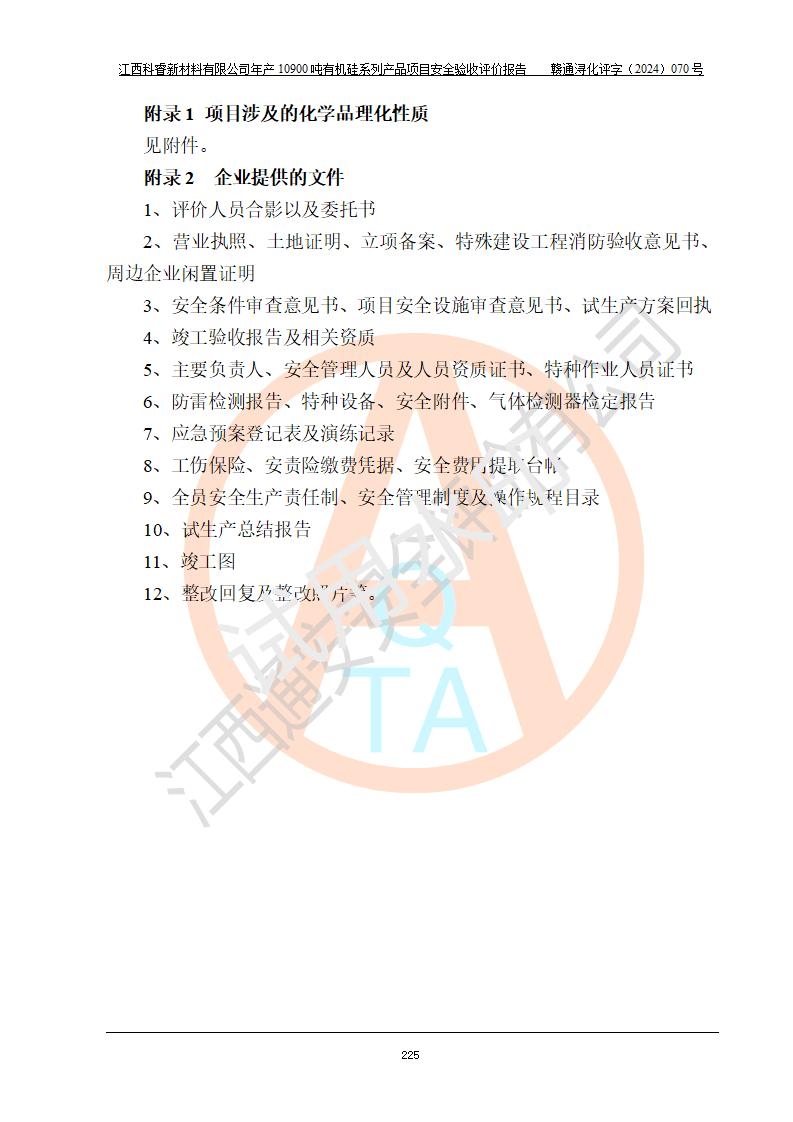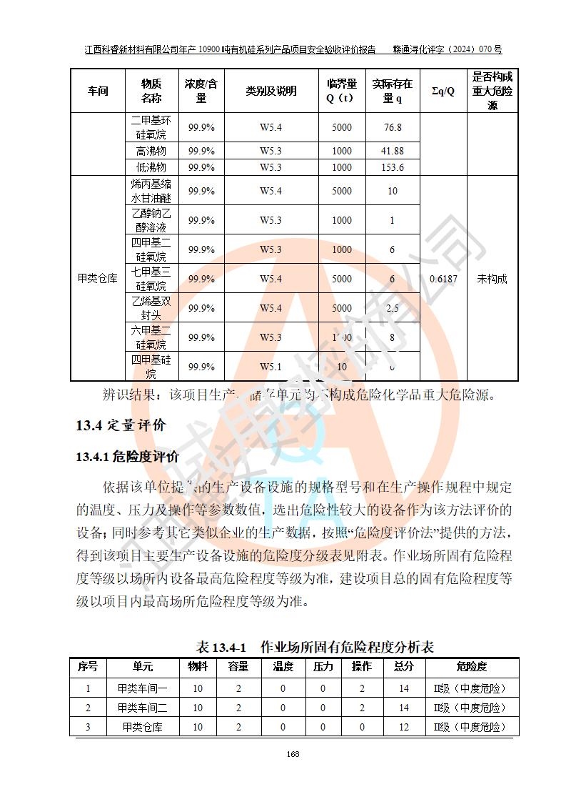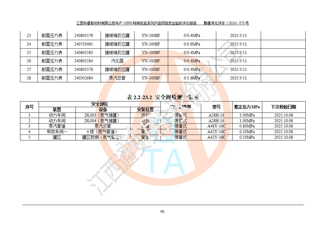 評價報告名稱 | 江西科睿新材料有限公司年產(chǎn)12900噸日化硅油等有機硅系列產(chǎn)品項目 (一期:年產(chǎn)10900噸日化硅油等有機硅系列)安全驗收評價 | |||||