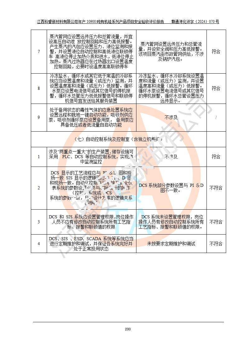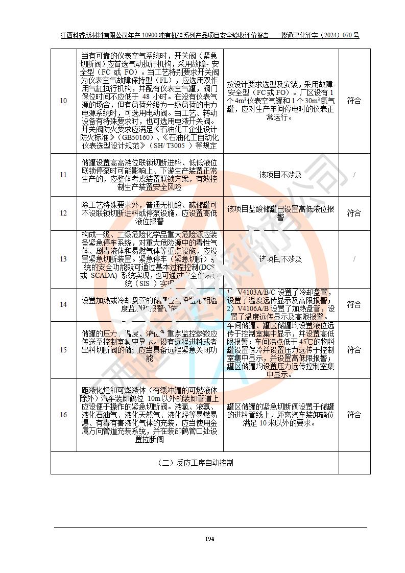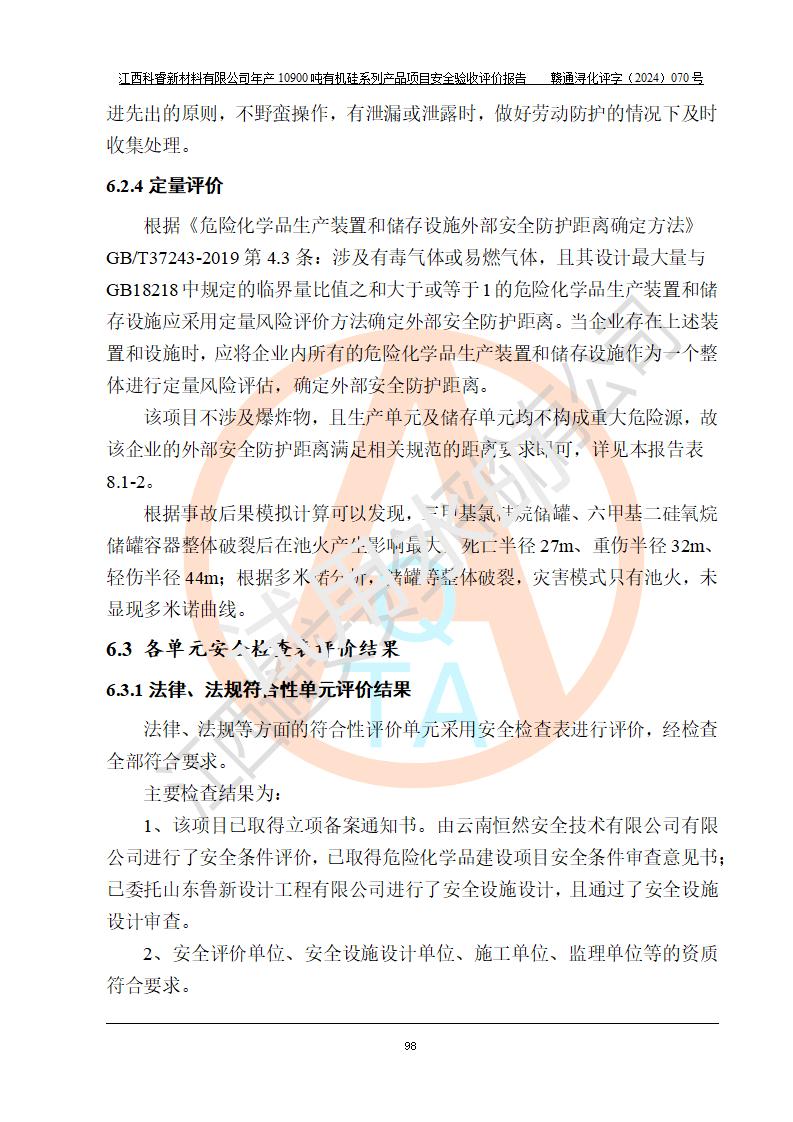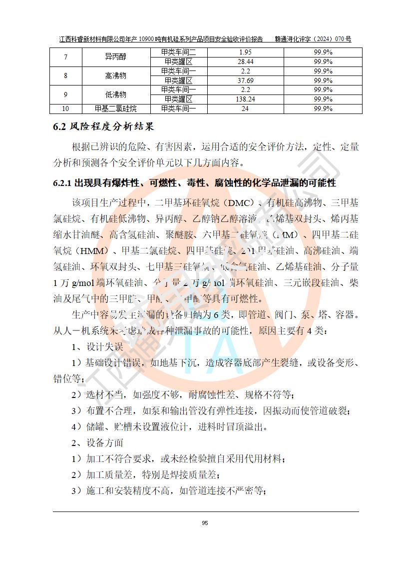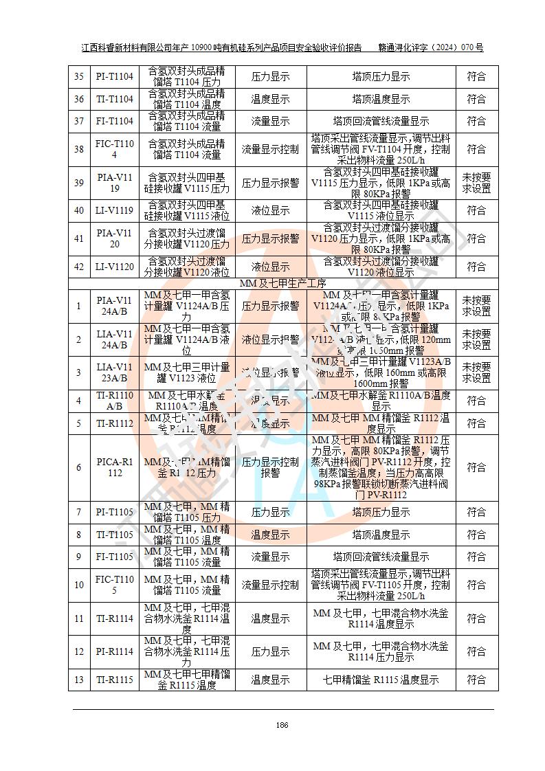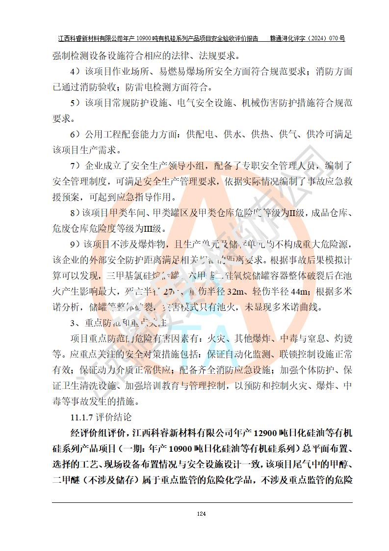 評價結(jié)論 | 經(jīng)評價組評價,江西科睿新材料有限公司年產(chǎn)12900噸日化硅油等有機硅系列產(chǎn)品項目(一期:年產(chǎn)10900噸日化硅油等有機硅系列)總平面布置、選擇的工藝、現(xiàn)場設(shè)備布置情況與安全設(shè)施設(shè)計一致,該項目尾氣中的甲醇、二甲醚(不涉及儲存)屬于重點監(jiān)管的危險化學品,不涉及重點監(jiān)管的危險工藝、重大危險源,已按設(shè)計要求設(shè)置有DCS系統(tǒng)、GDS系統(tǒng),符合《江西省應(yīng)急管理廳關(guān)于印發(fā)《江西省化工企業(yè)自動化提升實施方案》(試行)的通知 》,符合《危險化學品生產(chǎn)企業(yè)安全生產(chǎn)許可證實施辦法》、《危險化學品生產(chǎn)建設(shè)項目安全風險防控指南(試行)》規(guī)定竣工驗收的安全條件;企業(yè)主要負責人、安全管理部門負責人均為化學、化工相關(guān)專業(yè),且有3年以上化工行業(yè)從業(yè)經(jīng)歷,配備有化工類注冊安全工程師,企業(yè)主要負責人及安全管理人員已取得危險化學品企業(yè)主要負責人及安全管理人員考核合格證。 項目運行后存在的主要危險、有害因素有:火災(zāi)、其他爆炸、中毒與窒息等;存在的主要有害因素有化學物質(zhì)危害、高溫等;針對存在的危險、有害因素,企業(yè)采取了**的安全技術(shù)措施及安全管理措施,符合**有關(guān)法規(guī)、標準、規(guī)范要求;項目風險可控,其安全生產(chǎn)條件和安全管理方面具備竣工安全驗收的條件。 | |||||