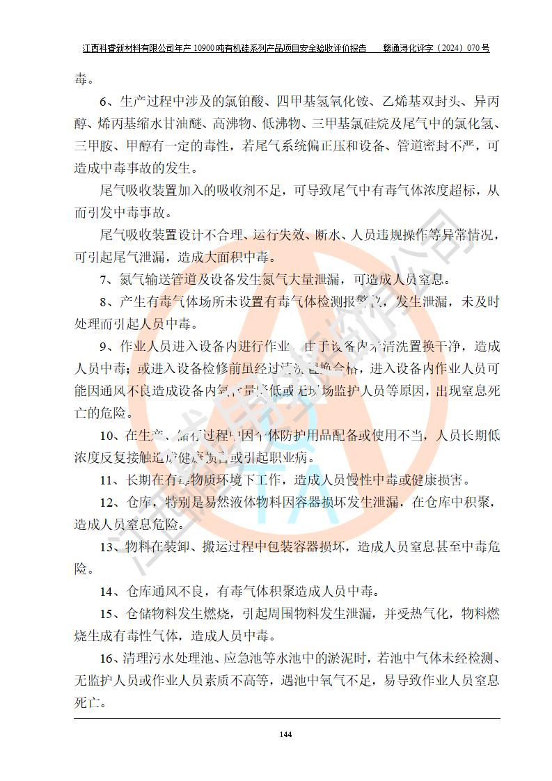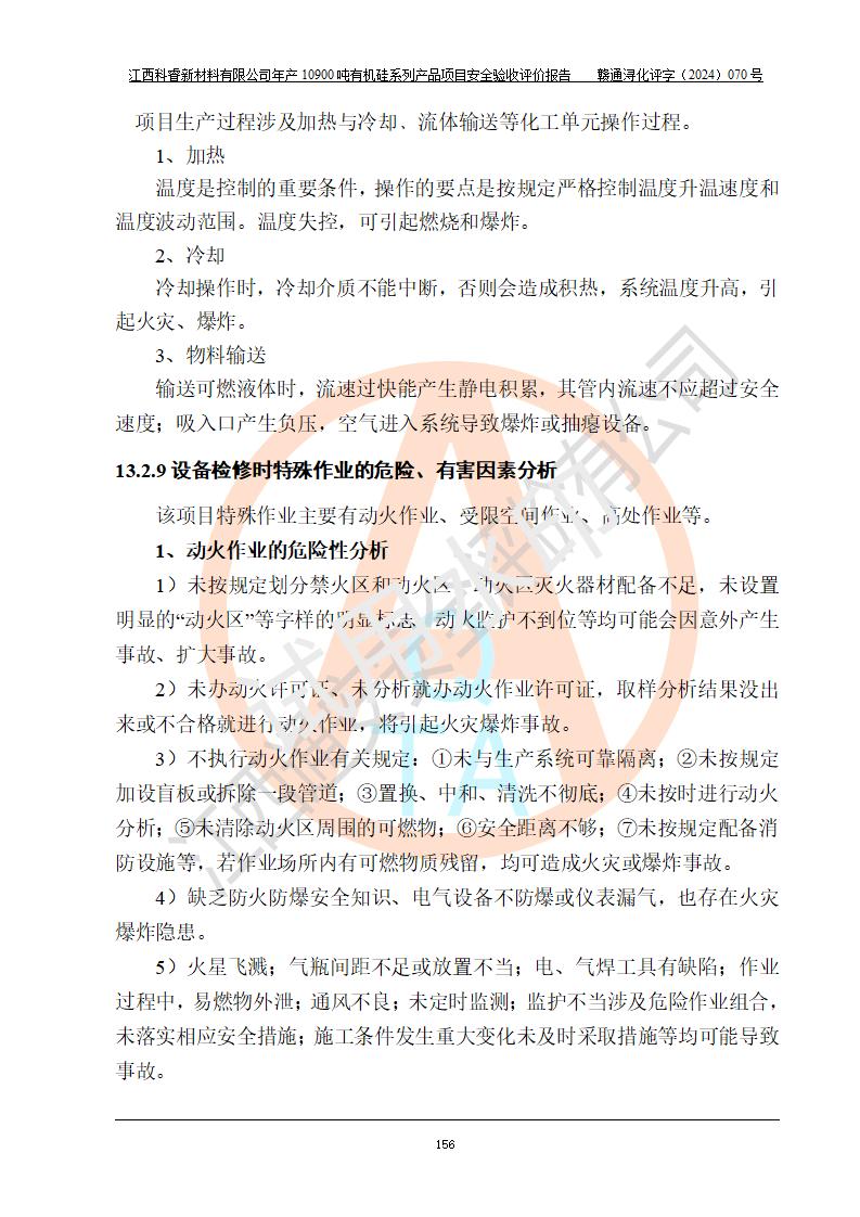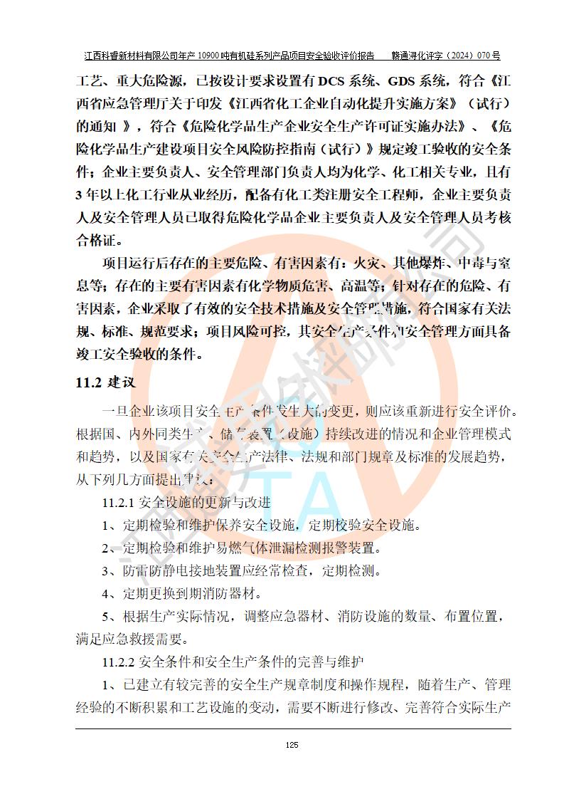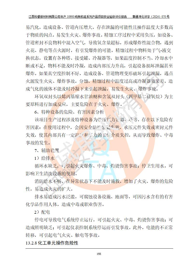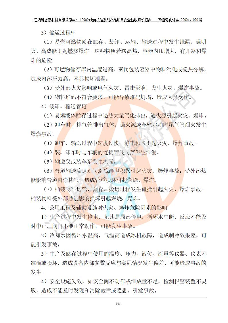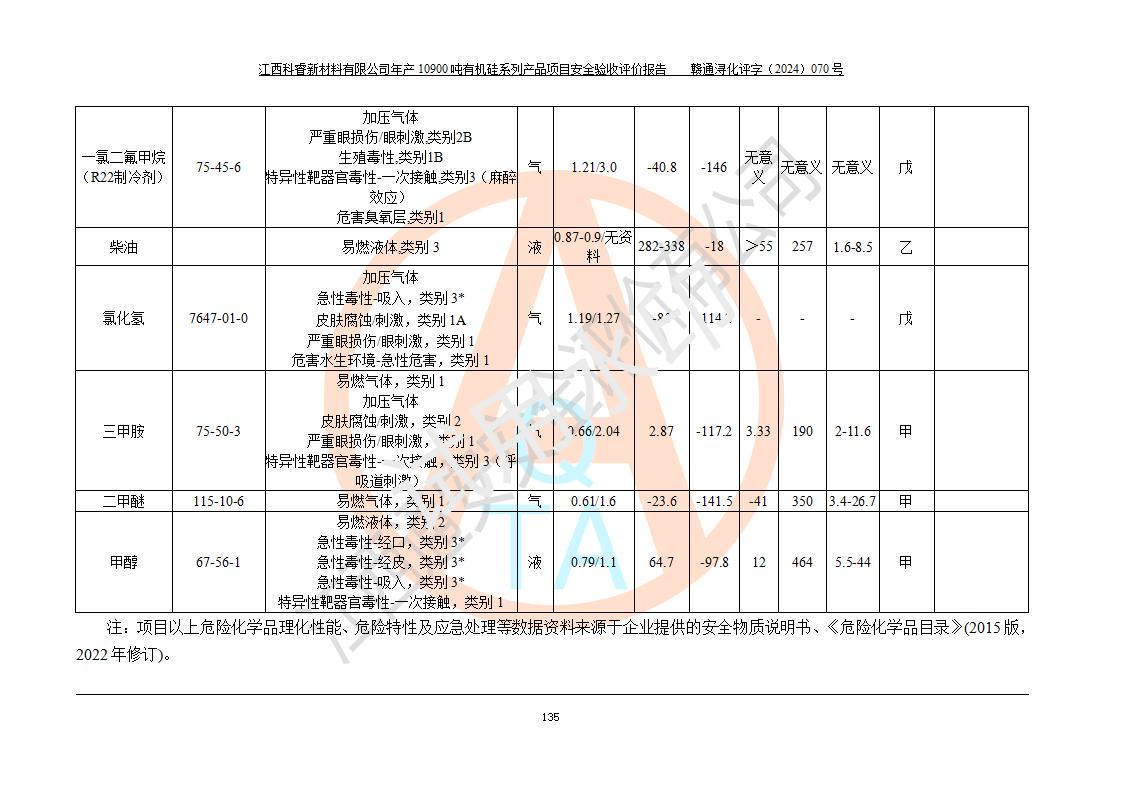評價結(jié)論 | 經(jīng)評價組評價,江西科睿新材料有限公司年產(chǎn)12900噸日化硅油等有機硅系列產(chǎn)品項目(一期:年產(chǎn)10900噸日化硅油等有機硅系列)總平面布置、選擇的工藝、現(xiàn)場設(shè)備布置情況與安全設(shè)施設(shè)計一致,該項目尾氣中的甲醇、二甲醚(不涉及儲存)屬于重點監(jiān)管的危險化學品,不涉及重點監(jiān)管的危險工藝、重大危險源,已按設(shè)計要求設(shè)置有DCS系統(tǒng)、GDS系統(tǒng),符合《江西省應(yīng)急管理廳關(guān)于印發(fā)《江西省化工企業(yè)自動化提升實施方案》(試行)的通知 》,符合《危險化學品生產(chǎn)企業(yè)安全生產(chǎn)許可證實施辦法》、《危險化學品生產(chǎn)建設(shè)項目安全風險防控指南(試行)》規(guī)定竣工驗收的安全條件;企業(yè)主要負責人、安全管理部門負責人均為化學、化工相關(guān)專業(yè),且有3年以上化工行業(yè)從業(yè)經(jīng)歷,配備有化工類注冊安全工程師,企業(yè)主要負責人及安全管理人員已取得危險化學品企業(yè)主要負責人及安全管理人員考核合格證。 項目運行后存在的主要危險、有害因素有:火災(zāi)、其他爆炸、中毒與窒息等;存在的主要有害因素有化學物質(zhì)危害、高溫等;針對存在的危險、有害因素,企業(yè)采取了**的安全技術(shù)措施及安全管理措施,符合**有關(guān)法規(guī)、標準、規(guī)范要求;項目風險可控,其安全生產(chǎn)條件和安全管理方面具備竣工安全驗收的條件。 | |||||