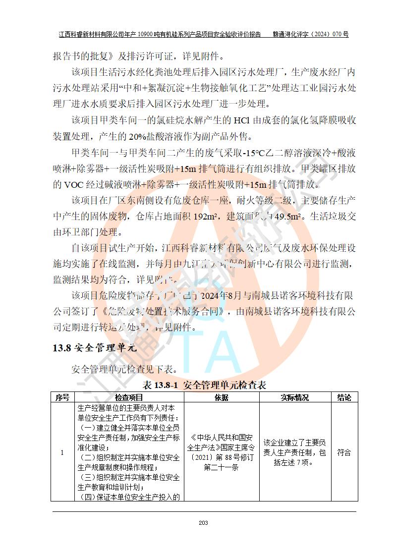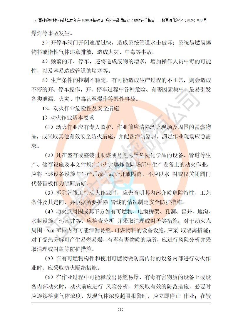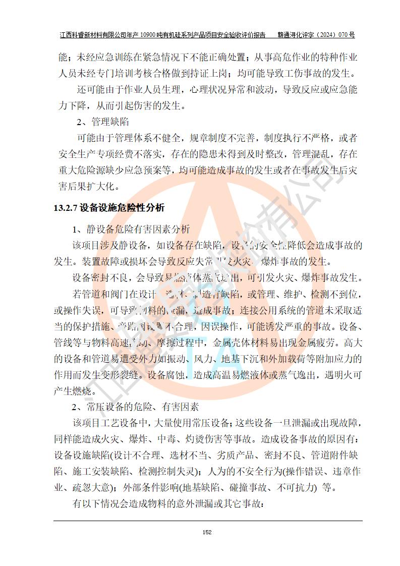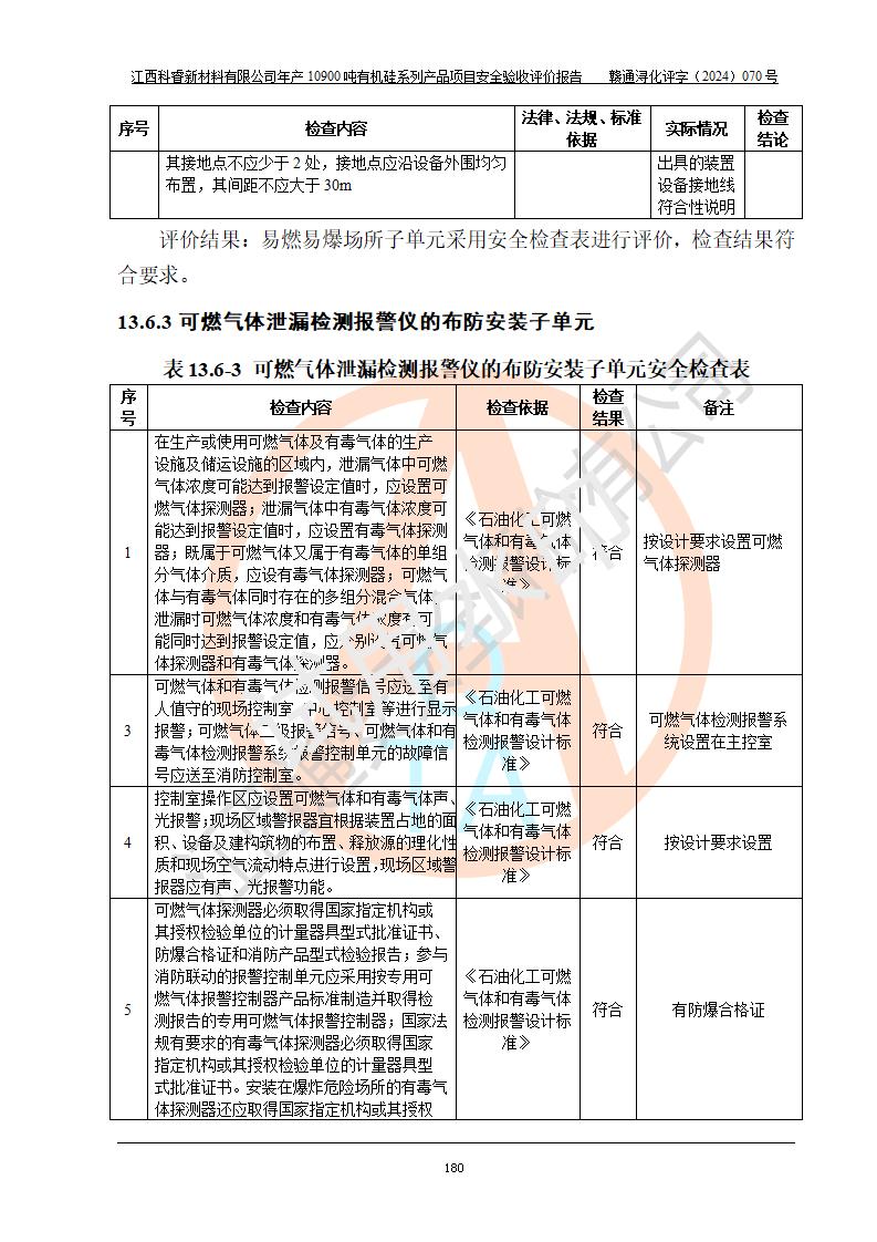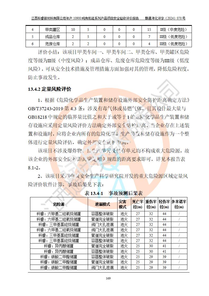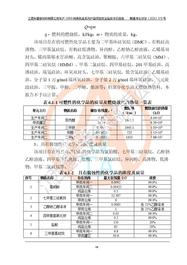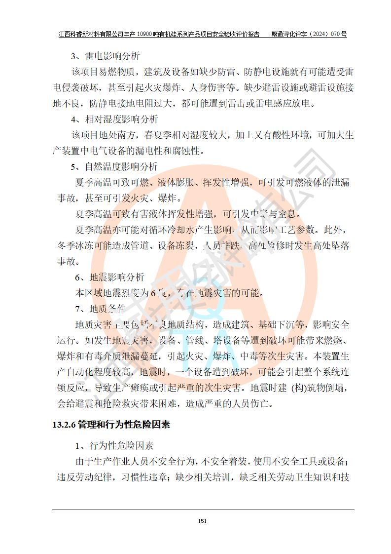 評價結(jié)論 | 經(jīng)評價組評價,江西科睿新材料有限公司年產(chǎn)12900噸日化硅油等有機硅系列產(chǎn)品項目(一期:年產(chǎn)10900噸日化硅油等有機硅系列)總平面布置、選擇的工藝、現(xiàn)場設(shè)備布置情況與安全設(shè)施設(shè)計一致,該項目尾氣中的甲醇、二甲醚(不涉及儲存)屬于重點監(jiān)管的危險化學品,不涉及重點監(jiān)管的危險工藝、重大危險源,已按設(shè)計要求設(shè)置有DCS系統(tǒng)、GDS系統(tǒng),符合《江西省應(yīng)急管理廳關(guān)于印發(fā)《江西省化工企業(yè)自動化提升實施方案》(試行)的通知 》,符合《危險化學品生產(chǎn)企業(yè)安全生產(chǎn)許可證實施辦法》、《危險化學品生產(chǎn)建設(shè)項目安全風險防控指南(試行)》規(guī)定竣工驗收的安全條件;企業(yè)主要負責人、安全管理部門負責人均為化學、化工相關(guān)專業(yè),且有3年以上化工行業(yè)從業(yè)經(jīng)歷,配備有化工類注冊安全工程師,企業(yè)主要負責人及安全管理人員已取得危險化學品企業(yè)主要負責人及安全管理人員考核合格證。 項目運行后存在的主要危險、有害因素有:火災(zāi)、其他爆炸、中毒與窒息等;存在的主要有害因素有化學物質(zhì)危害、高溫等;針對存在的危險、有害因素,企業(yè)采取了**的安全技術(shù)措施及安全管理措施,符合**有關(guān)法規(guī)、標準、規(guī)范要求;項目風險可控,其安全生產(chǎn)條件和安全管理方面具備竣工安全驗收的條件。 | |||||