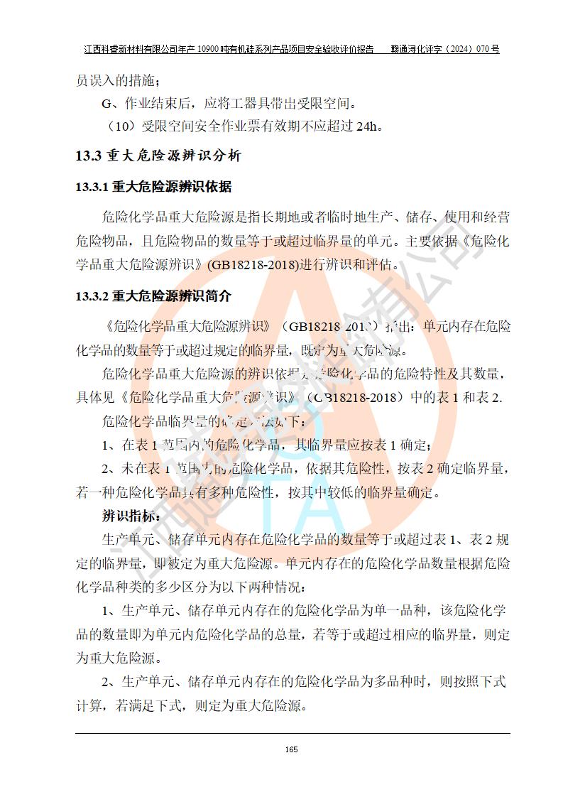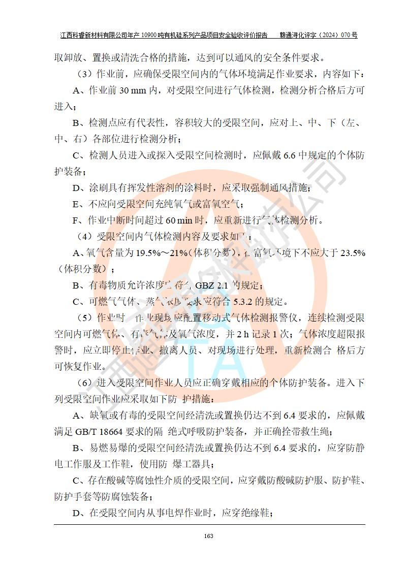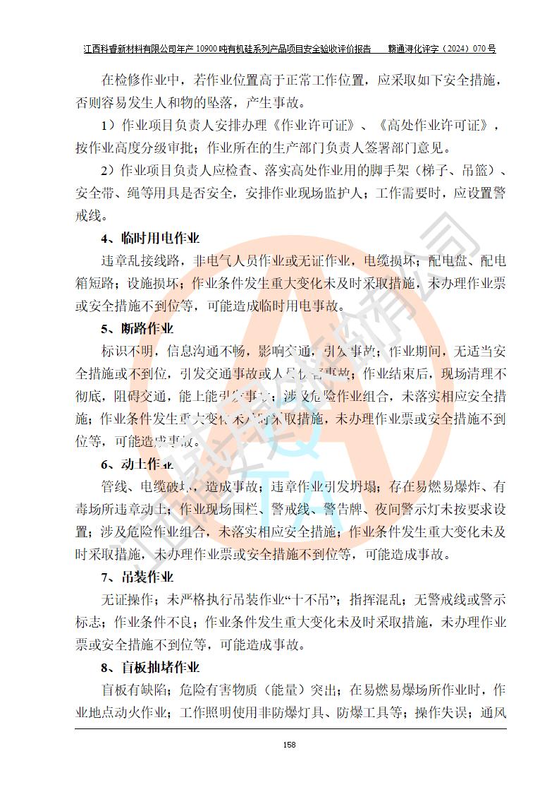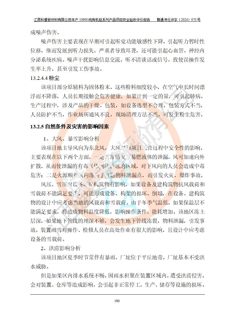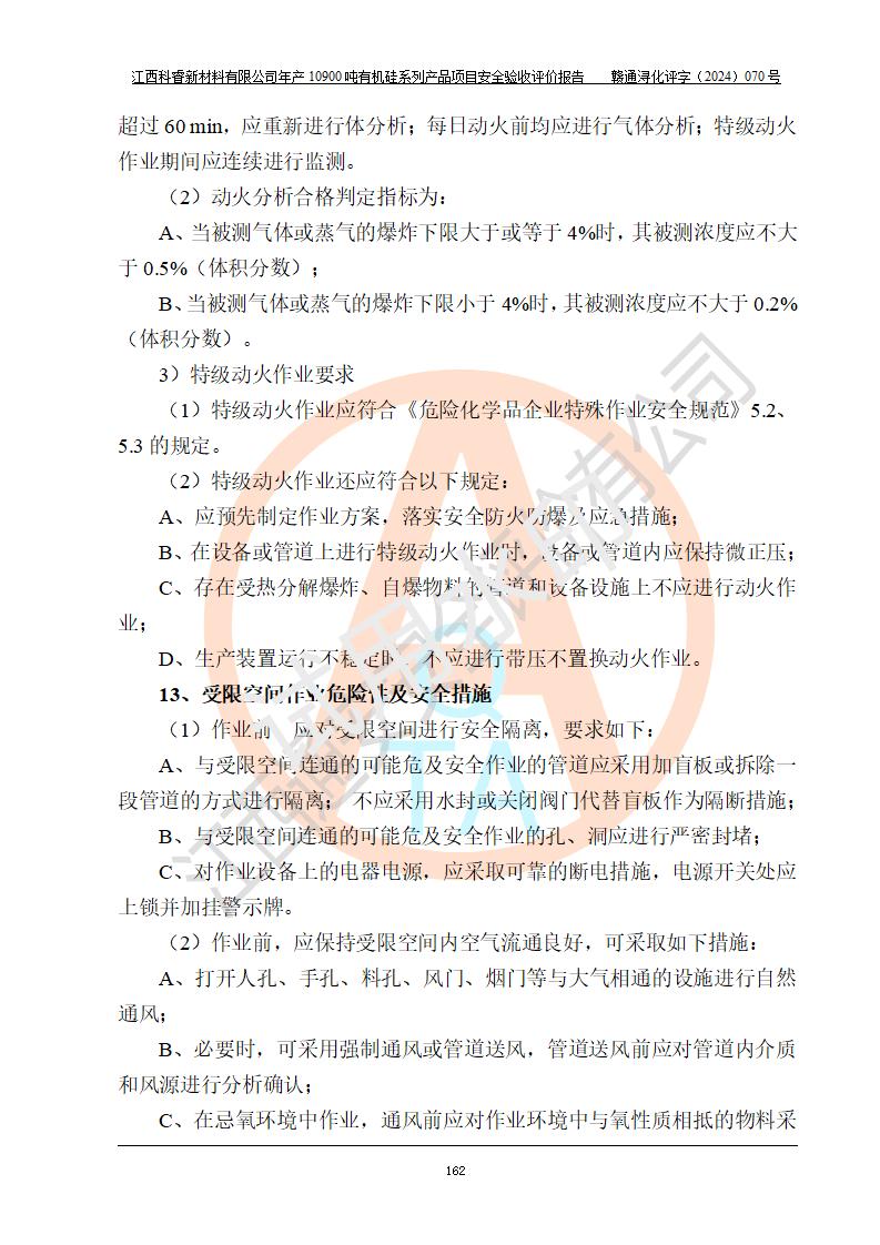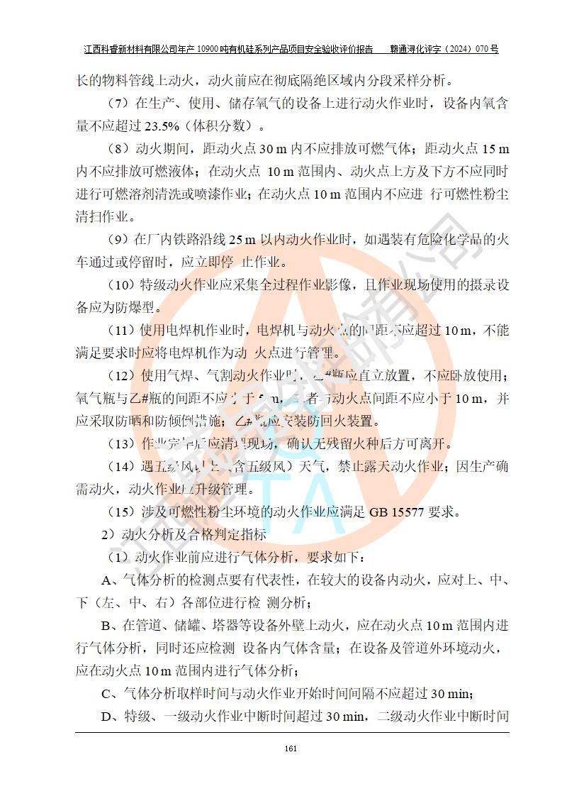 評價結(jié)論 | 經(jīng)評價組評價,江西科睿新材料有限公司年產(chǎn)12900噸日化硅油等有機硅系列產(chǎn)品項目(一期:年產(chǎn)10900噸日化硅油等有機硅系列)總平面布置、選擇的工藝、現(xiàn)場設(shè)備布置情況與安全設(shè)施設(shè)計一致,該項目尾氣中的甲醇、二甲醚(不涉及儲存)屬于重點監(jiān)管的危險化學品,不涉及重點監(jiān)管的危險工藝、重大危險源,已按設(shè)計要求設(shè)置有DCS系統(tǒng)、GDS系統(tǒng),符合《江西省應(yīng)急管理廳關(guān)于印發(fā)《江西省化工企業(yè)自動化提升實施方案》(試行)的通知 》,符合《危險化學品生產(chǎn)企業(yè)安全生產(chǎn)許可證實施辦法》、《危險化學品生產(chǎn)建設(shè)項目安全風險防控指南(試行)》規(guī)定竣工驗收的安全條件;企業(yè)主要負責人、安全管理部門負責人均為化學、化工相關(guān)專業(yè),且有3年以上化工行業(yè)從業(yè)經(jīng)歷,配備有化工類注冊安全工程師,企業(yè)主要負責人及安全管理人員已取得危險化學品企業(yè)主要負責人及安全管理人員考核合格證。 項目運行后存在的主要危險、有害因素有:火災(zāi)、其他爆炸、中毒與窒息等;存在的主要有害因素有化學物質(zhì)危害、高溫等;針對存在的危險、有害因素,企業(yè)采取了**的安全技術(shù)措施及安全管理措施,符合**有關(guān)法規(guī)、標準、規(guī)范要求;項目風險可控,其安全生產(chǎn)條件和安全管理方面具備竣工安全驗收的條件。 | |||||
