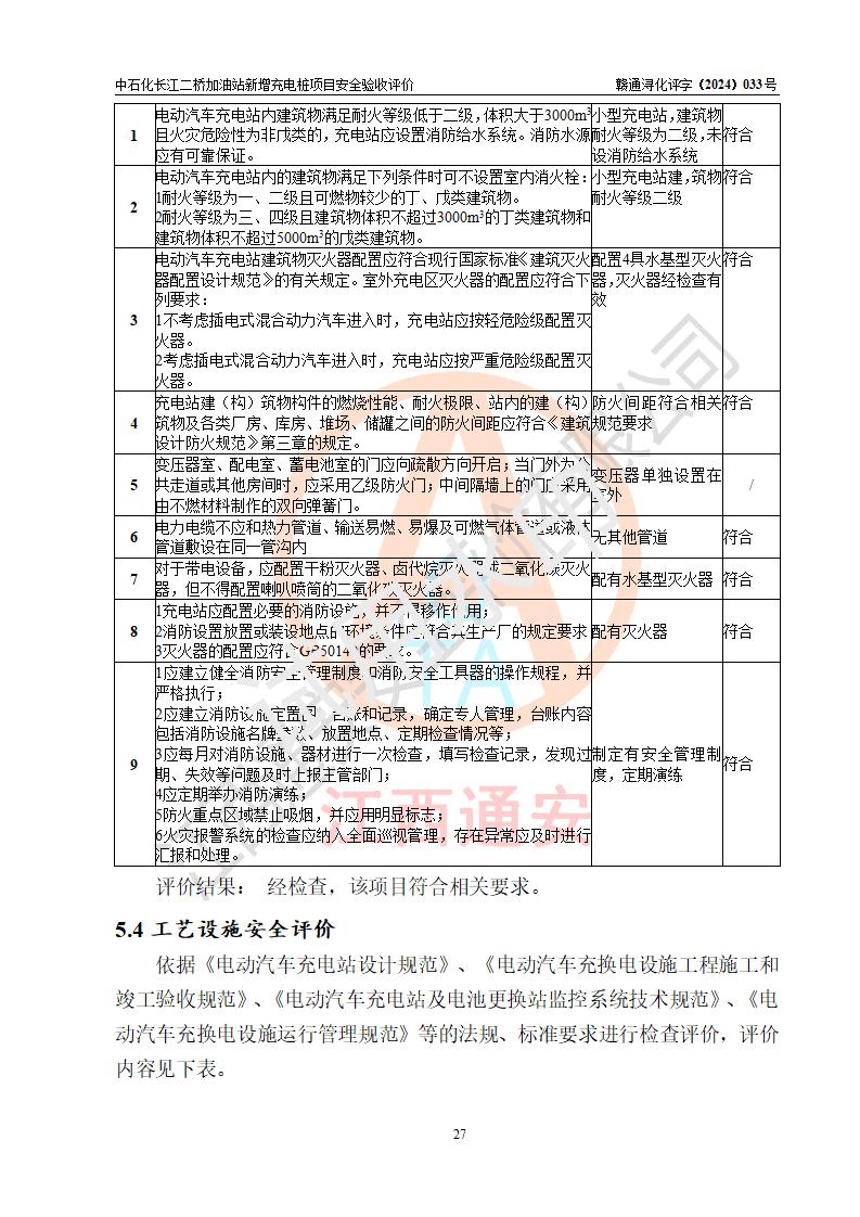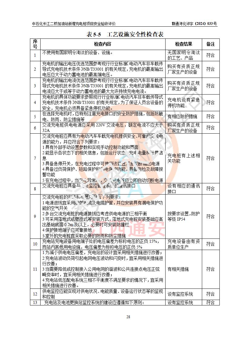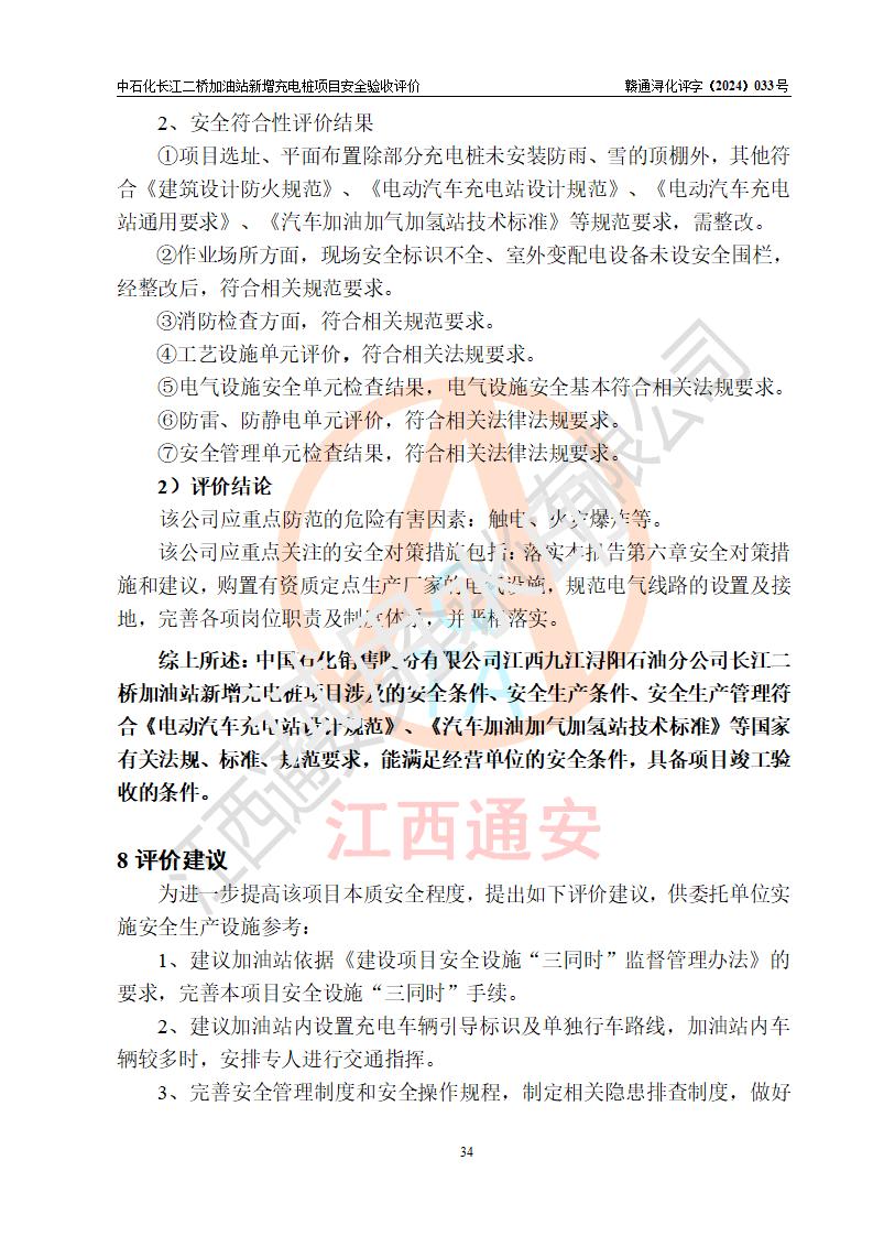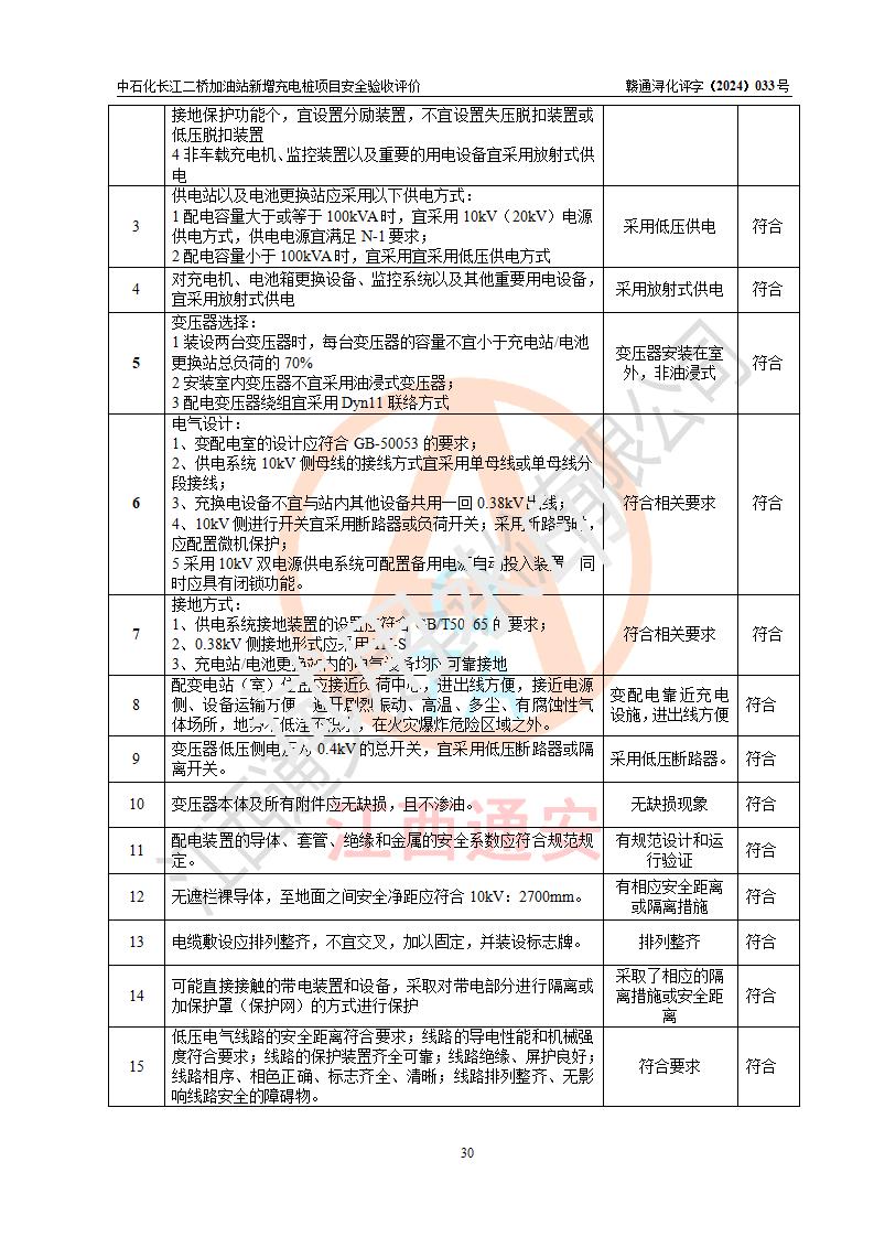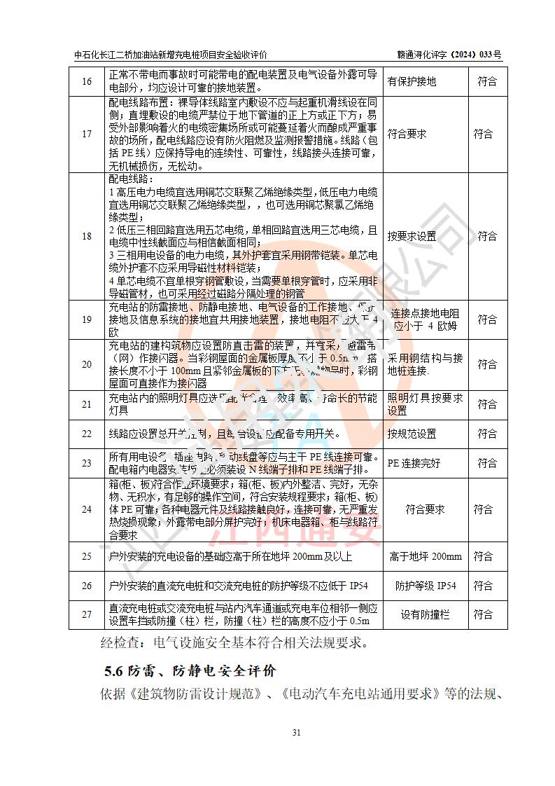 評價結論 | 中國石化銷售股份有限公司江西九江潯陽石油分公司長江二橋加油站新增充電樁項目涉及的安全條件、安全生產(chǎn)條件、安全生產(chǎn)管理符合《電動汽車充電站設計規(guī)范》、《汽車加油加氣加氫站技術標準》等**有關法規(guī)、標準、規(guī)范要求,能滿足經(jīng)營單位的安全條件,具備項目竣工驗收的條件。 | |||