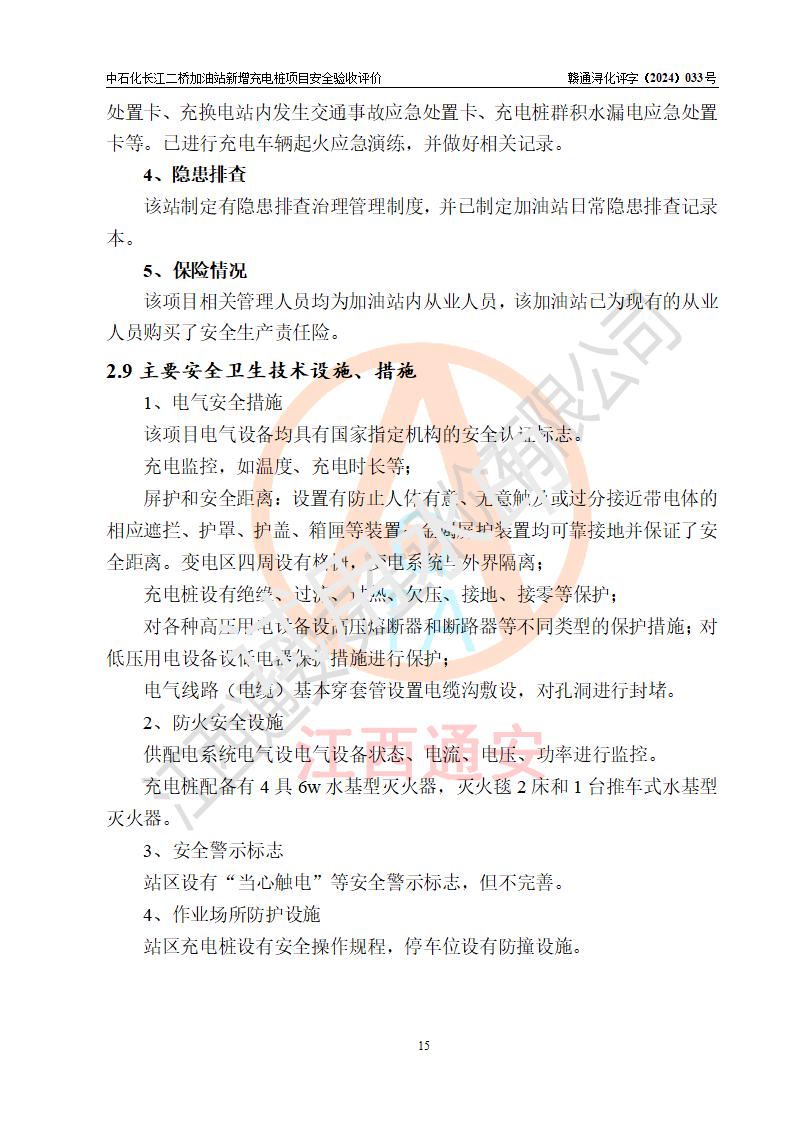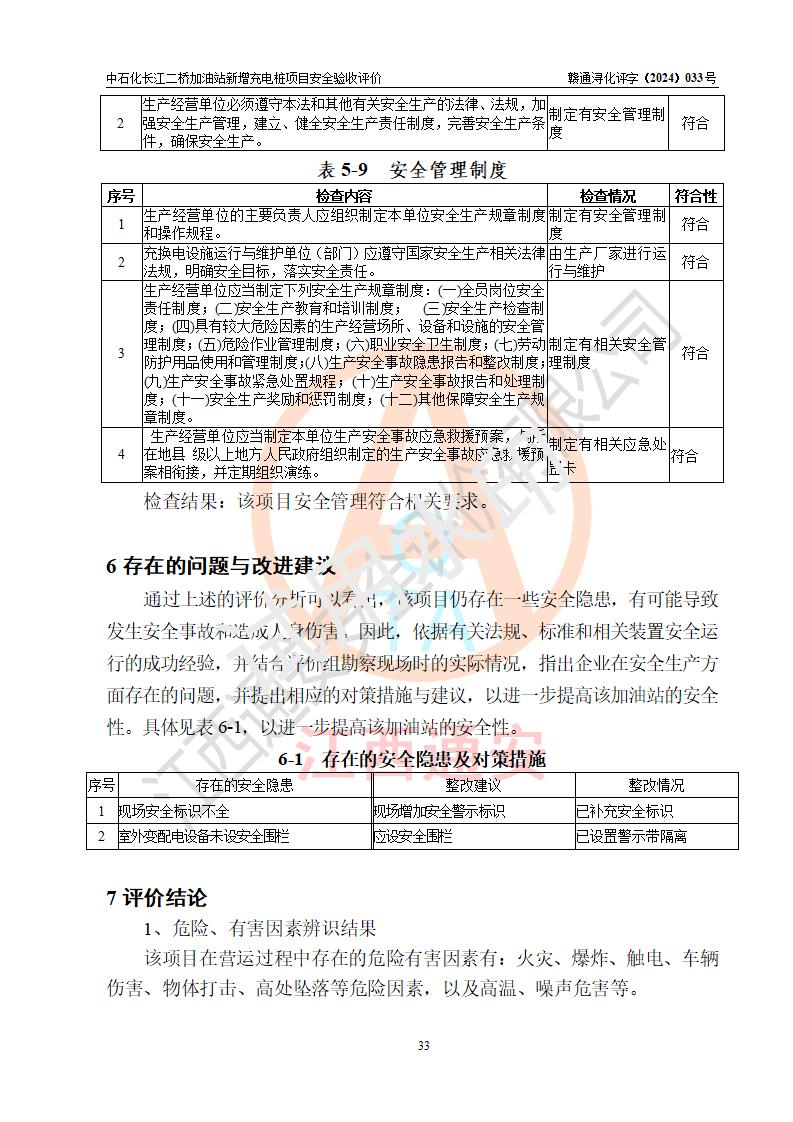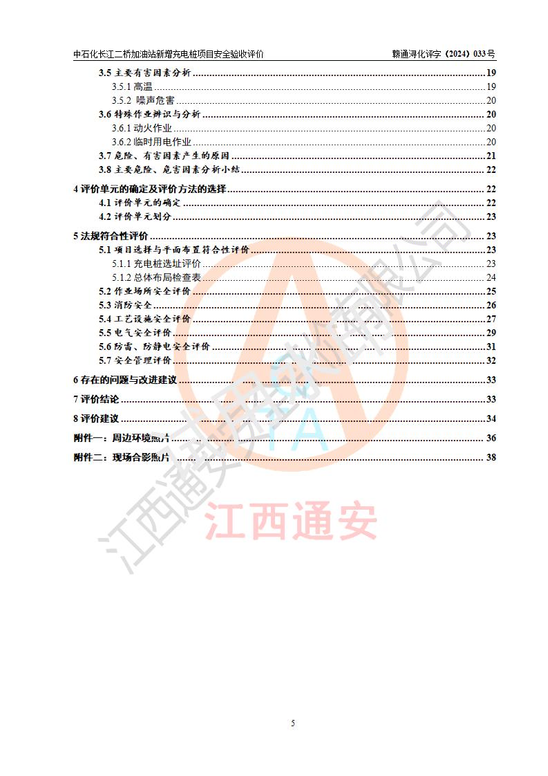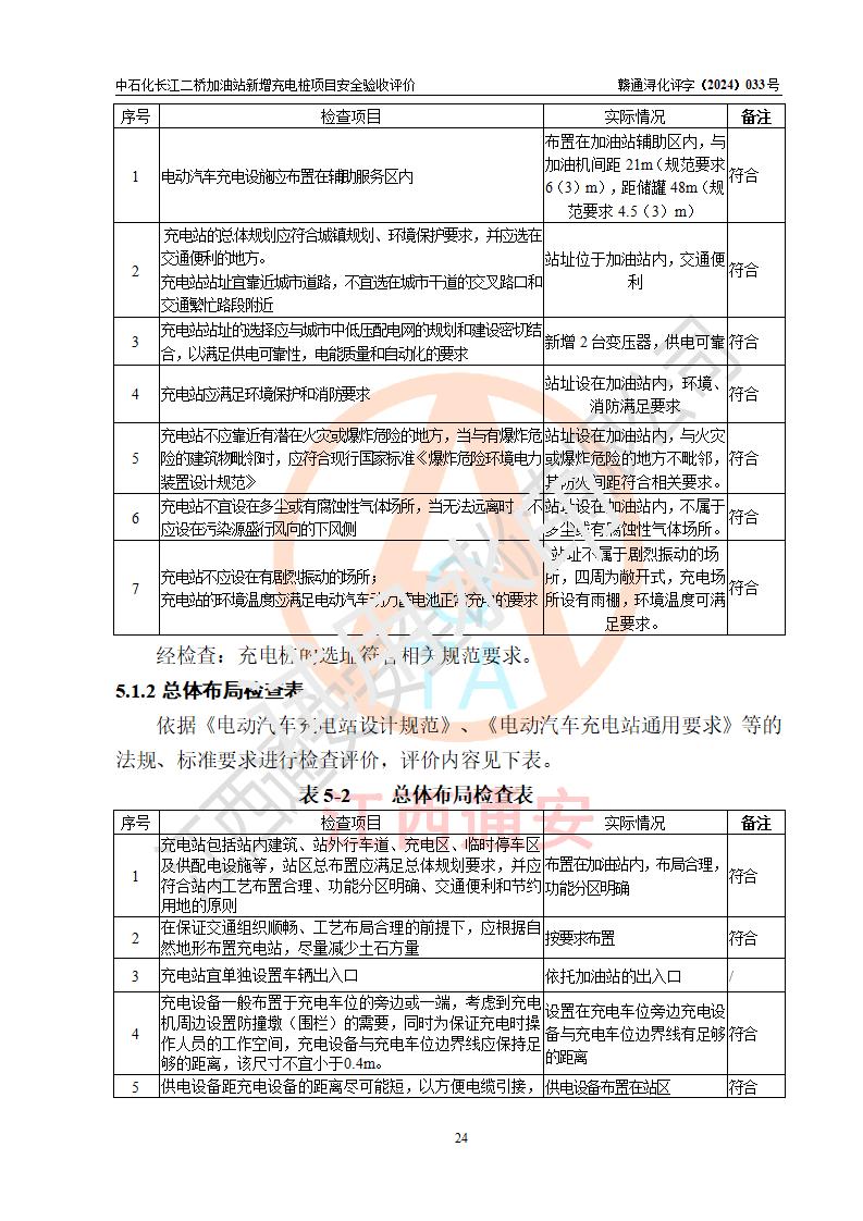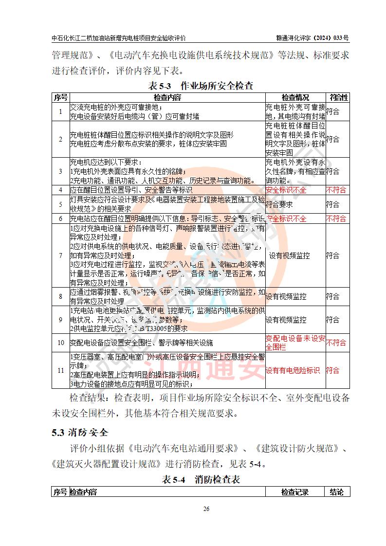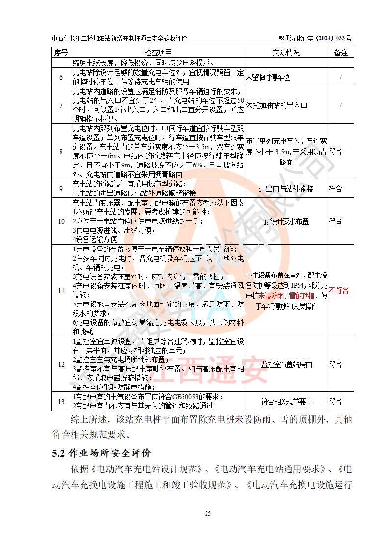 評價結論 | 中國石化銷售股份有限公司江西九江潯陽石油分公司長江二橋加油站新增充電樁項目涉及的安全條件、安全生產(chǎn)條件、安全生產(chǎn)管理符合《電動汽車充電站設計規(guī)范》、《汽車加油加氣加氫站技術標準》等**有關法規(guī)、標準、規(guī)范要求,能滿足經(jīng)營單位的安全條件,具備項目竣工驗收的條件。 | |||