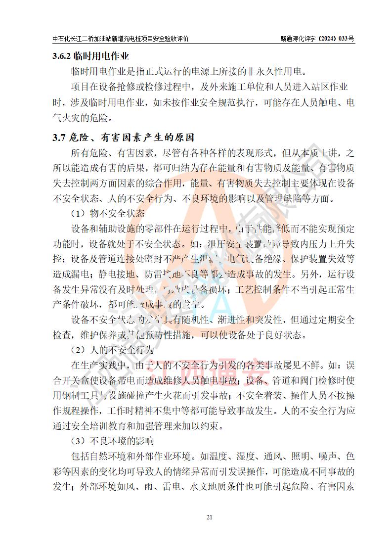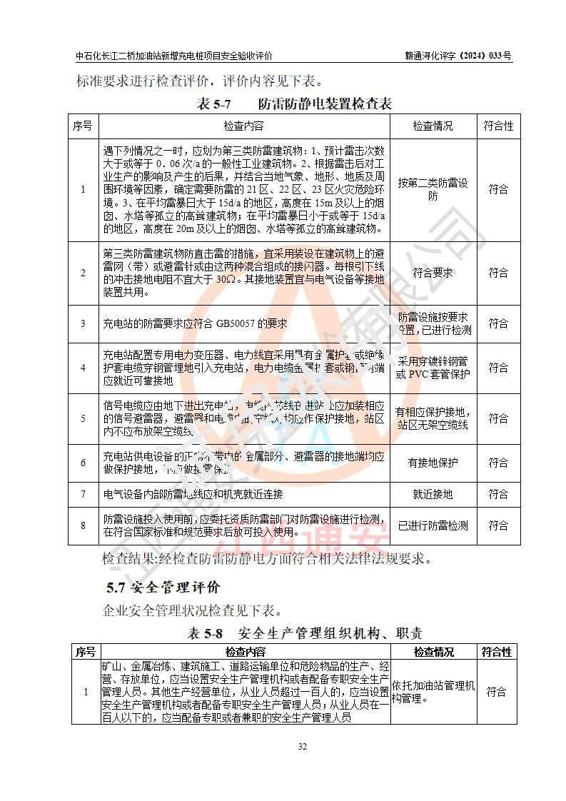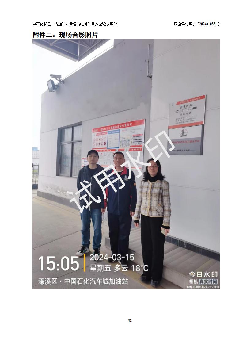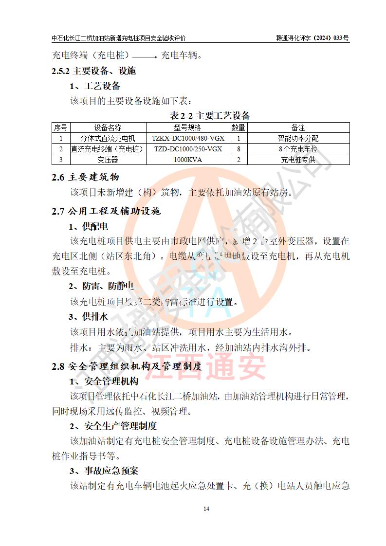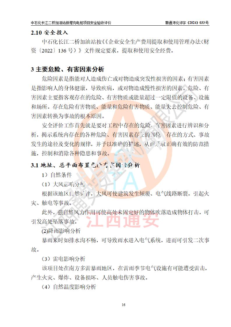 評價結論 | 中國石化銷售股份有限公司江西九江潯陽石油分公司長江二橋加油站新增充電樁項目涉及的安全條件、安全生產(chǎn)條件、安全生產(chǎn)管理符合《電動汽車充電站設計規(guī)范》、《汽車加油加氣加氫站技術標準》等**有關法規(guī)、標準、規(guī)范要求,能滿足經(jīng)營單位的安全條件,具備項目竣工驗收的條件。 | |||