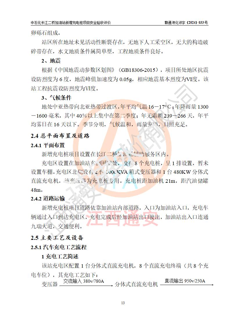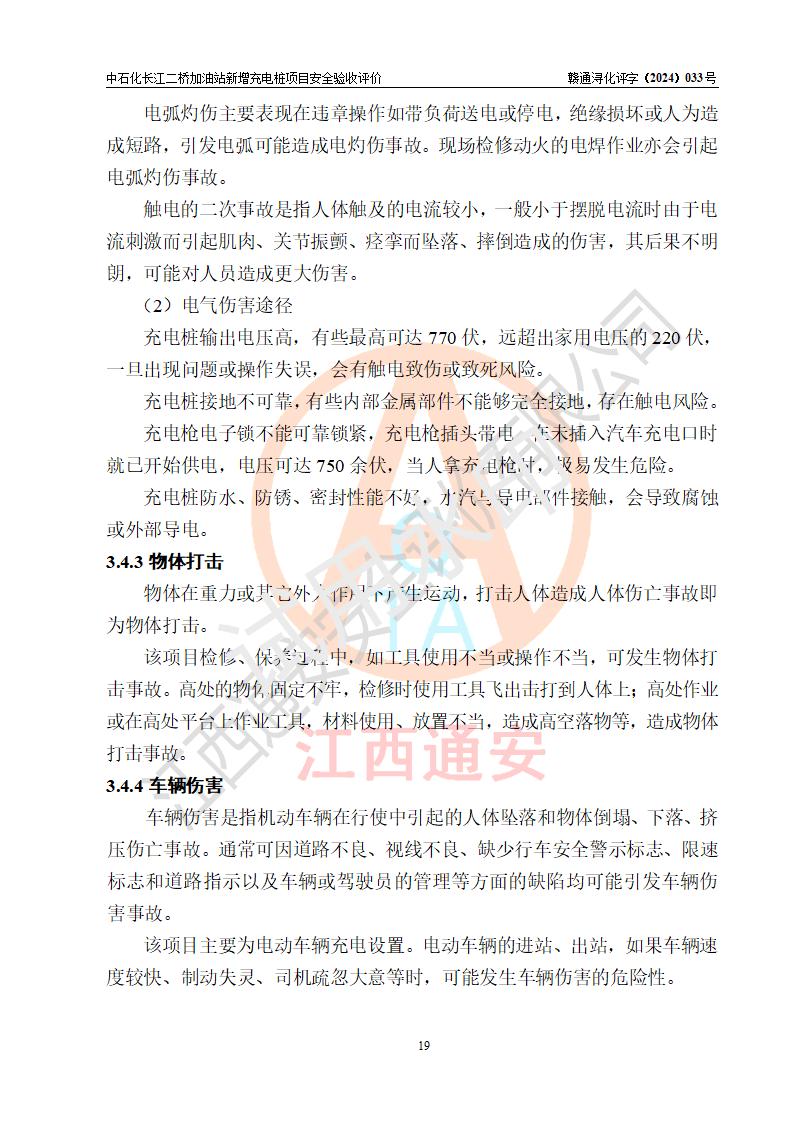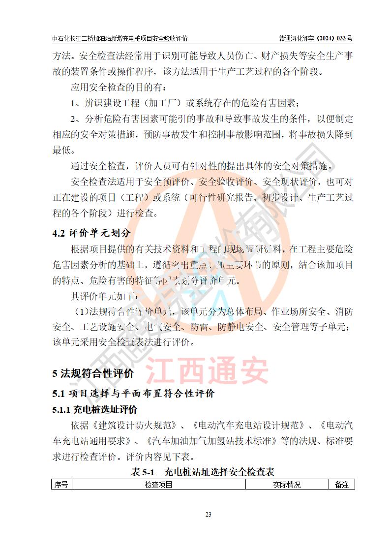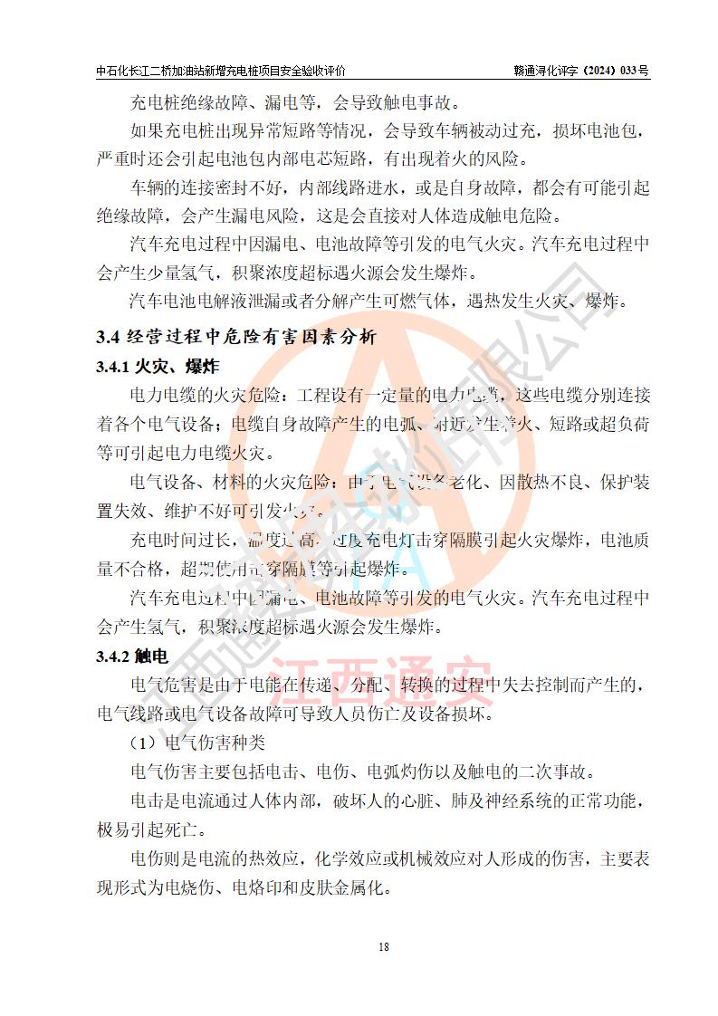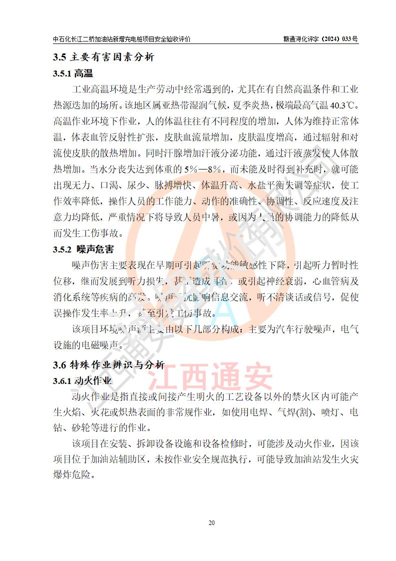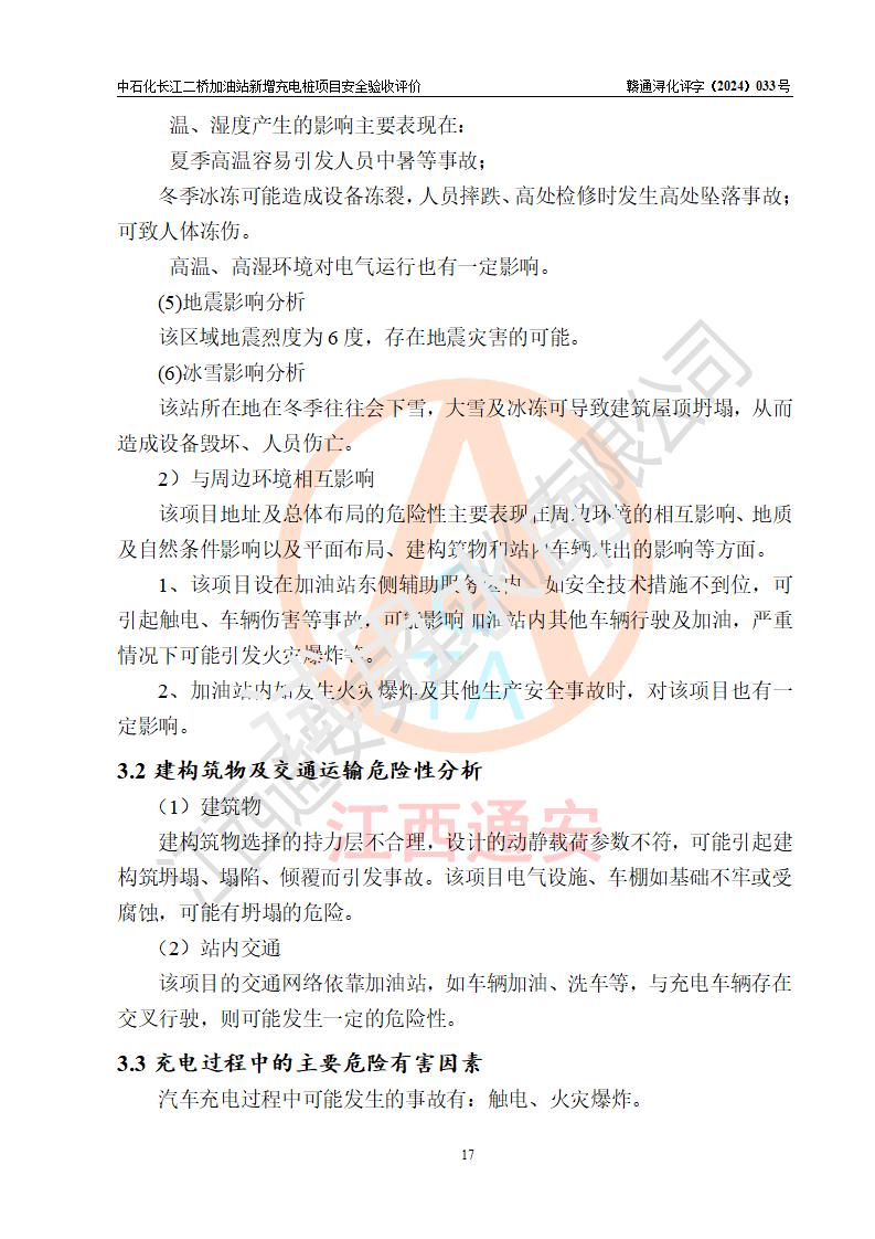 評價結論 | 中國石化銷售股份有限公司江西九江潯陽石油分公司長江二橋加油站新增充電樁項目涉及的安全條件、安全生產(chǎn)條件、安全生產(chǎn)管理符合《電動汽車充電站設計規(guī)范》、《汽車加油加氣加氫站技術標準》等**有關法規(guī)、標準、規(guī)范要求,能滿足經(jīng)營單位的安全條件,具備項目竣工驗收的條件。 | |||