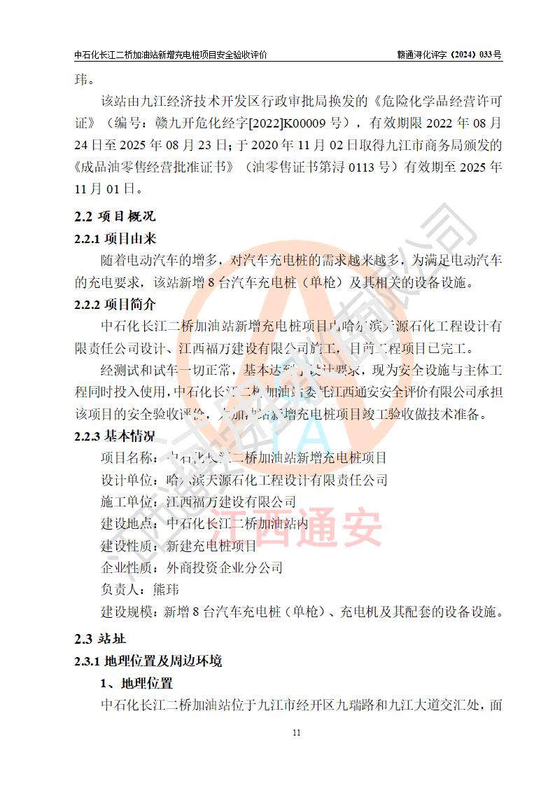 項目簡介 | 中國石化銷售股份有限公司江西九江潯陽石油分公司長江二橋加油站是一家專門從事成品油零售經(jīng)營的有限公司分公司(外商投資企業(yè)分公司),經(jīng)營場所位于江西省九江市經(jīng)開區(qū)九瑞路和九江大道交匯處?,F(xiàn)有從業(yè)人員4名,其中安全管理人員1人,加油站負責人熊瑋。 該站由九江經(jīng)濟技術開發(fā)區(qū)行政審批局換發(fā)的《危險化學品經(jīng)營許可證》(編號:贛九開危化經(jīng)字[2022]K00009號),**期限2022年08月24日至2025年08月23日;于2020年11月02日取得九江市商務局頒發(fā)的《成品油零售經(jīng)營批準證書》(油零售證書第潯0113號)**期至2025年11月01日。 隨著電動汽車的增多,對汽車充電樁的需求越來越多,為滿足電動汽車的充電要求,該站新增8臺汽車充電樁(單槍)及其相關的設備設施。 | |||