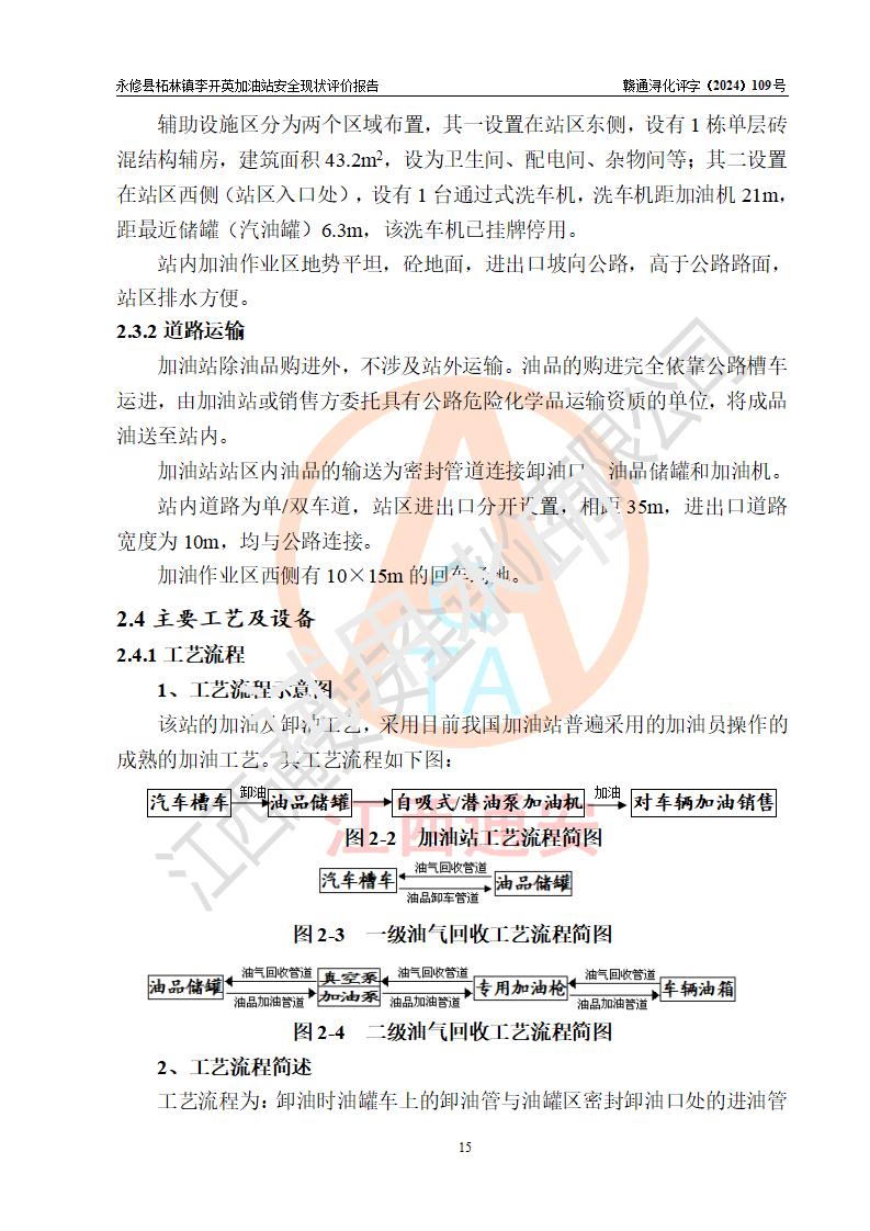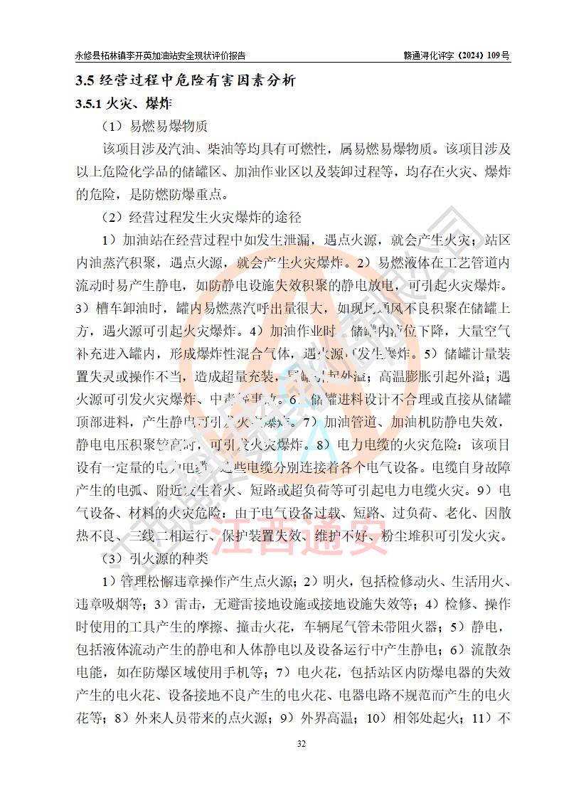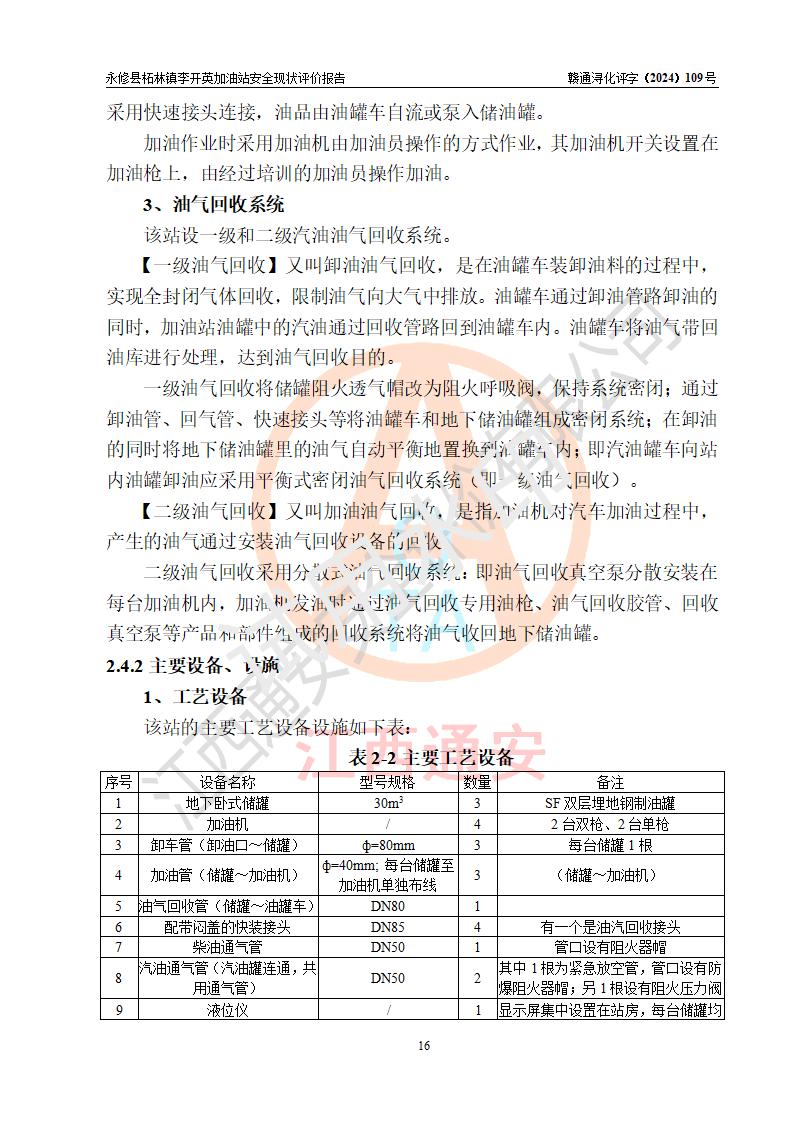 項目簡介 | 永修縣柘林鎮(zhèn)李開英加油站是一家專門從事成品油零售經營的個體工商戶,經營場所位于江西省九江市永修縣柘林鎮(zhèn)聯(lián)豐村。現有從業(yè)人員6名,其中安全管理人員1人,加油站負責人李開英。 該加油站占地面積約1300m2,站區(qū)內設置有2臺雙槍和2臺單槍程控燃油加油機及配套的工藝管線,設有SF雙層儲罐3臺,其中30m3的92#汽油儲罐1臺、30m3的95#汽油儲罐1臺、30m3的0#柴油儲罐1臺,油品儲罐總容積為90m3(折算成汽油為75m3),按現行《汽車加油加氣加氫站技術標準》對加油站的等級劃分原則,屬三級加油站。 該站由九江市行政審批局換發(fā)《危險化學品經營許可證》(證號:贛九行審經(甲)字[2022]000009號),**期限2022年03月20日至2025年03月19日。 | |||