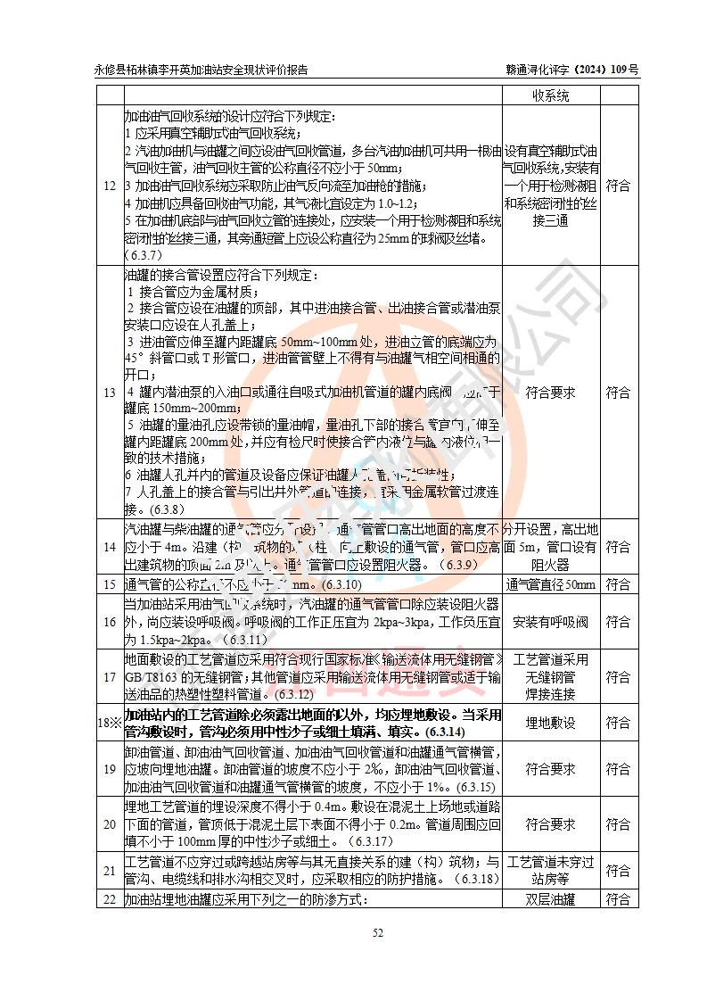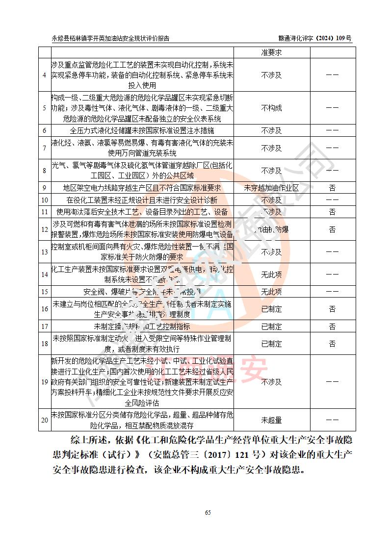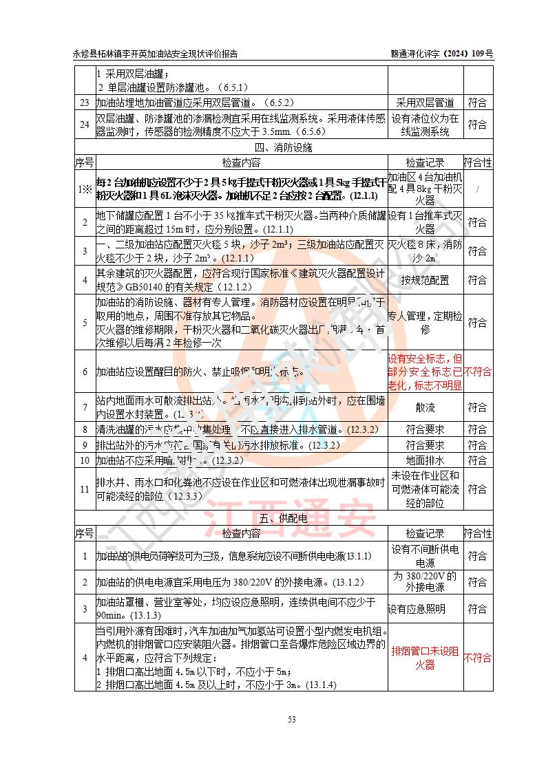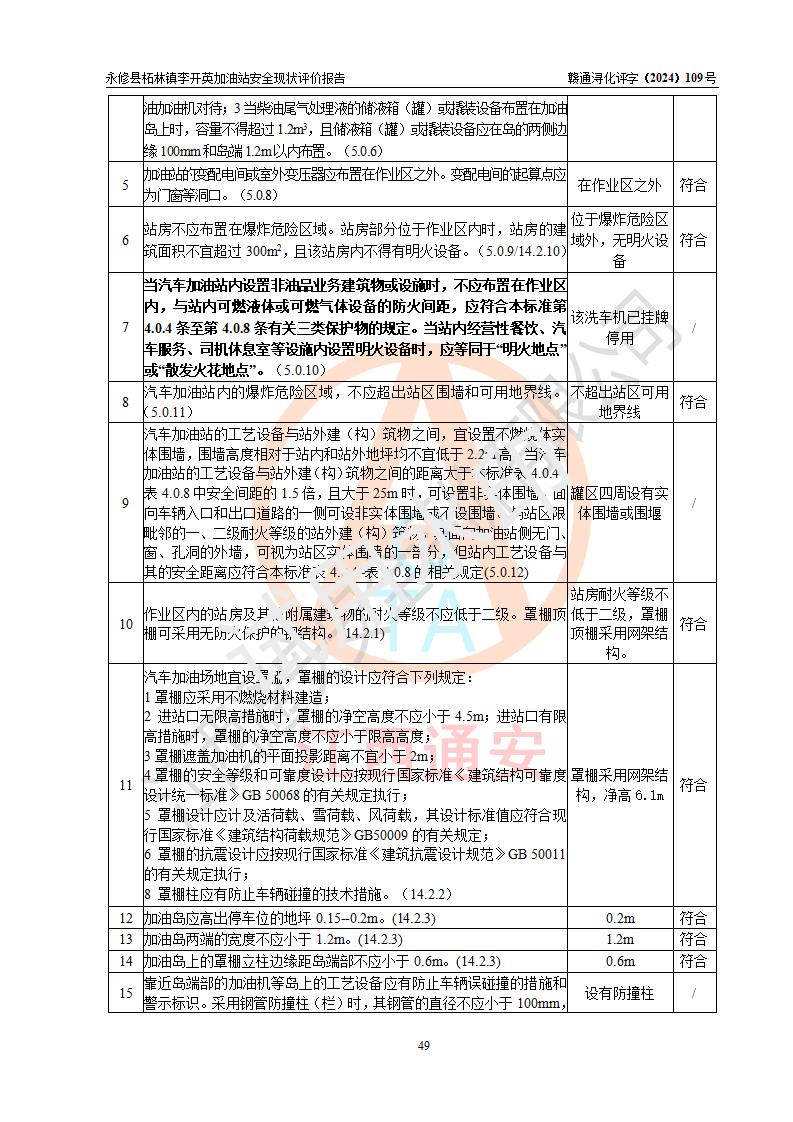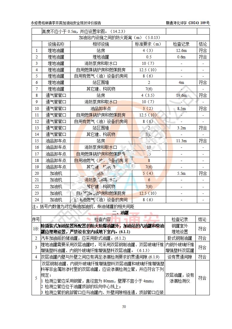 評價結論 | 永修縣柘林鎮(zhèn)李開英加油站涉及的安全條件、安全經營條件、安全生產管理符合《危險化學品經營許可證管理辦法》、《汽車加油加氣加氫站技術標準》等**有關法規(guī)、標準、規(guī)范要求,能滿足危險化學品經營安全條件。 | |||