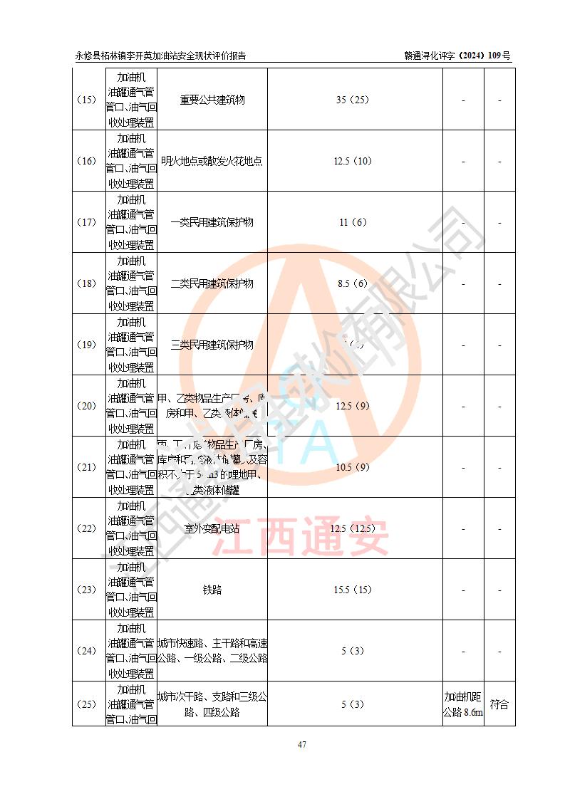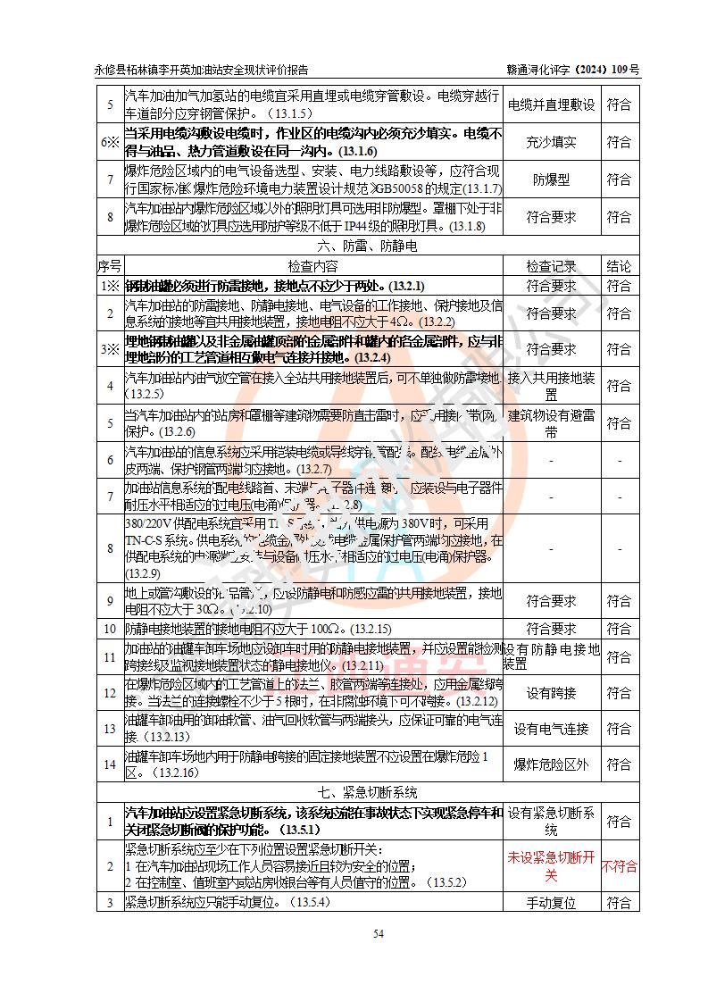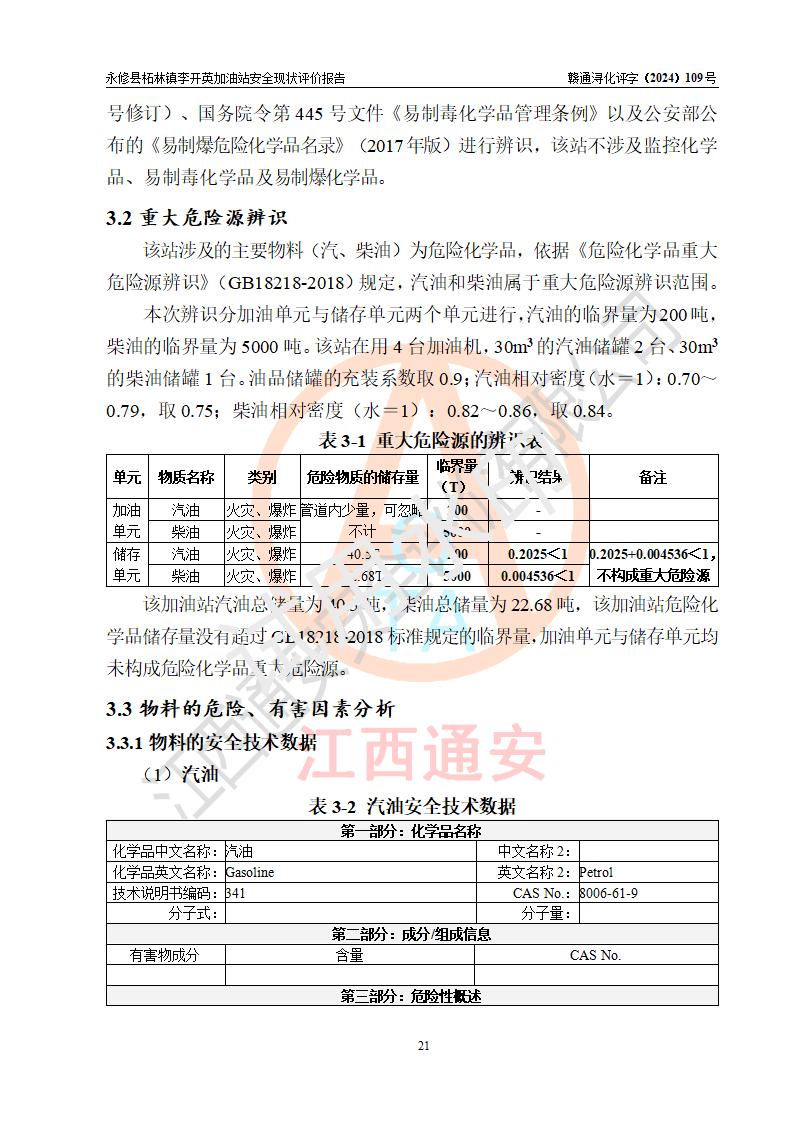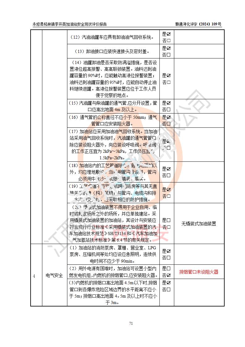 評價結論 | 永修縣柘林鎮(zhèn)李開英加油站涉及的安全條件、安全經營條件、安全生產管理符合《危險化學品經營許可證管理辦法》、《汽車加油加氣加氫站技術標準》等**有關法規(guī)、標準、規(guī)范要求,能滿足危險化學品經營安全條件。 | |||