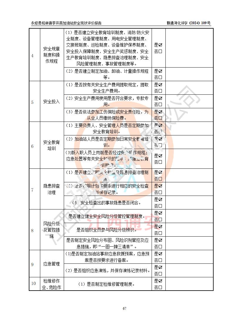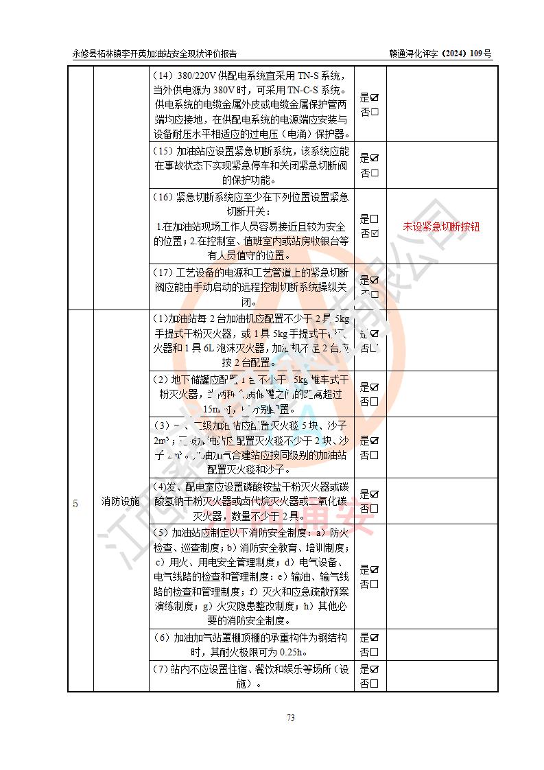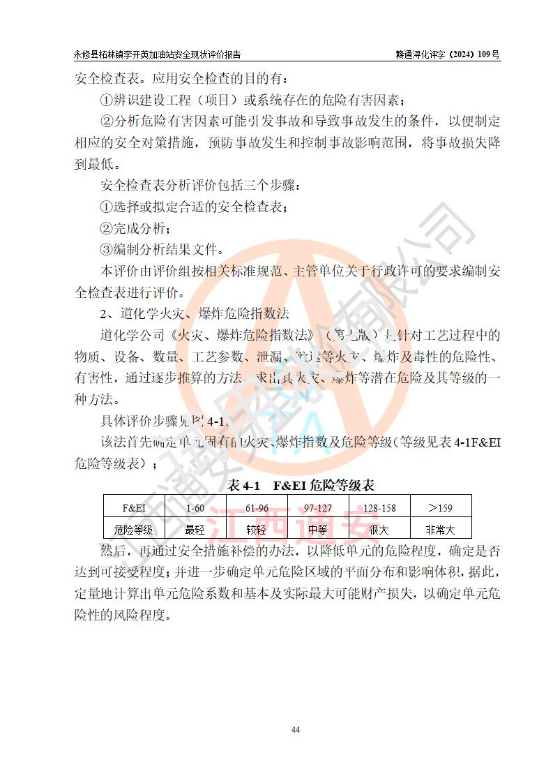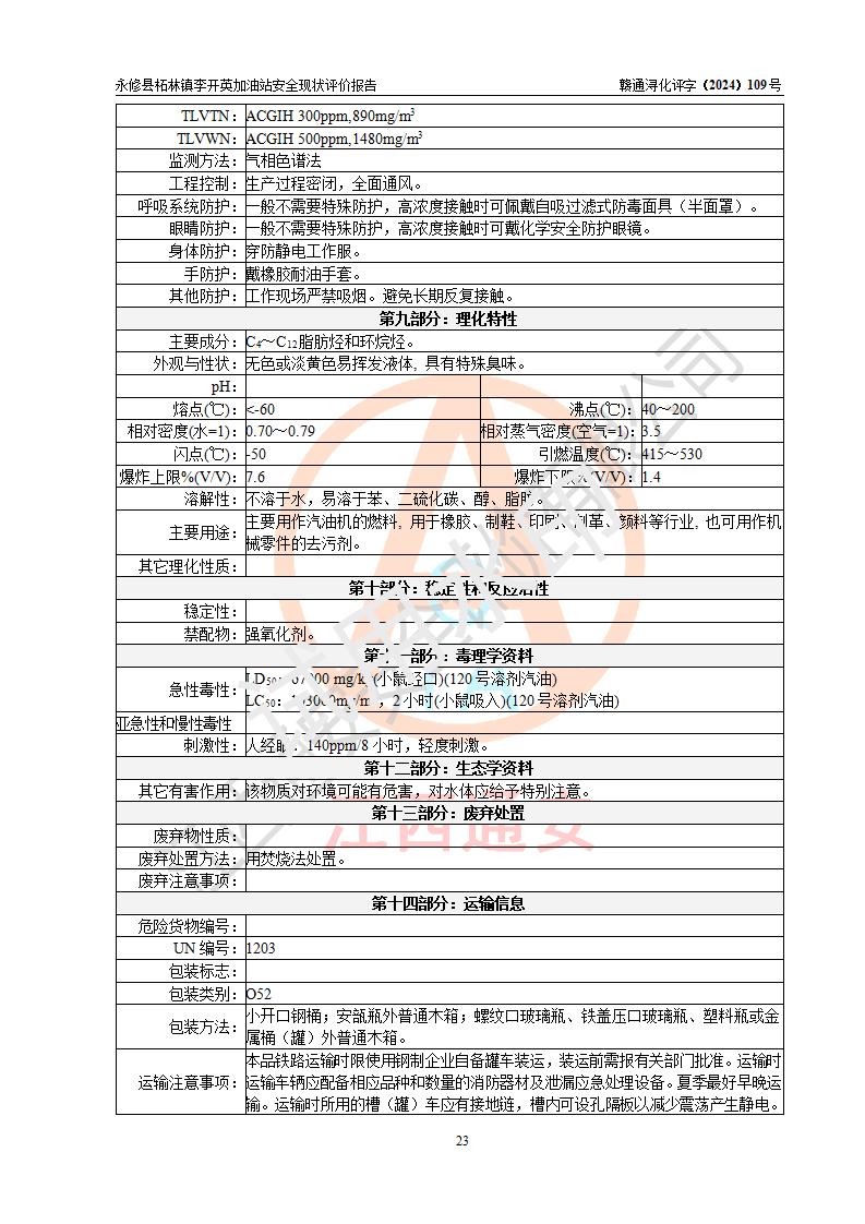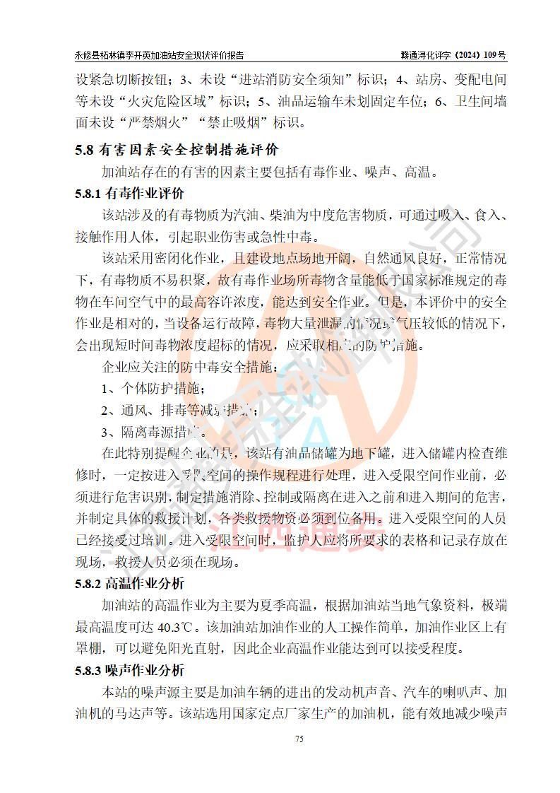 評價結論 | 永修縣柘林鎮(zhèn)李開英加油站涉及的安全條件、安全經營條件、安全生產管理符合《危險化學品經營許可證管理辦法》、《汽車加油加氣加氫站技術標準》等**有關法規(guī)、標準、規(guī)范要求,能滿足危險化學品經營安全條件。 | |||