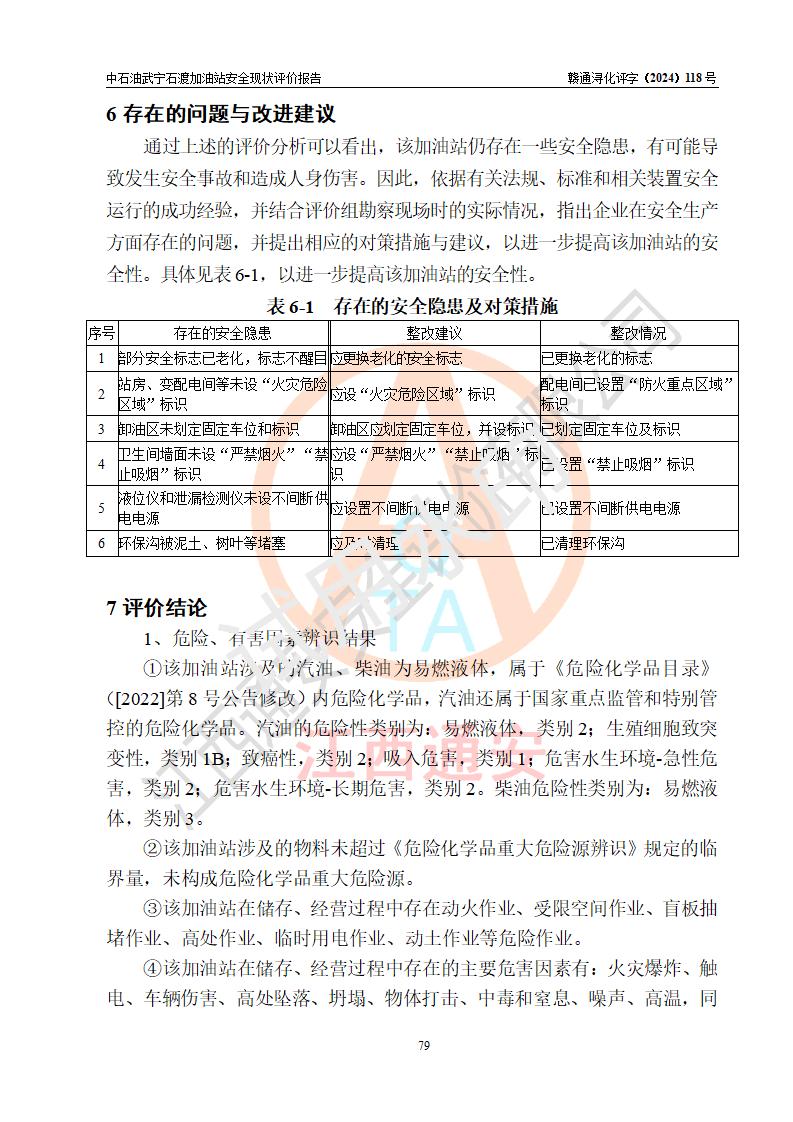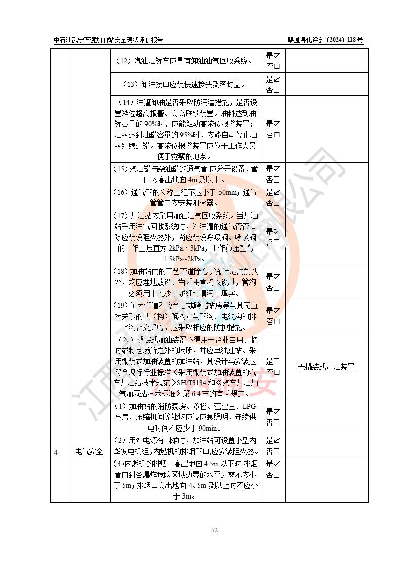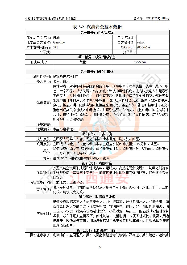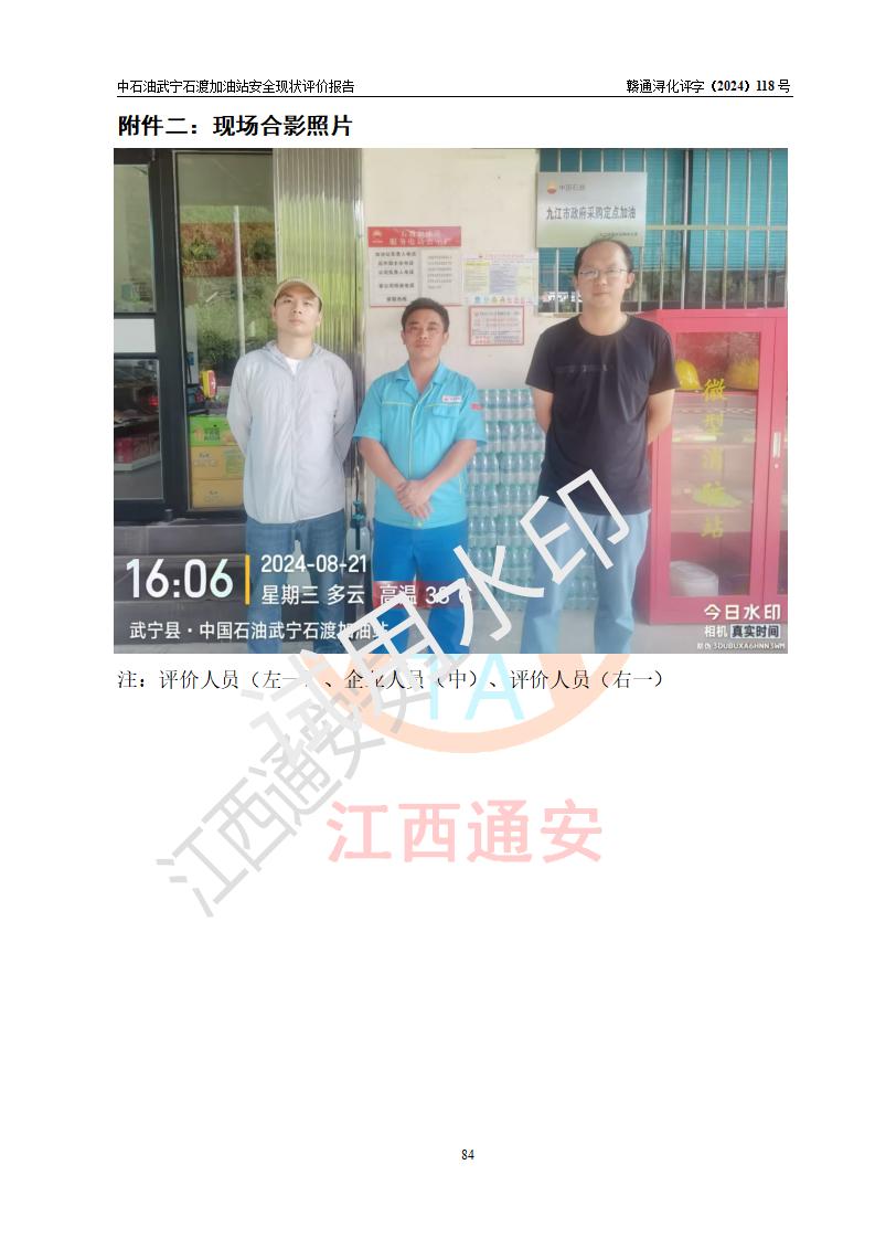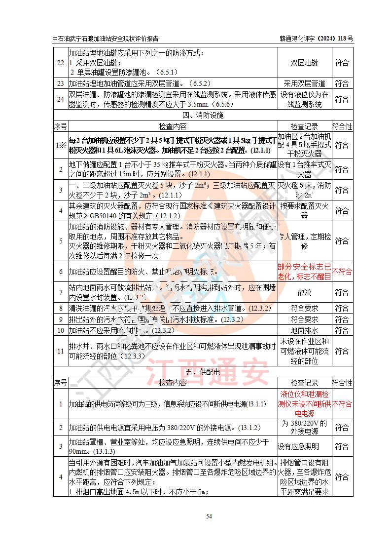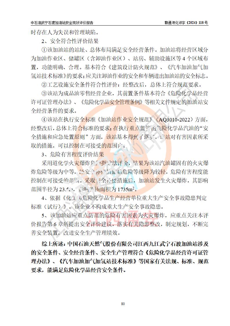 評價結(jié)論 | 中國石油天然氣股份有限公司江西九江武寧石渡加油站涉及的安全條件、安全經(jīng)營條件、安全生產(chǎn)管理符合《危險化學(xué)品經(jīng)營許可證管理辦法》、《汽車加油加氣加氫站技術(shù)標(biāo)準(zhǔn)》等**有關(guān)法規(guī)、標(biāo)準(zhǔn)、規(guī)范要求,能滿足危險化學(xué)品經(jīng)營安全條件。 | |||