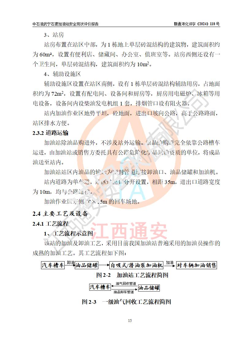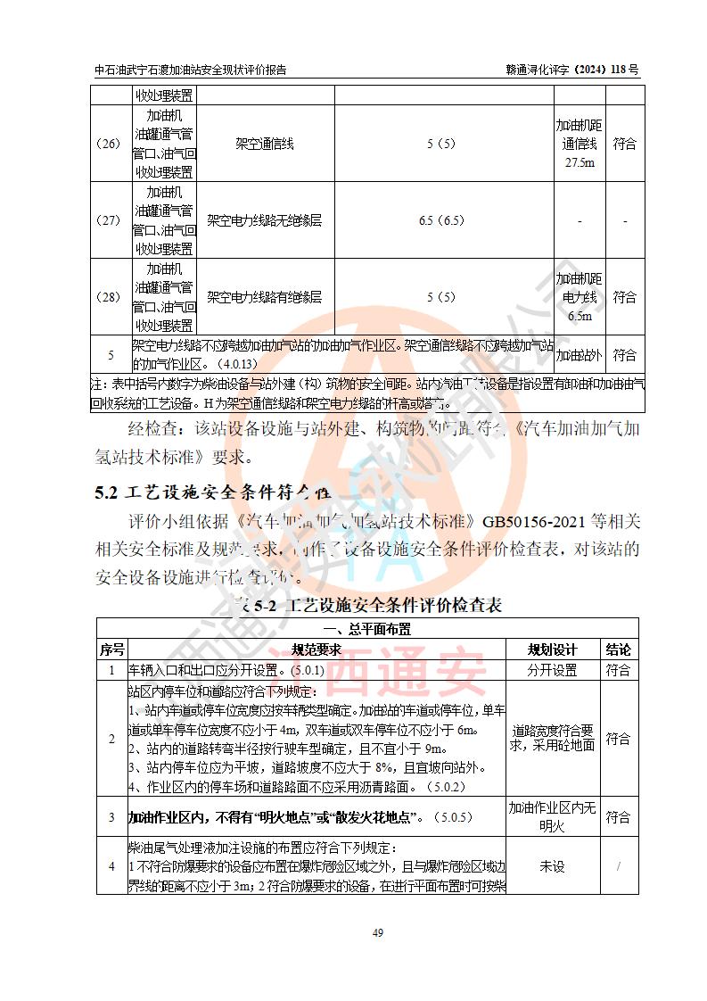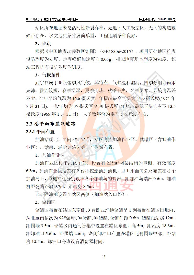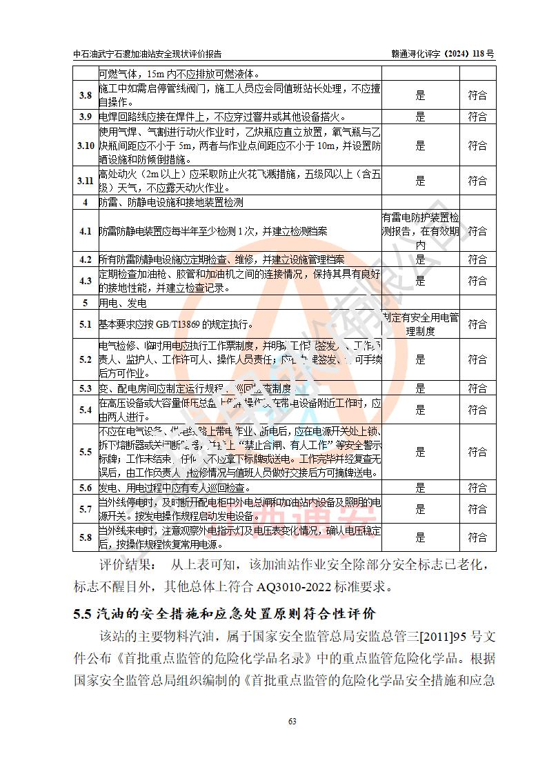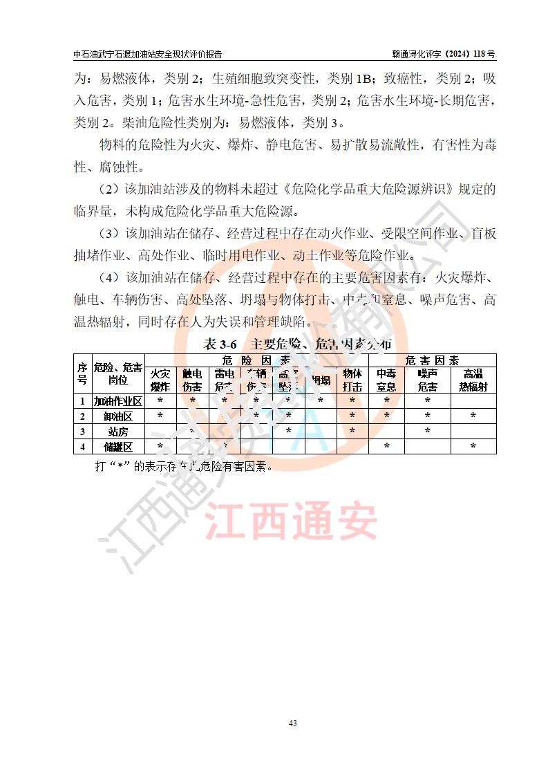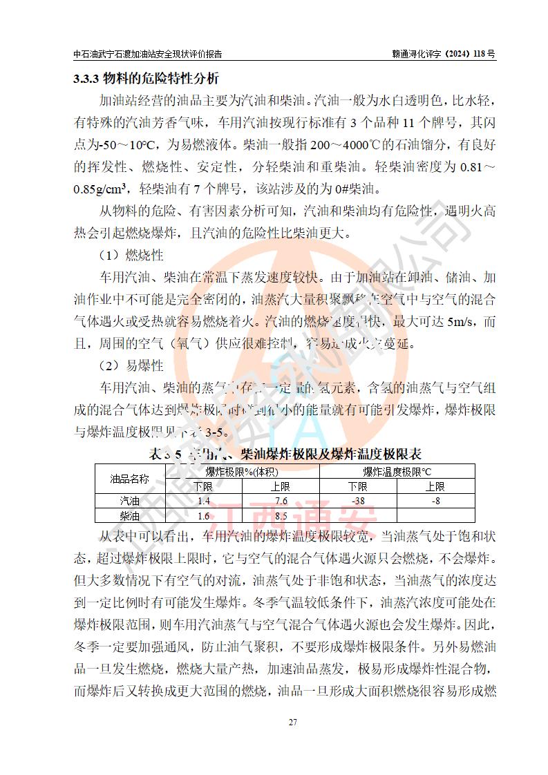 評價結(jié)論 | 中國石油天然氣股份有限公司江西九江武寧石渡加油站涉及的安全條件、安全經(jīng)營條件、安全生產(chǎn)管理符合《危險化學(xué)品經(jīng)營許可證管理辦法》、《汽車加油加氣加氫站技術(shù)標(biāo)準(zhǔn)》等**有關(guān)法規(guī)、標(biāo)準(zhǔn)、規(guī)范要求,能滿足危險化學(xué)品經(jīng)營安全條件。 | |||