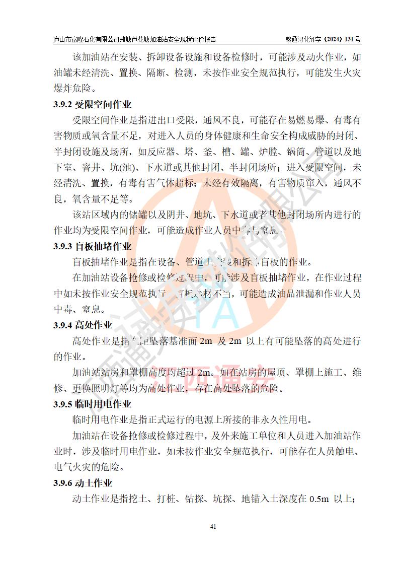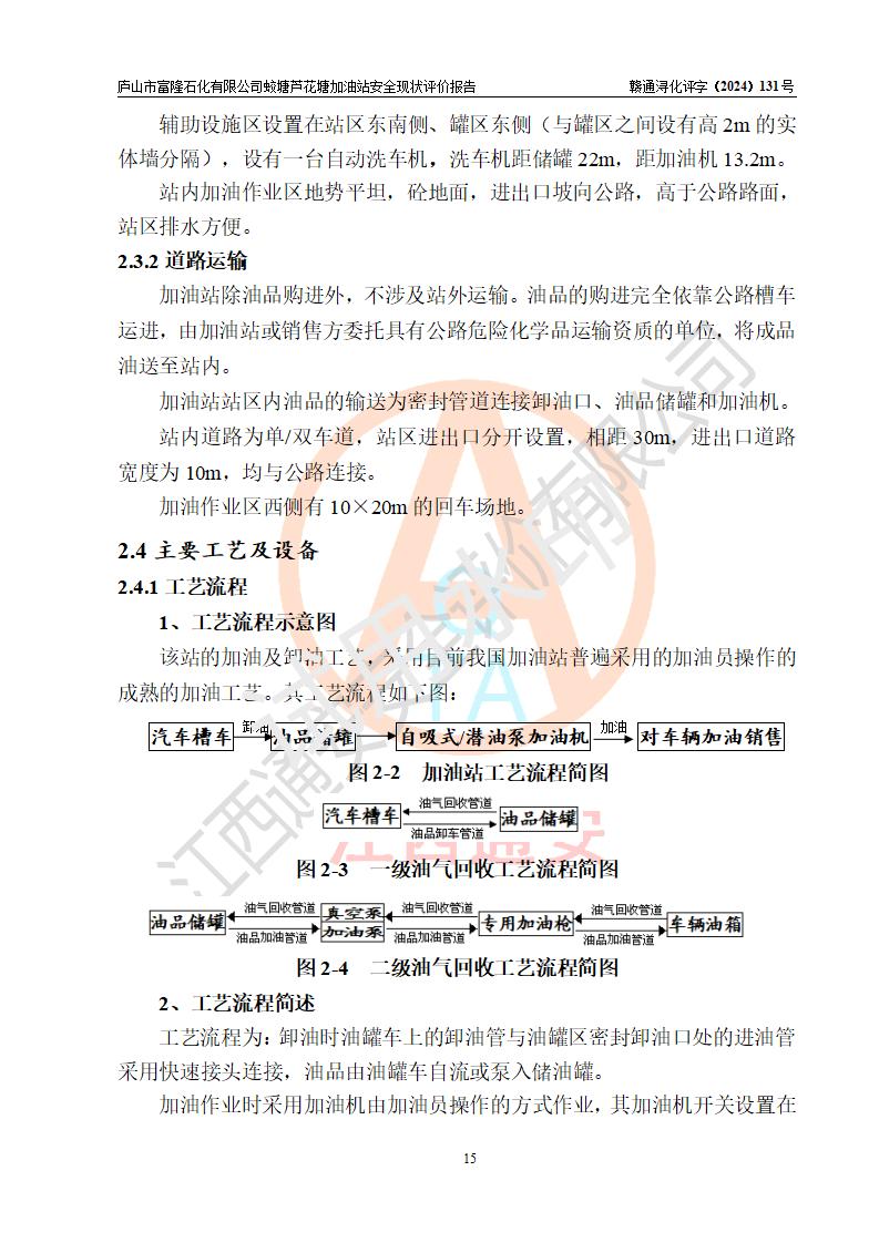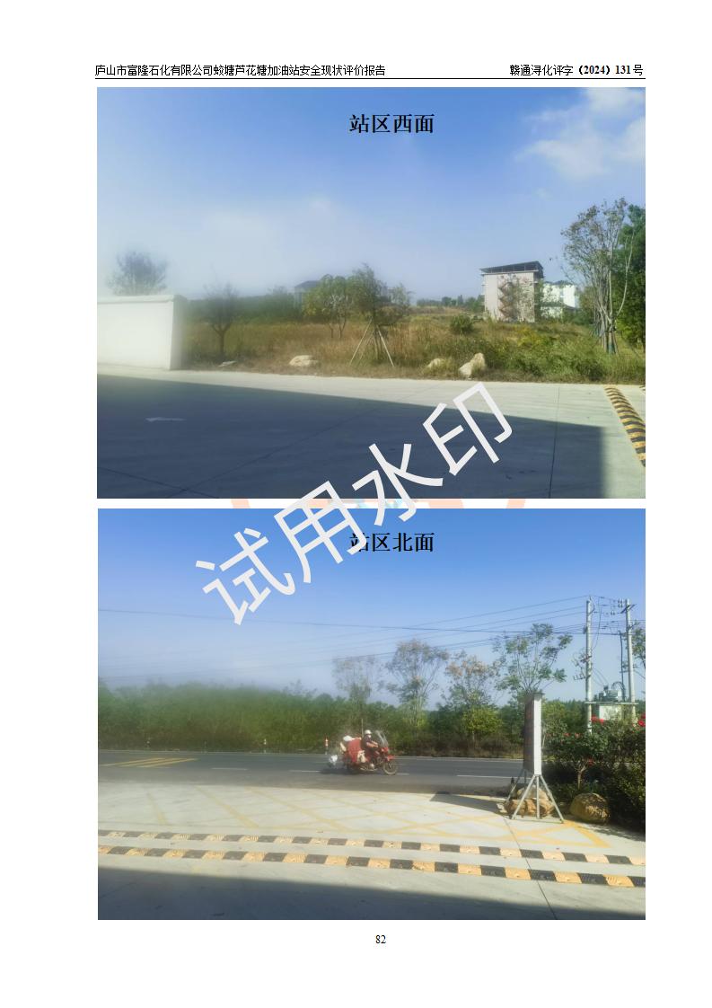 項(xiàng)目簡介 | 廬山市富隆石化有限公司蛟塘蘆花塘加油站是一家專門從事成品油零售經(jīng)營的有限責(zé)任公司分公司(自然人投資或控股),經(jīng)營場所位于江西省九江市廬山市蛟塘鎮(zhèn)蛟塘村坂上郭團(tuán)山蓼溫公路南側(cè)?,F(xiàn)有從業(yè)人員7名,其中安全管理人員1人,加油站負(fù)責(zé)人陳勇。 該加油站占地面積約2667m2,站區(qū)內(nèi)設(shè)置有4臺(tái)雙槍程控燃油加油機(jī)及配套的工藝管線,設(shè)有SF雙層儲(chǔ)罐4臺(tái),其中30m3的92#汽油儲(chǔ)罐1臺(tái)、30m3的95#/92#隔倉汽油儲(chǔ)罐1臺(tái)(95#汽油20m3、92#汽油10m3)、30m3的0#柴油儲(chǔ)罐2臺(tái),油品儲(chǔ)罐總?cè)莘e為120m3(折算成汽油為90m3),按現(xiàn)行《汽車加油加氣加氫站技術(shù)標(biāo)準(zhǔn)》對加油站的等級(jí)劃分原則,屬三級(jí)加油站。 該站由九江市行政審批局換發(fā)《危險(xiǎn)化學(xué)品經(jīng)營許可證》(證號(hào):贛九行審經(jīng)(甲)字[2022]000017號(hào)),**期限2022年01月26日至2025年01月25日。 | |||