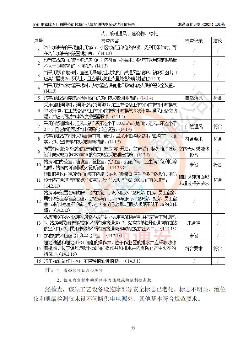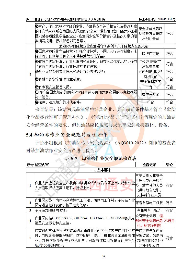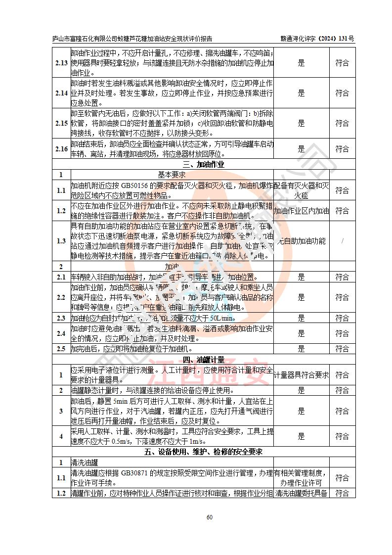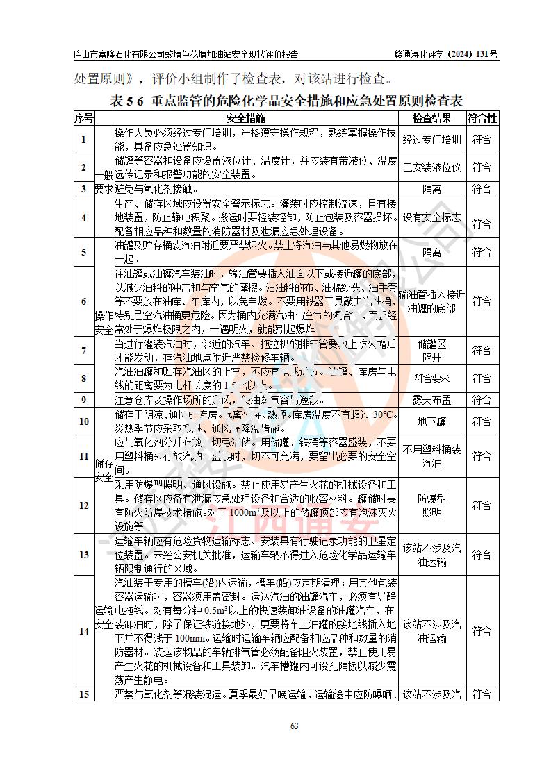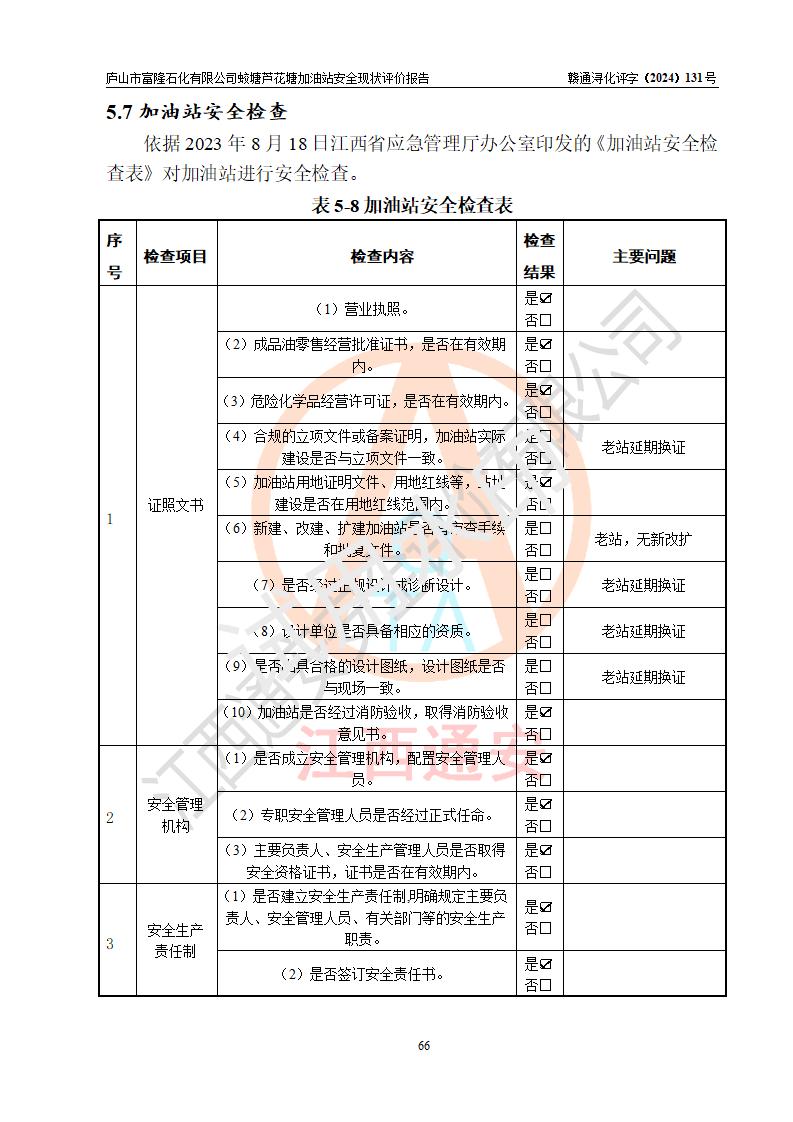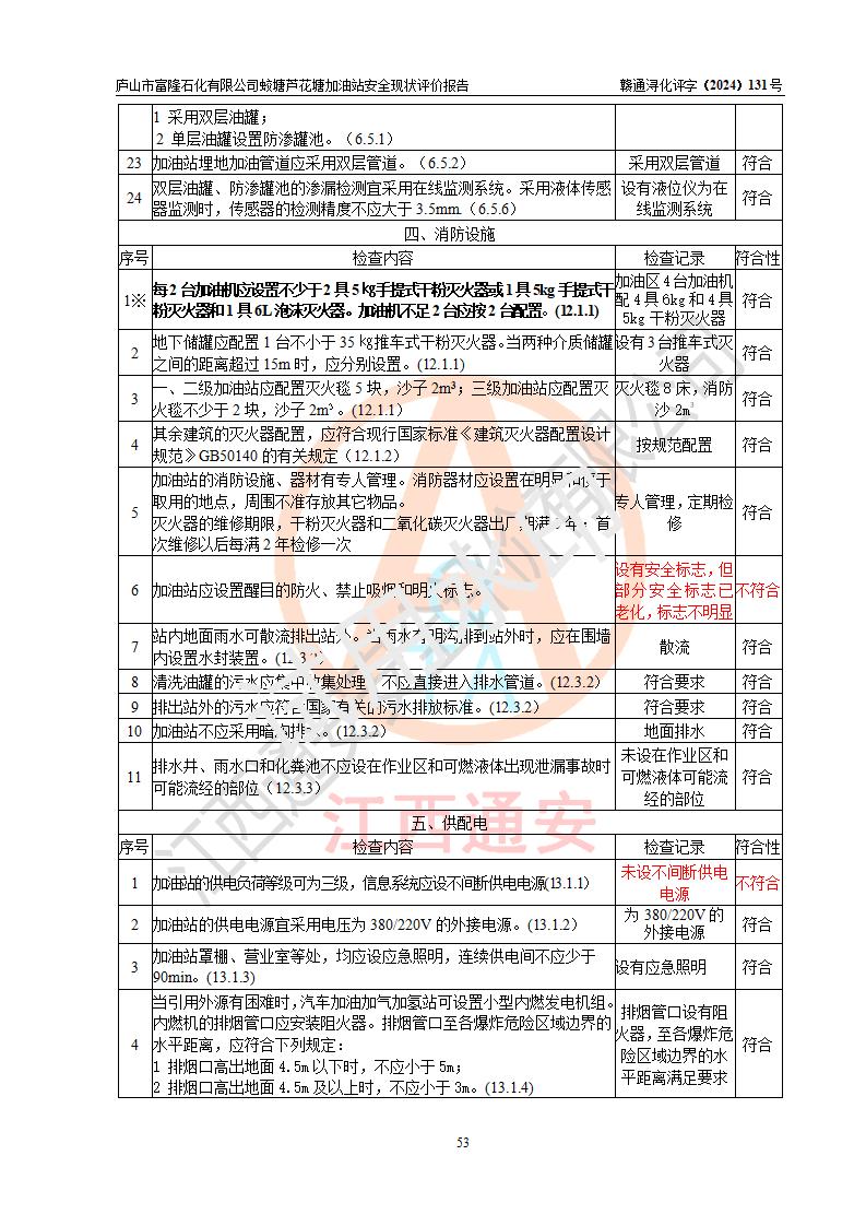 評價(jià)結(jié)論 | 廬山市富隆石化有限公司蛟塘蘆花塘加油站涉及的安全條件、安全經(jīng)營條件、安全生產(chǎn)管理符合《危險(xiǎn)化學(xué)品經(jīng)營許可證管理辦法》、《汽車加油加氣加氫站技術(shù)標(biāo)準(zhǔn)》等**有關(guān)法規(guī)、標(biāo)準(zhǔn)、規(guī)范要求,能滿足危險(xiǎn)化學(xué)品經(jīng)營安全條件。 | |||