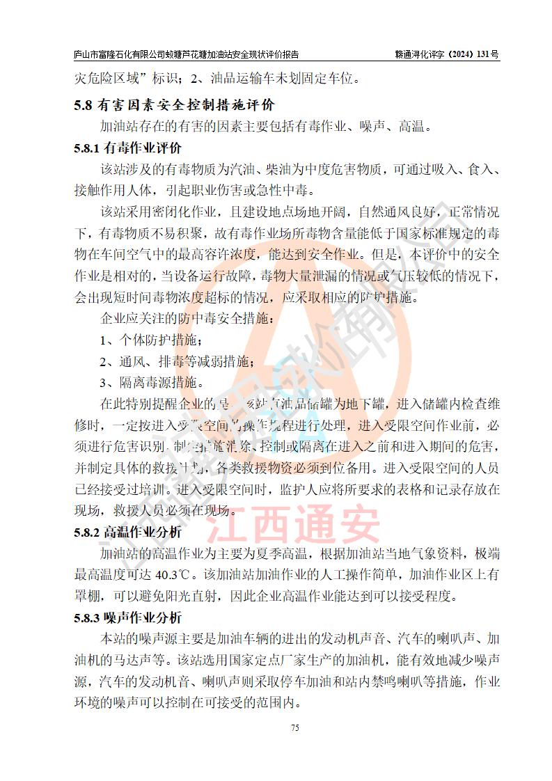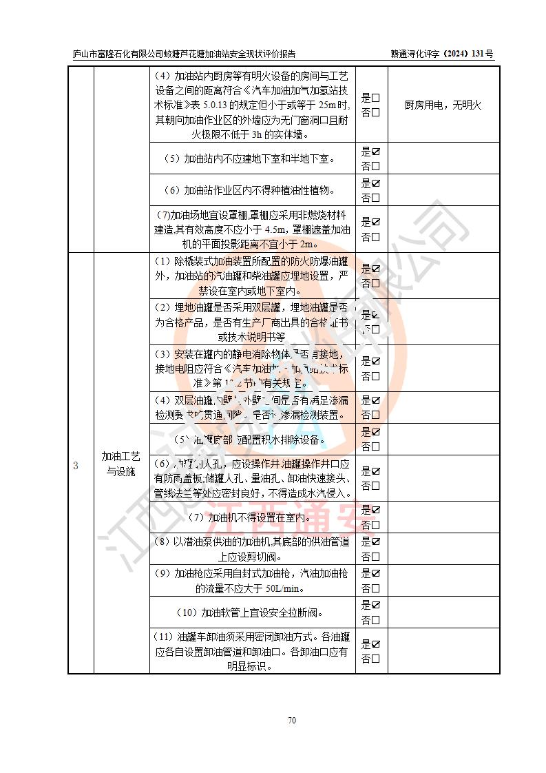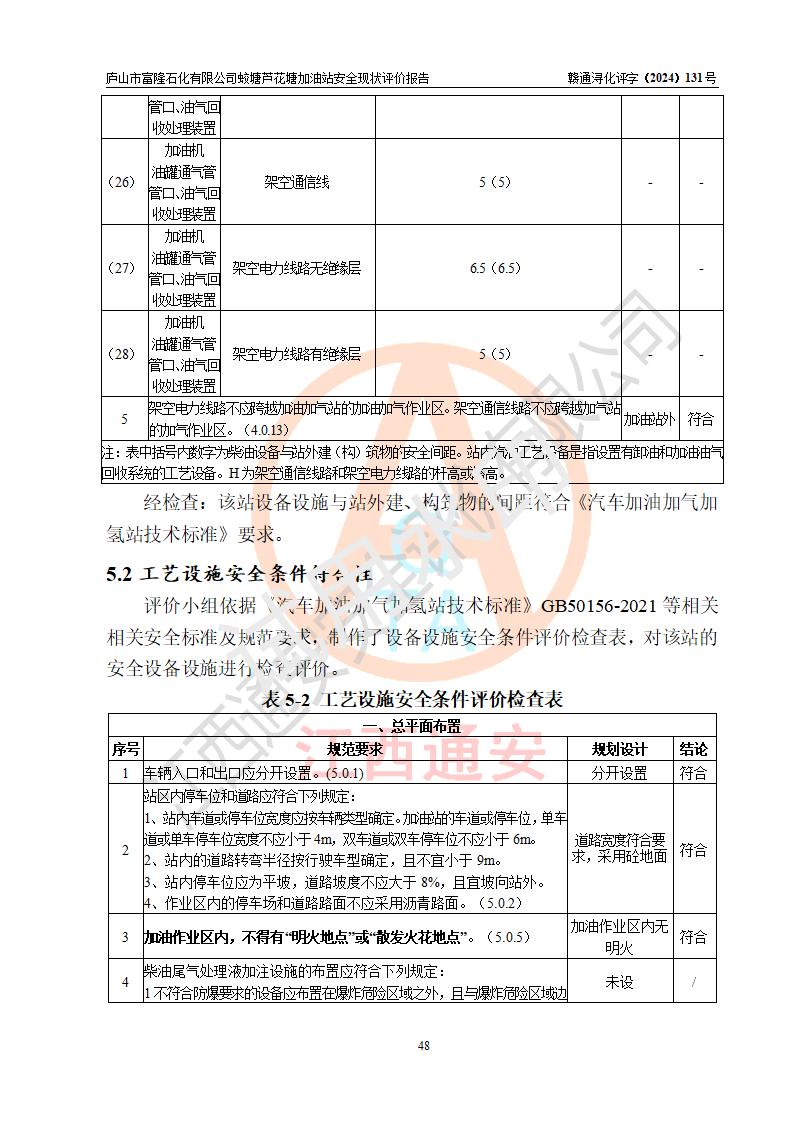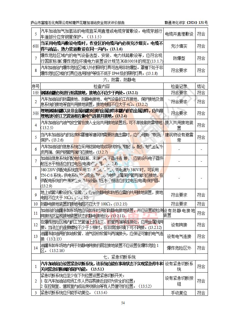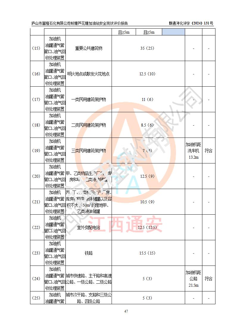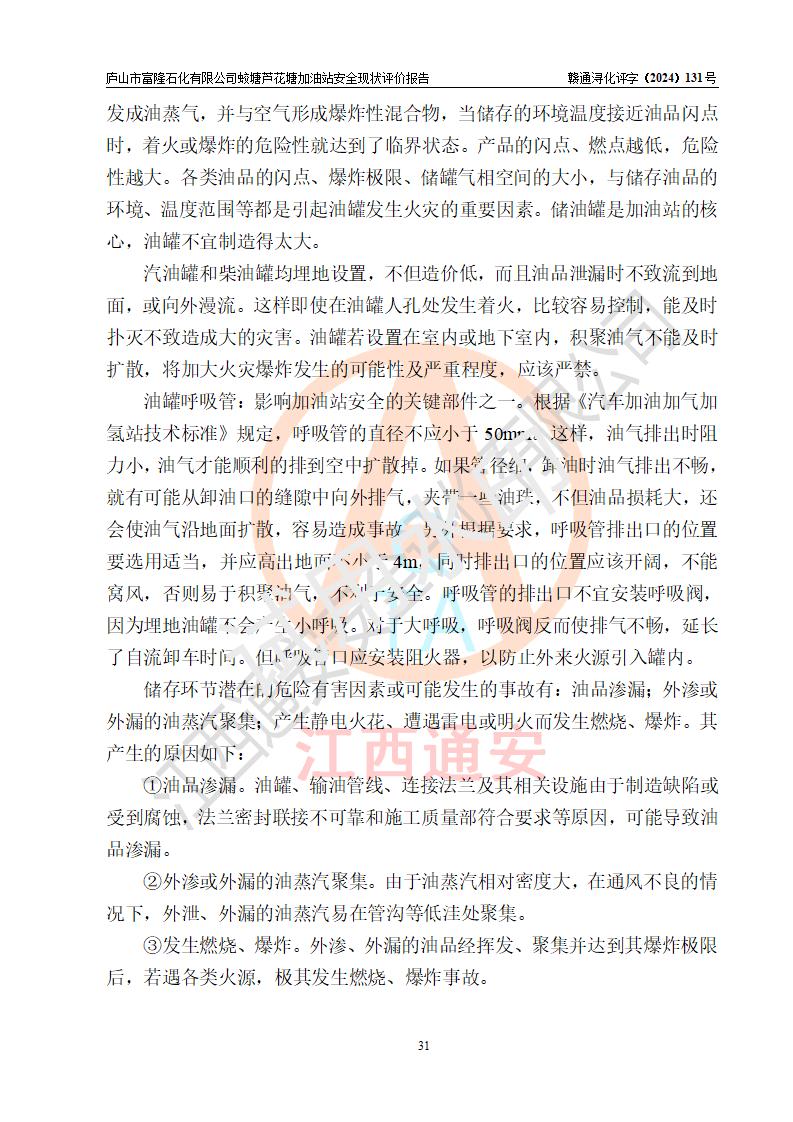 評價(jià)結(jié)論 | 廬山市富隆石化有限公司蛟塘蘆花塘加油站涉及的安全條件、安全經(jīng)營條件、安全生產(chǎn)管理符合《危險(xiǎn)化學(xué)品經(jīng)營許可證管理辦法》、《汽車加油加氣加氫站技術(shù)標(biāo)準(zhǔn)》等**有關(guān)法規(guī)、標(biāo)準(zhǔn)、規(guī)范要求,能滿足危險(xiǎn)化學(xué)品經(jīng)營安全條件。 | |||