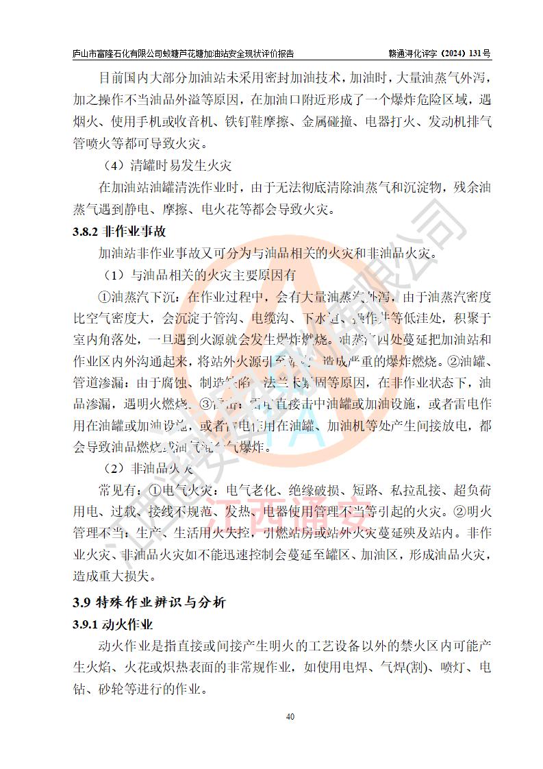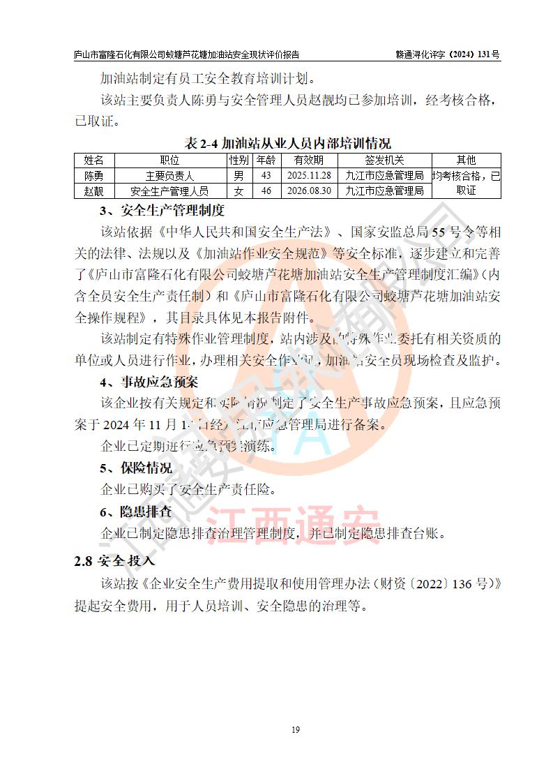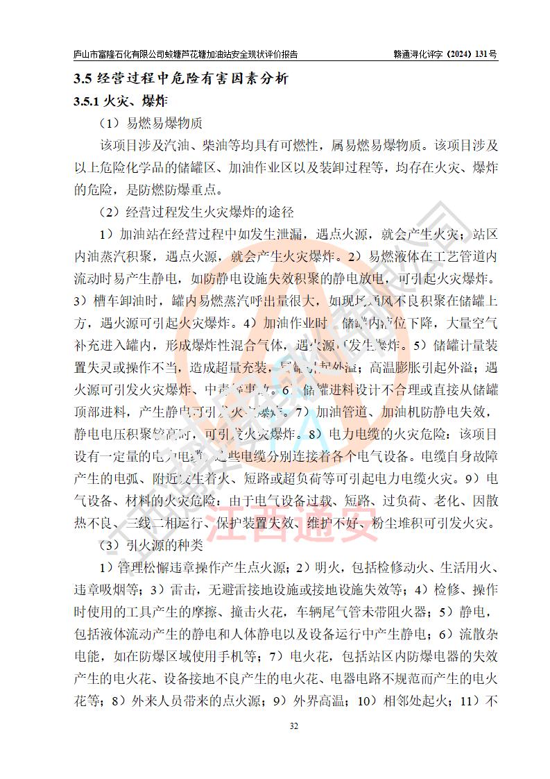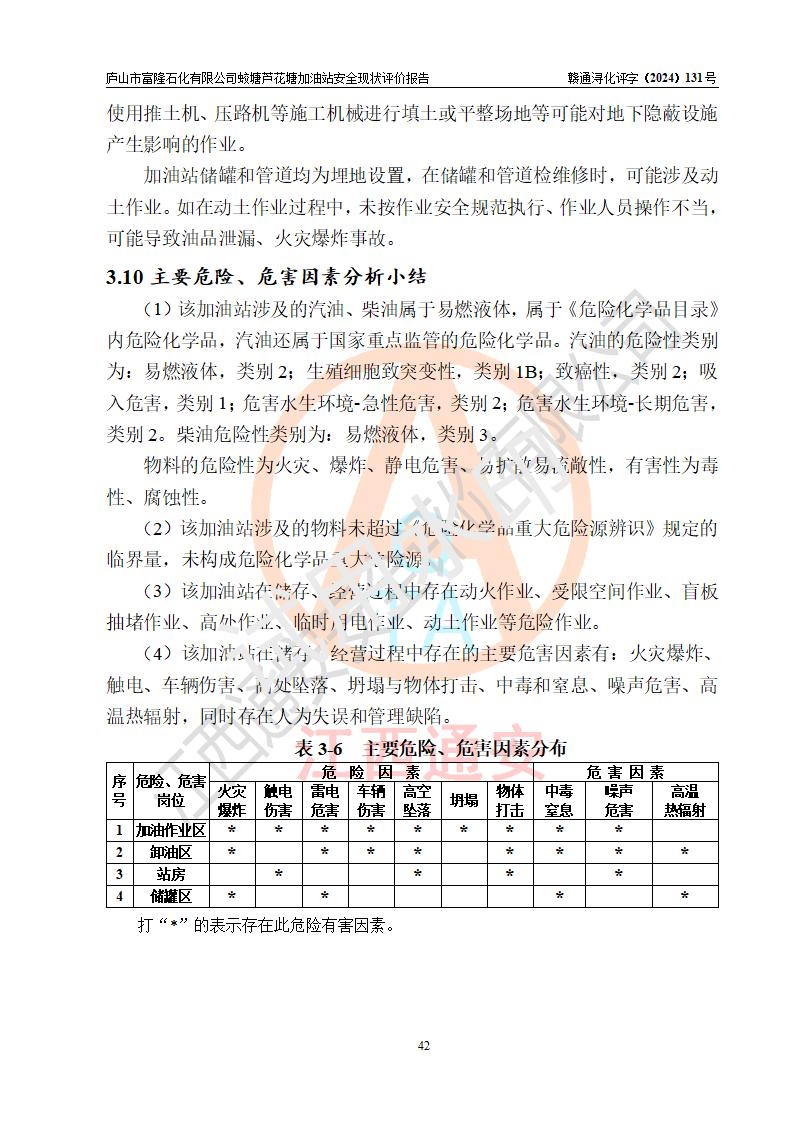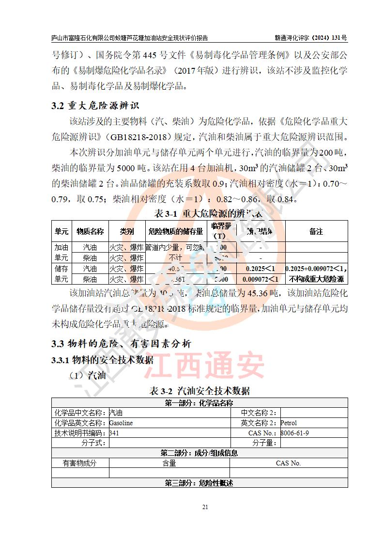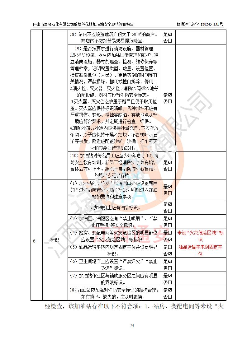 評價(jià)結(jié)論 | 廬山市富隆石化有限公司蛟塘蘆花塘加油站涉及的安全條件、安全經(jīng)營條件、安全生產(chǎn)管理符合《危險(xiǎn)化學(xué)品經(jīng)營許可證管理辦法》、《汽車加油加氣加氫站技術(shù)標(biāo)準(zhǔn)》等**有關(guān)法規(guī)、標(biāo)準(zhǔn)、規(guī)范要求,能滿足危險(xiǎn)化學(xué)品經(jīng)營安全條件。 | |||
