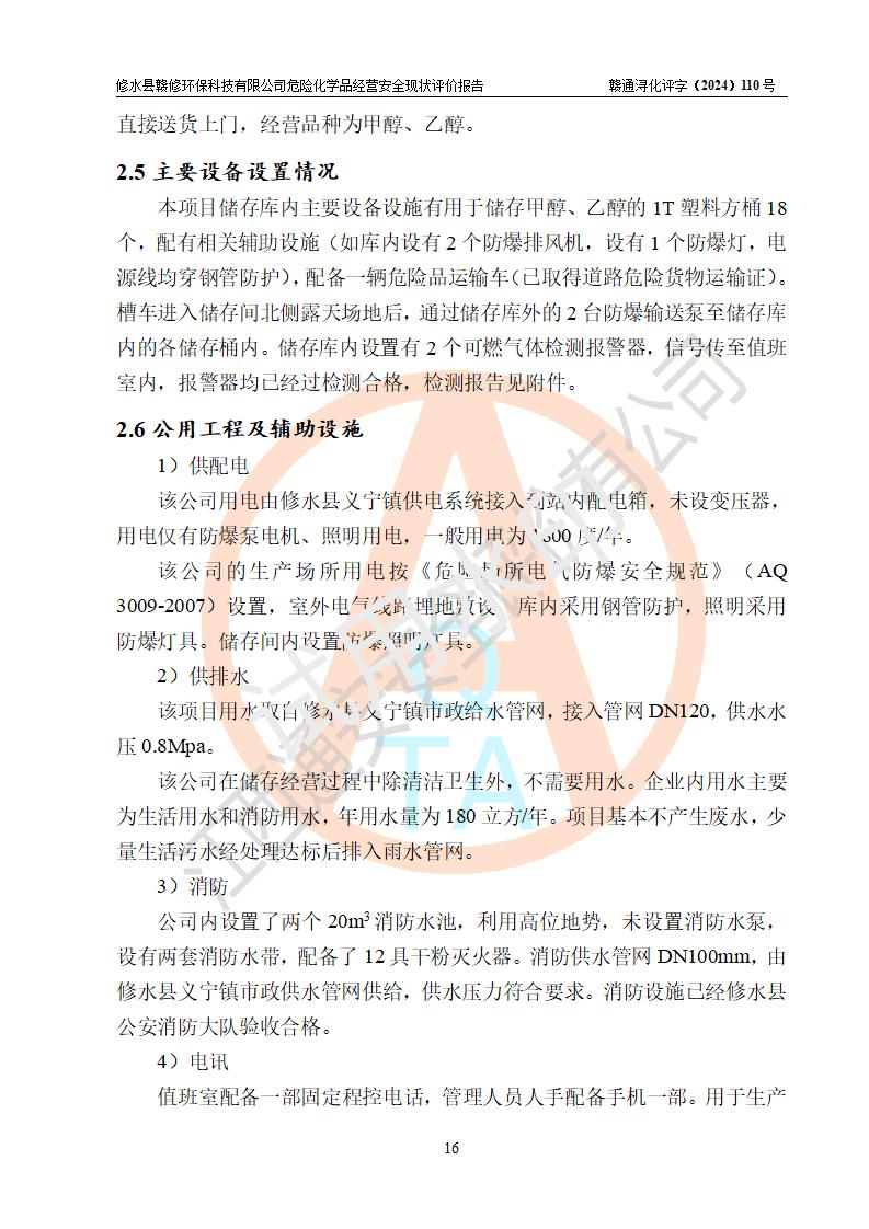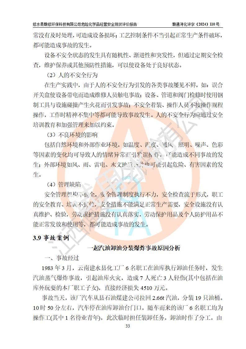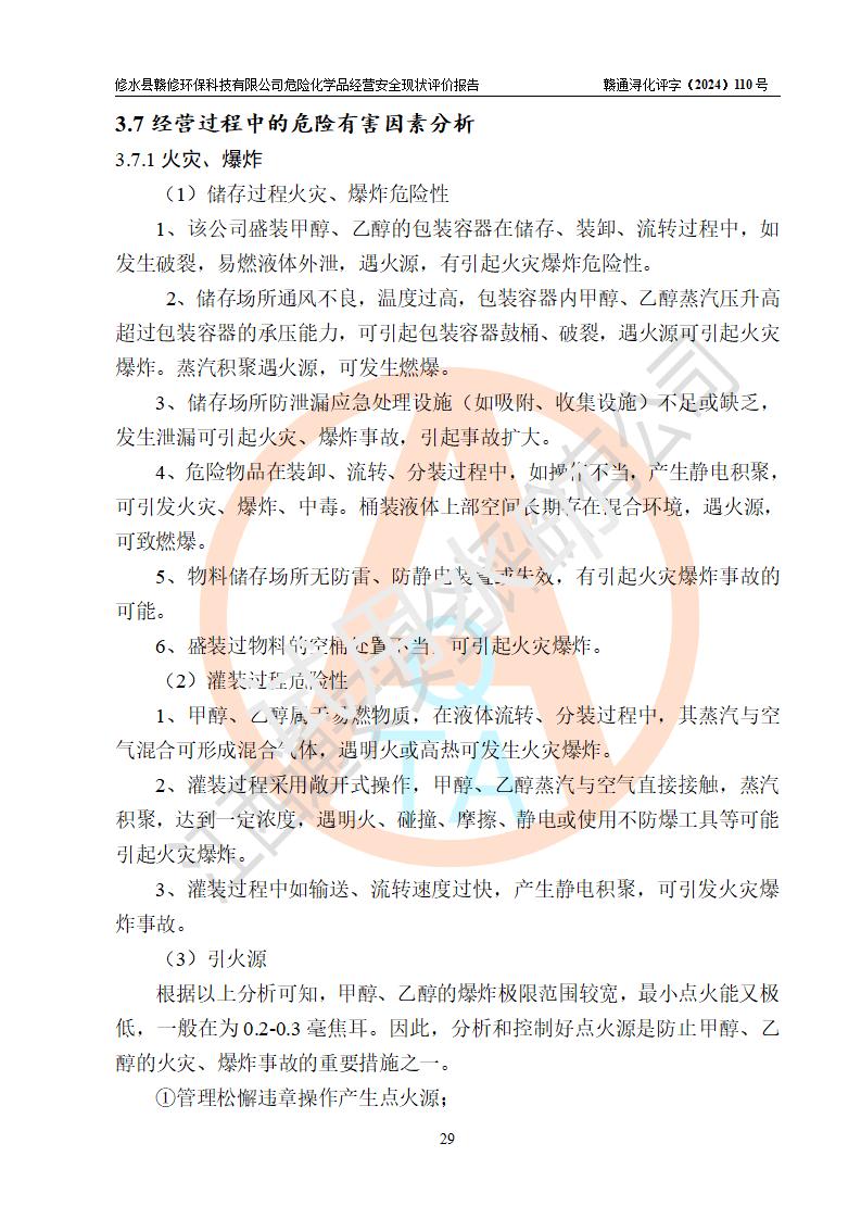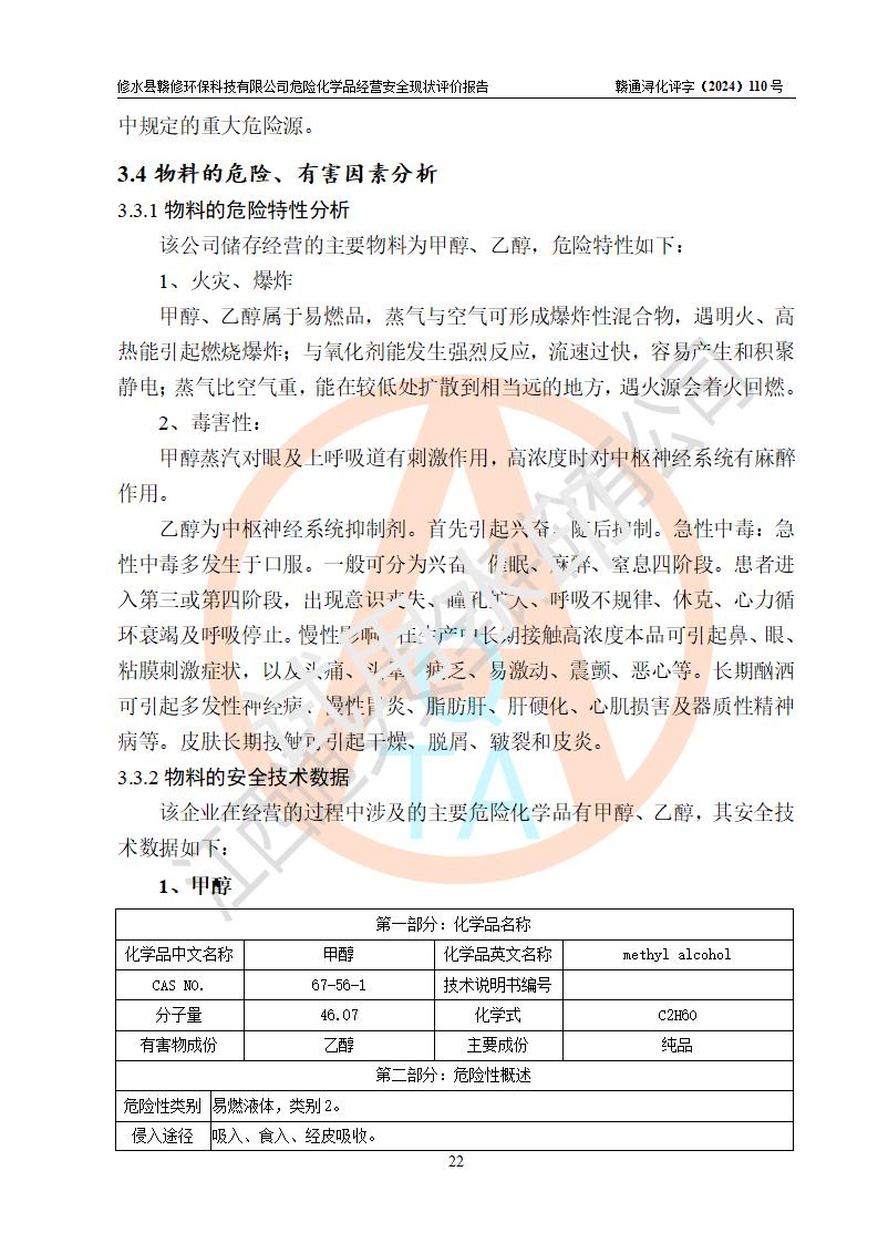項目簡介 | 修水縣贛修**科技有限公司是一家從事儲存經(jīng)營甲醇、乙醇等危險化學(xué)品的有限責任公司(自然人投資或控股),法定**人慎冬玲。經(jīng)營范圍:許可項目:甲醇、乙醇,燃氣燃燒器具安裝、維修(依法須批準的項目,經(jīng)相關(guān)部門批準后方可開展經(jīng)營活動),一般項目:**咨詢服務(wù),技術(shù)服務(wù)、技術(shù)開發(fā)、技術(shù)咨詢、技術(shù)交流、技術(shù)**、技術(shù)推廣,非食用植物油加工 ,非食用植物油銷售,**化學(xué)產(chǎn)品銷售(不含危險化學(xué)品),生物質(zhì)液體燃料生產(chǎn)工藝研發(fā),化工產(chǎn)品銷售(不含許可類化工產(chǎn)品),廚具衛(wèi)具及日用雜品批發(fā),日用品銷售,非電力家用器具銷售(除許可業(yè)務(wù)外,可自主依法經(jīng)營法律法規(guī)非禁止或限制的項目)。企業(yè)住所位于江西省九江市修水縣義寧鎮(zhèn)站前路140號,注冊資本伍拾萬元整?,F(xiàn)有員工5人,其中安全管理人員1人,法定**人慎冬玲。 該公司租賃修水縣林業(yè)集團公司(汽配公司)位于九江市修水縣北門神仙腦林業(yè)汽車配件公司場地,占地面積為500m2。該企業(yè)在儲存、經(jīng)營過程中涉及的危險化學(xué)品有甲醇、乙醇等。該公司設(shè)有1噸的方形桶儲存甲醇、乙醇及配套設(shè)施,從事儲存經(jīng)營;設(shè)有1個甲類儲存?zhèn)}庫,儲存庫占地面積105m2。企業(yè)經(jīng)營過程中涉及的危險化學(xué)品均已列入《危險化學(xué)品目錄(2015年版,2022年修改)》。該公司于2022年05月16日由九江市行政審批局簽發(fā)的《危險化學(xué)品經(jīng)營許可證》(證號:贛九行審經(jīng)(甲)字[2022]000067),**期至2025年01月23日。 根據(jù)《危險化學(xué)品經(jīng)營許可證管理辦法》(**安監(jiān)總局第55號令,第79號令修改)以及《江西省安全生產(chǎn)監(jiān)督管理局關(guān)于貫徹﹤危險化學(xué)品經(jīng)營許可證管理辦法﹥的通知》(贛安監(jiān)管二字﹝2013﹞14號)的要求,危險化學(xué)品經(jīng)營許可證的**期為3年。**期滿后,企業(yè)需要繼續(xù)從事危險化學(xué)品經(jīng)營活動的,應(yīng)當在危險化學(xué)品經(jīng)營許可證**期滿3個月前,向發(fā)證機關(guān)提出危險化學(xué)品經(jīng)營許可證的延期申請。申請證照延期的所有儲存、經(jīng)營危險化學(xué)品的單位,應(yīng)當提供安全評價報告。修水縣贛修**科技有限公司目前正在做危險化學(xué)品經(jīng)營許可證延期換證的準備工作,故委托江西通安安全評價有限公司承擔其危險化學(xué)品經(jīng)營現(xiàn)狀評價工作。 江西通安安全評價有限公司接受委托后,組織了評價小組。根據(jù)相關(guān)法律、法規(guī)和標準的規(guī)定,于2024 年11月勘察了企業(yè)經(jīng)營場所。在對委托方相關(guān)裝置的運行及其安全管理的現(xiàn)狀進行充分了解后,充分查找了其存在的危險、有害因素種類和危險危害程度;對存在的問題,評價組成員和委托方的陪同人員進行了及時的溝通,并提出了整改措施;企業(yè)及時完成了整改。評價小組在委托方提供的有關(guān)技術(shù)和管理資料基礎(chǔ)上,按照《安全評價通則》(AQ8001-2007)的要求,依據(jù)**有關(guān)法律、法規(guī)、標準和規(guī)范,采用合適的安全評價方法,編制完成了本安全評價報告,以作為企業(yè)安全生產(chǎn)技術(shù)與安全生產(chǎn)管理決策及應(yīng)急管理部門實施監(jiān)督管理提供安全技術(shù)依據(jù)。 本次安全評價范圍為:修水縣贛修**科技有限公司儲存經(jīng)營甲醇、乙醇等的儲存裝置和輔助設(shè)施,以及儲存過程中涉及的設(shè)備設(shè)施的安全技術(shù)措施和安全管理措施。包括儲存經(jīng)營過程中的危險有害因素、安全生產(chǎn)條件以及工藝、設(shè)備設(shè)施的安全可靠性和安全管理的組織、機構(gòu)、人員、防護設(shè)施、作業(yè)環(huán)境、管理制度等。 項目涉及的環(huán)境保護、消防、職業(yè)衛(wèi)生等問題則應(yīng)執(zhí)行**的有關(guān)規(guī)定及相關(guān)標準。本評價引用到的**、消防、職業(yè)衛(wèi)生等方面的法規(guī)標準與安全評價有**的關(guān)聯(lián),環(huán)境保護、職業(yè)衛(wèi)生與消防應(yīng)以其主管部門審核意見為準。廠外運輸不在評價范圍,出庫后經(jīng)危化品運輸車分裝至用戶不在本次評價范圍,只作一般性描述。 | ||||||