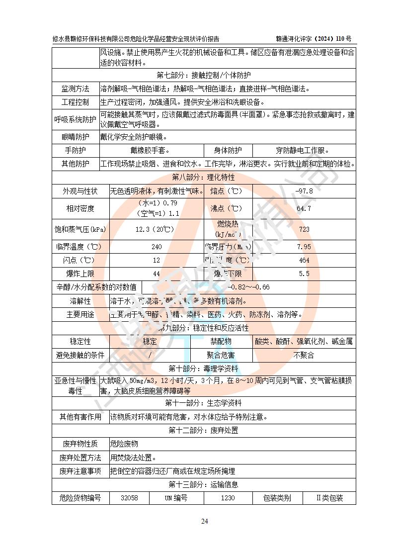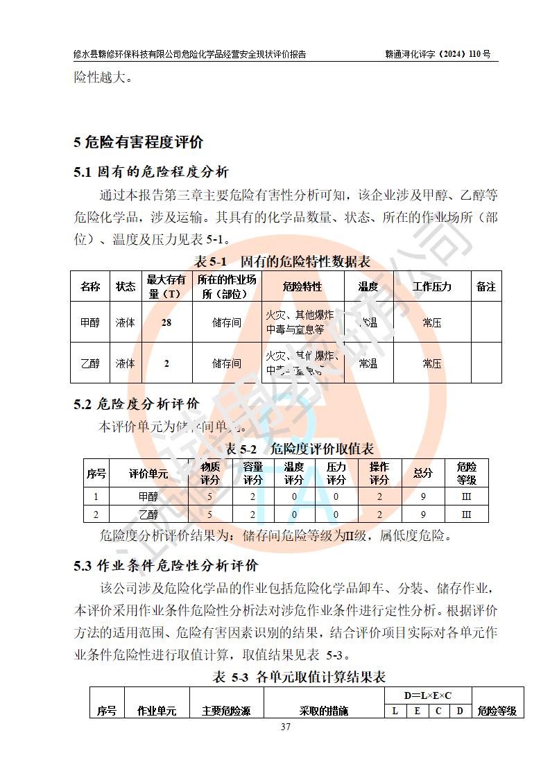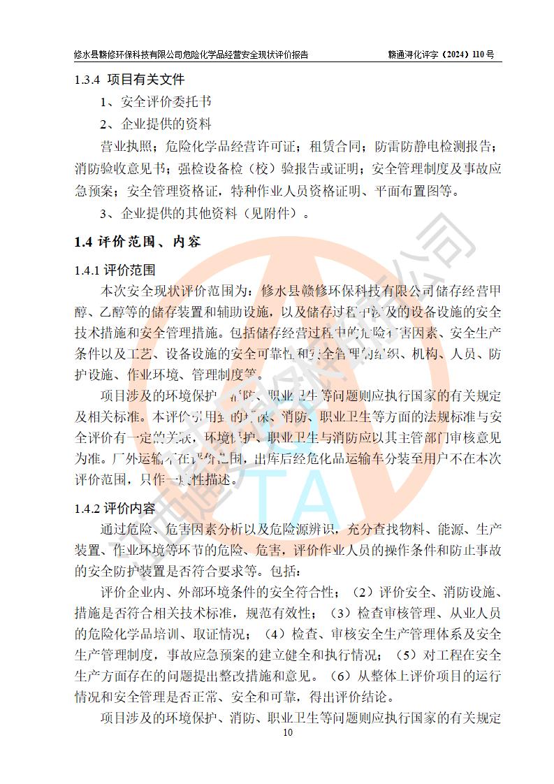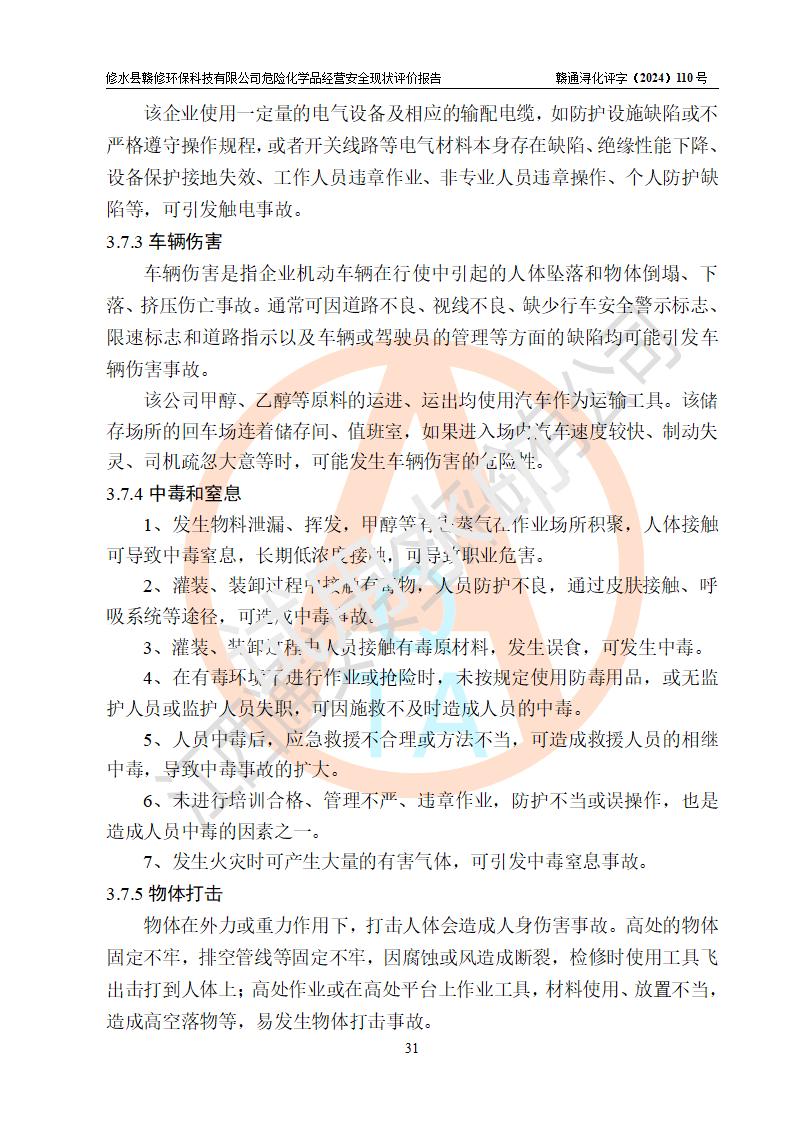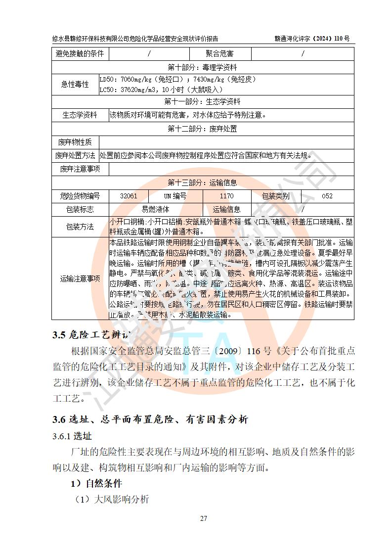 項目簡介 | 修水縣贛修**科技有限公司是一家從事儲存經(jīng)營甲醇、乙醇等危險化學(xué)品的有限責任公司(自然人投資或控股),法定**人慎冬玲。經(jīng)營范圍:許可項目:甲醇、乙醇,燃氣燃燒器具安裝、維修(依法須批準的項目,經(jīng)相關(guān)部門批準后方可開展經(jīng)營活動),一般項目:**咨詢服務(wù),技術(shù)服務(wù)、技術(shù)開發(fā)、技術(shù)咨詢、技術(shù)交流、技術(shù)**、技術(shù)推廣,非食用植物油加工 ,非食用植物油銷售,**化學(xué)產(chǎn)品銷售(不含危險化學(xué)品),生物質(zhì)液體燃料生產(chǎn)工藝研發(fā),化工產(chǎn)品銷售(不含許可類化工產(chǎn)品),廚具衛(wèi)具及日用雜品批發(fā),日用品銷售,非電力家用器具銷售(除許可業(yè)務(wù)外,可自主依法經(jīng)營法律法規(guī)非禁止或限制的項目)。企業(yè)住所位于江西省九江市修水縣義寧鎮(zhèn)站前路140號,注冊資本伍拾萬元整?,F(xiàn)有員工5人,其中安全管理人員1人,法定**人慎冬玲。 該公司租賃修水縣林業(yè)集團公司(汽配公司)位于九江市修水縣北門神仙腦林業(yè)汽車配件公司場地,占地面積為500m2。該企業(yè)在儲存、經(jīng)營過程中涉及的危險化學(xué)品有甲醇、乙醇等。該公司設(shè)有1噸的方形桶儲存甲醇、乙醇及配套設(shè)施,從事儲存經(jīng)營;設(shè)有1個甲類儲存?zhèn)}庫,儲存庫占地面積105m2。企業(yè)經(jīng)營過程中涉及的危險化學(xué)品均已列入《危險化學(xué)品目錄(2015年版,2022年修改)》。該公司于2022年05月16日由九江市行政審批局簽發(fā)的《危險化學(xué)品經(jīng)營許可證》(證號:贛九行審經(jīng)(甲)字[2022]000067),**期至2025年01月23日。 根據(jù)《危險化學(xué)品經(jīng)營許可證管理辦法》(**安監(jiān)總局第55號令,第79號令修改)以及《江西省安全生產(chǎn)監(jiān)督管理局關(guān)于貫徹﹤危險化學(xué)品經(jīng)營許可證管理辦法﹥的通知》(贛安監(jiān)管二字﹝2013﹞14號)的要求,危險化學(xué)品經(jīng)營許可證的**期為3年。**期滿后,企業(yè)需要繼續(xù)從事危險化學(xué)品經(jīng)營活動的,應(yīng)當在危險化學(xué)品經(jīng)營許可證**期滿3個月前,向發(fā)證機關(guān)提出危險化學(xué)品經(jīng)營許可證的延期申請。申請證照延期的所有儲存、經(jīng)營危險化學(xué)品的單位,應(yīng)當提供安全評價報告。修水縣贛修**科技有限公司目前正在做危險化學(xué)品經(jīng)營許可證延期換證的準備工作,故委托江西通安安全評價有限公司承擔其危險化學(xué)品經(jīng)營現(xiàn)狀評價工作。 江西通安安全評價有限公司接受委托后,組織了評價小組。根據(jù)相關(guān)法律、法規(guī)和標準的規(guī)定,于2024 年11月勘察了企業(yè)經(jīng)營場所。在對委托方相關(guān)裝置的運行及其安全管理的現(xiàn)狀進行充分了解后,充分查找了其存在的危險、有害因素種類和危險危害程度;對存在的問題,評價組成員和委托方的陪同人員進行了及時的溝通,并提出了整改措施;企業(yè)及時完成了整改。評價小組在委托方提供的有關(guān)技術(shù)和管理資料基礎(chǔ)上,按照《安全評價通則》(AQ8001-2007)的要求,依據(jù)**有關(guān)法律、法規(guī)、標準和規(guī)范,采用合適的安全評價方法,編制完成了本安全評價報告,以作為企業(yè)安全生產(chǎn)技術(shù)與安全生產(chǎn)管理決策及應(yīng)急管理部門實施監(jiān)督管理提供安全技術(shù)依據(jù)。 本次安全評價范圍為:修水縣贛修**科技有限公司儲存經(jīng)營甲醇、乙醇等的儲存裝置和輔助設(shè)施,以及儲存過程中涉及的設(shè)備設(shè)施的安全技術(shù)措施和安全管理措施。包括儲存經(jīng)營過程中的危險有害因素、安全生產(chǎn)條件以及工藝、設(shè)備設(shè)施的安全可靠性和安全管理的組織、機構(gòu)、人員、防護設(shè)施、作業(yè)環(huán)境、管理制度等。 項目涉及的環(huán)境保護、消防、職業(yè)衛(wèi)生等問題則應(yīng)執(zhí)行**的有關(guān)規(guī)定及相關(guān)標準。本評價引用到的**、消防、職業(yè)衛(wèi)生等方面的法規(guī)標準與安全評價有**的關(guān)聯(lián),環(huán)境保護、職業(yè)衛(wèi)生與消防應(yīng)以其主管部門審核意見為準。廠外運輸不在評價范圍,出庫后經(jīng)危化品運輸車分裝至用戶不在本次評價范圍,只作一般性描述。 | ||||||