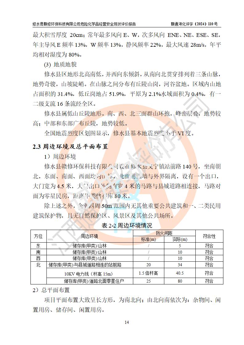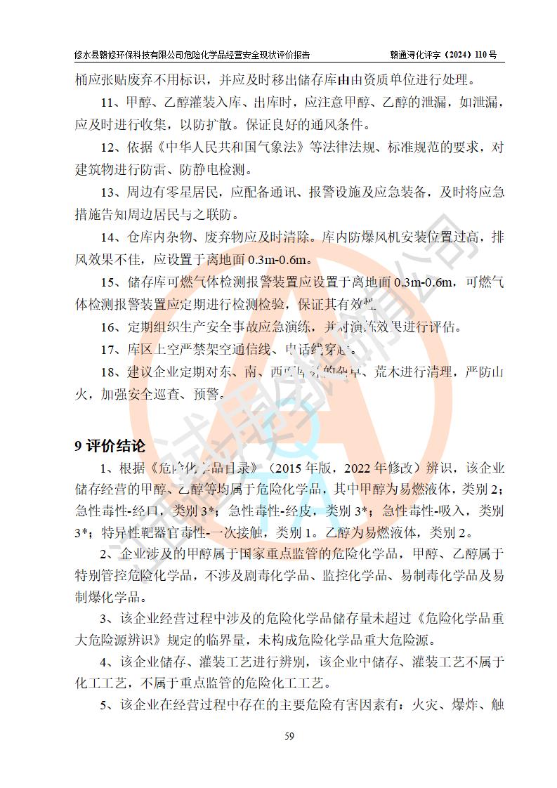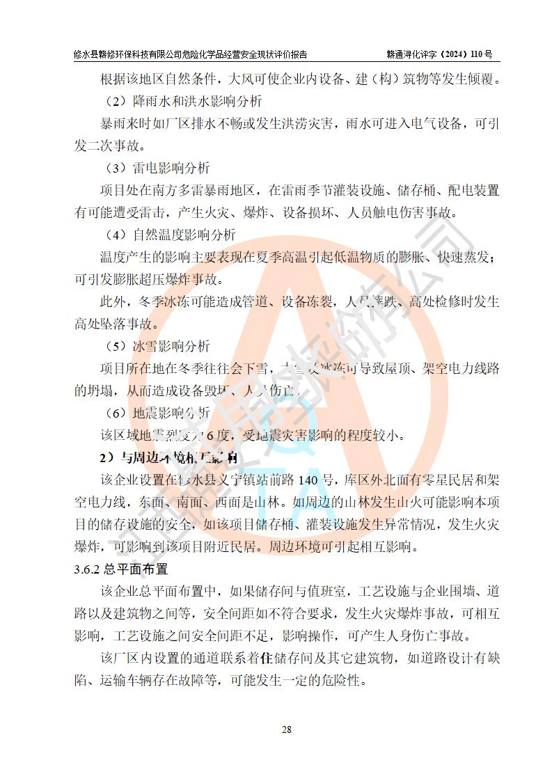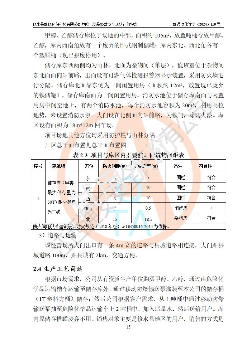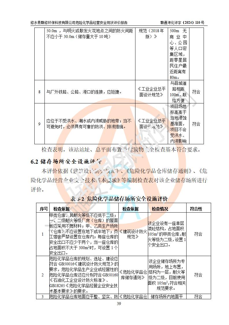 評價結(jié)論 | 修水縣贛修**科技有限公司外部防護距離和總平面布局符合《建筑設(shè)計防火規(guī)范2018年版》(GB50016-2014 )、《危險化學(xué)品經(jīng)營企業(yè)安全技術(shù)其本要求》(GB18265-2019)、《危險品化學(xué)品倉庫儲存通則》 (GB15603-2022)等標準規(guī)范要求,其他方面按相關(guān)法規(guī)、規(guī)范要求采取了相應(yīng)的技術(shù)設(shè)施和安全管理措施,其風險可控,能達到可以接受的程度,可滿足安全生產(chǎn)條件。 | ||||||