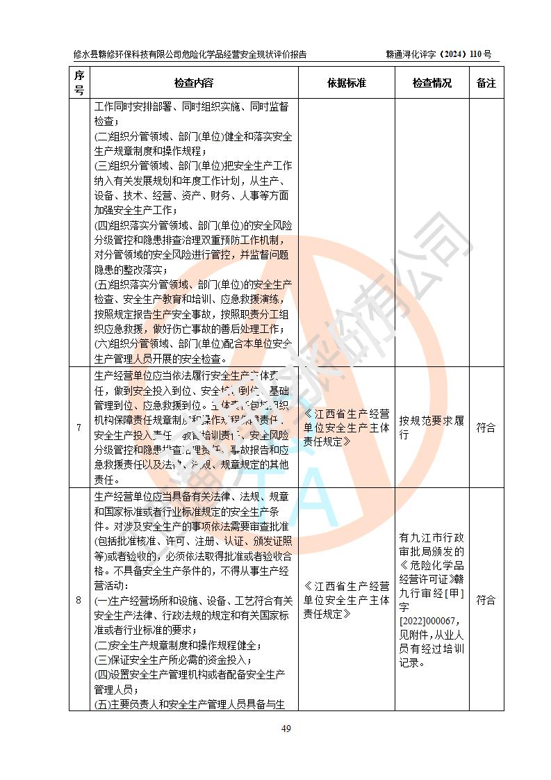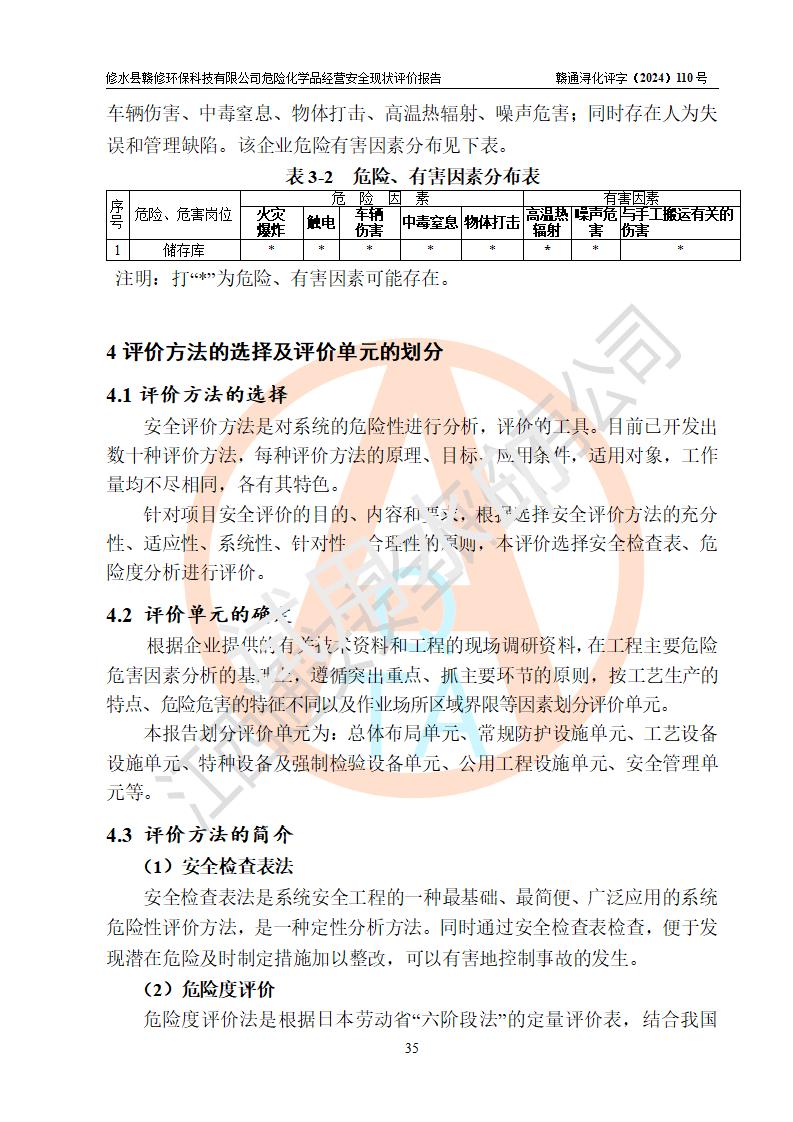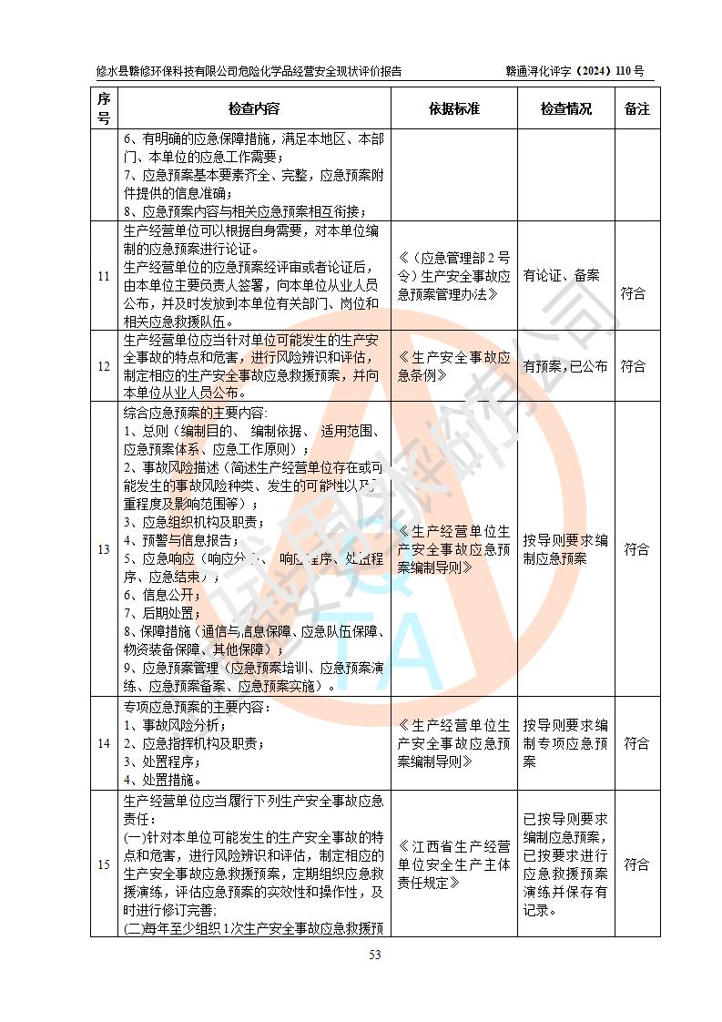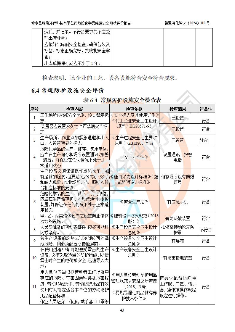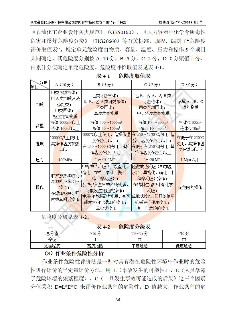 評價結(jié)論 | 修水縣贛修**科技有限公司外部防護距離和總平面布局符合《建筑設(shè)計防火規(guī)范2018年版》(GB50016-2014 )、《危險化學(xué)品經(jīng)營企業(yè)安全技術(shù)其本要求》(GB18265-2019)、《危險品化學(xué)品倉庫儲存通則》 (GB15603-2022)等標準規(guī)范要求,其他方面按相關(guān)法規(guī)、規(guī)范要求采取了相應(yīng)的技術(shù)設(shè)施和安全管理措施,其風險可控,能達到可以接受的程度,可滿足安全生產(chǎn)條件。 | ||||||