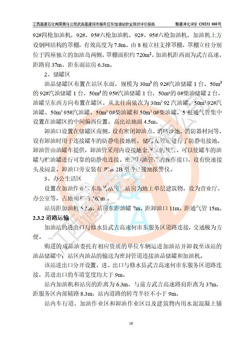 項目簡介 | 江西高速石化有限責(zé)任公司武吉高速何市服務(wù)區(qū)東加油站是一家專門從事成品油零售經(jīng)營的其他有限責(zé)任公司分公司,經(jīng)營場所位于江西省九江市修水縣武吉高速何市東服務(wù)區(qū),該站現(xiàn)有員工7人,主要負(fù)責(zé)人程謝強。 該加油站占地面積約1507.4m2,站內(nèi)設(shè)有地下直埋臥式雙層油罐5臺,分別50m3汽油罐2臺、30m3汽油罐1臺,50m3柴油罐2臺,儲罐總?cè)莘e230m3,柴油罐容積折半計入油罐總?cè)莘e則為180m3,按現(xiàn)行《汽車加油加氣加氫站技術(shù)標(biāo)準(zhǔn)》對加油站的等級劃分原則,該站屬**加油站。 該站由九江市行政審批局換發(fā)《危險化學(xué)品經(jīng)營許可證》(證號:贛九危化經(jīng)字[2023]000092號),**期限2022年02月26日至2025年02月25日。 | |||