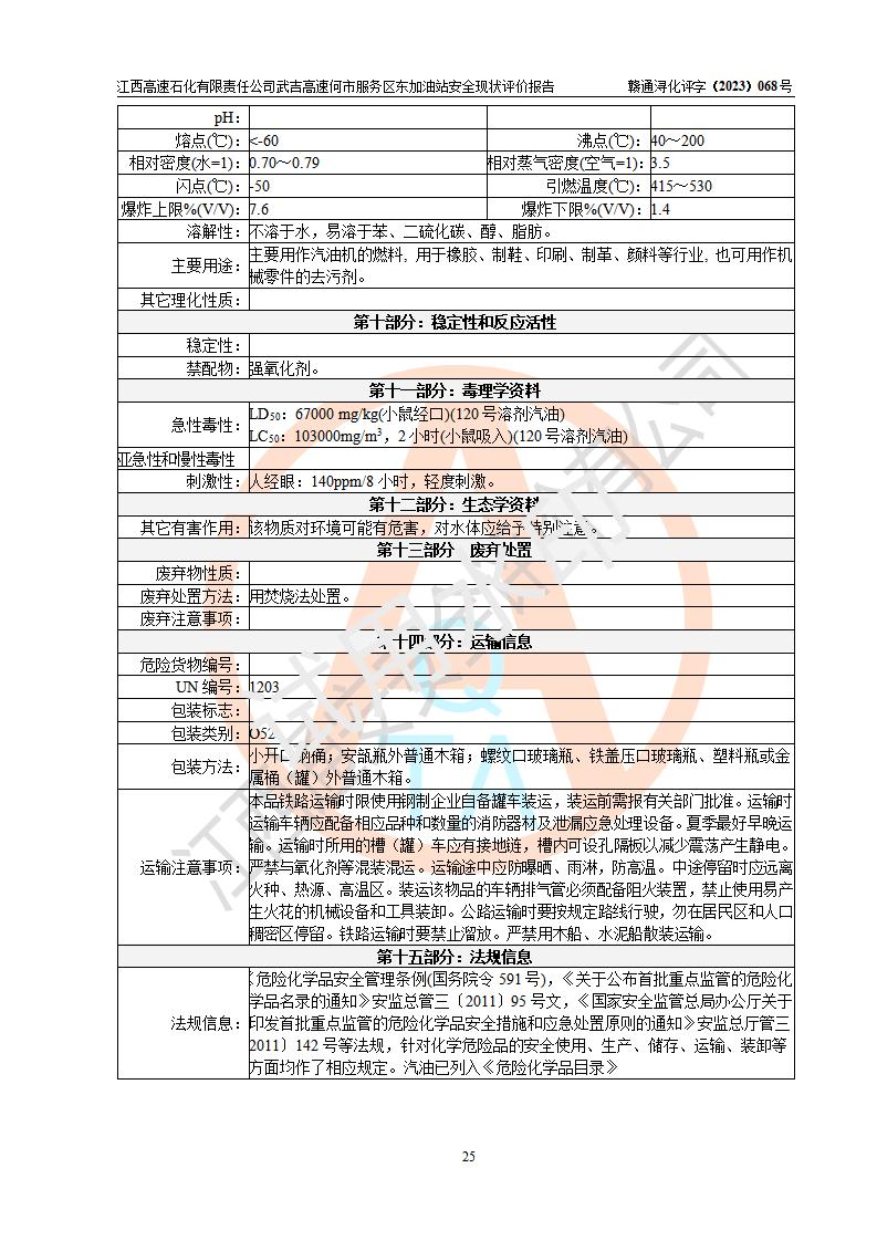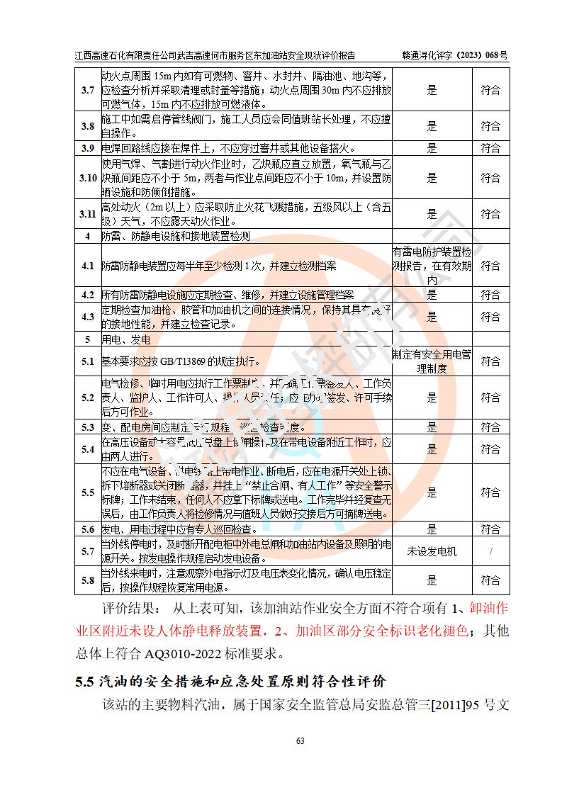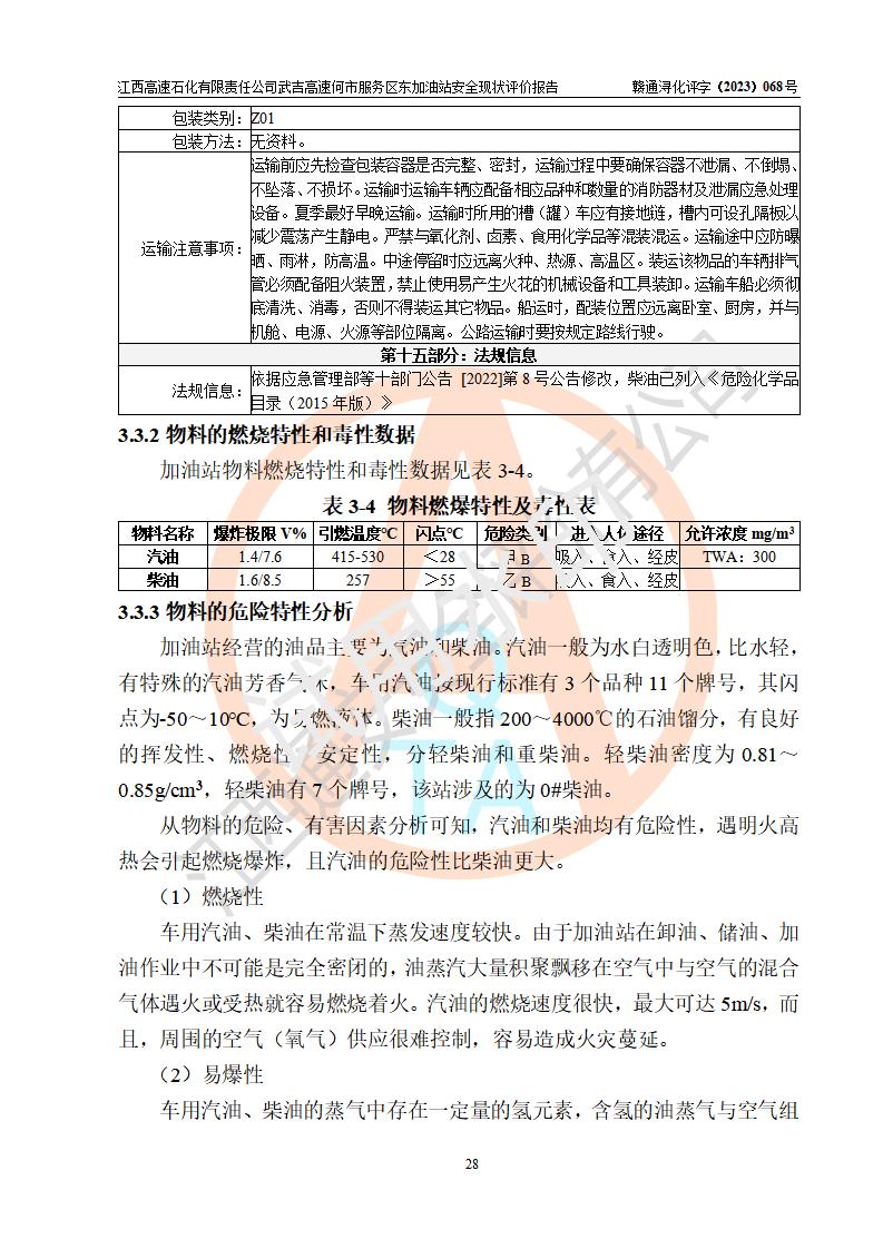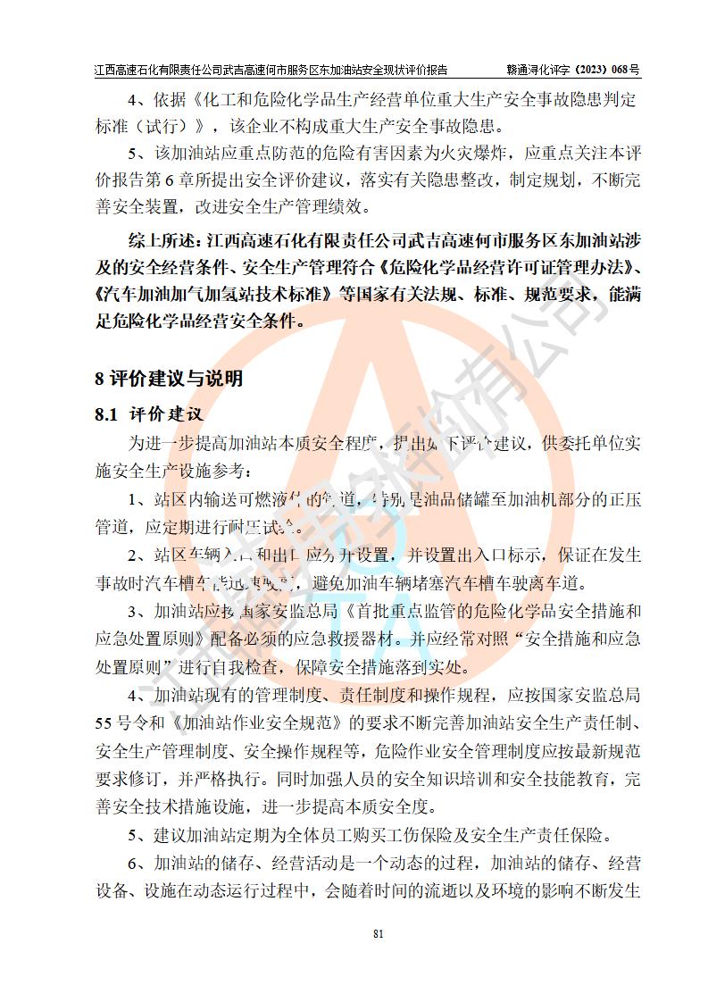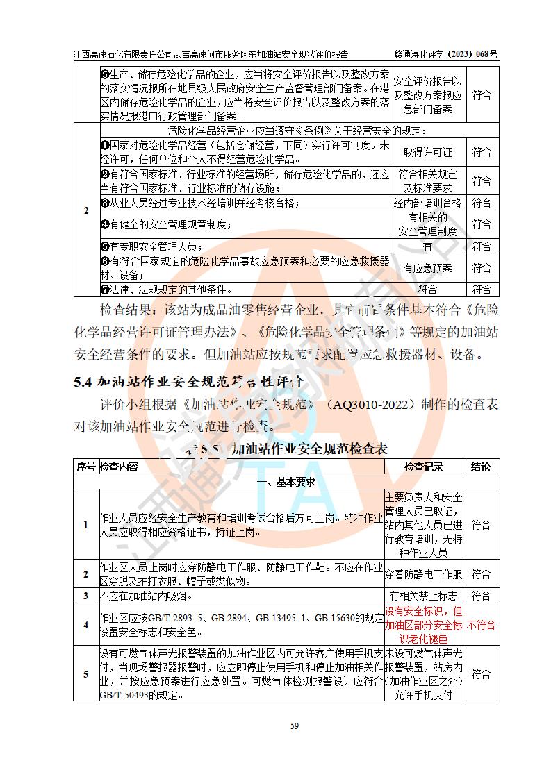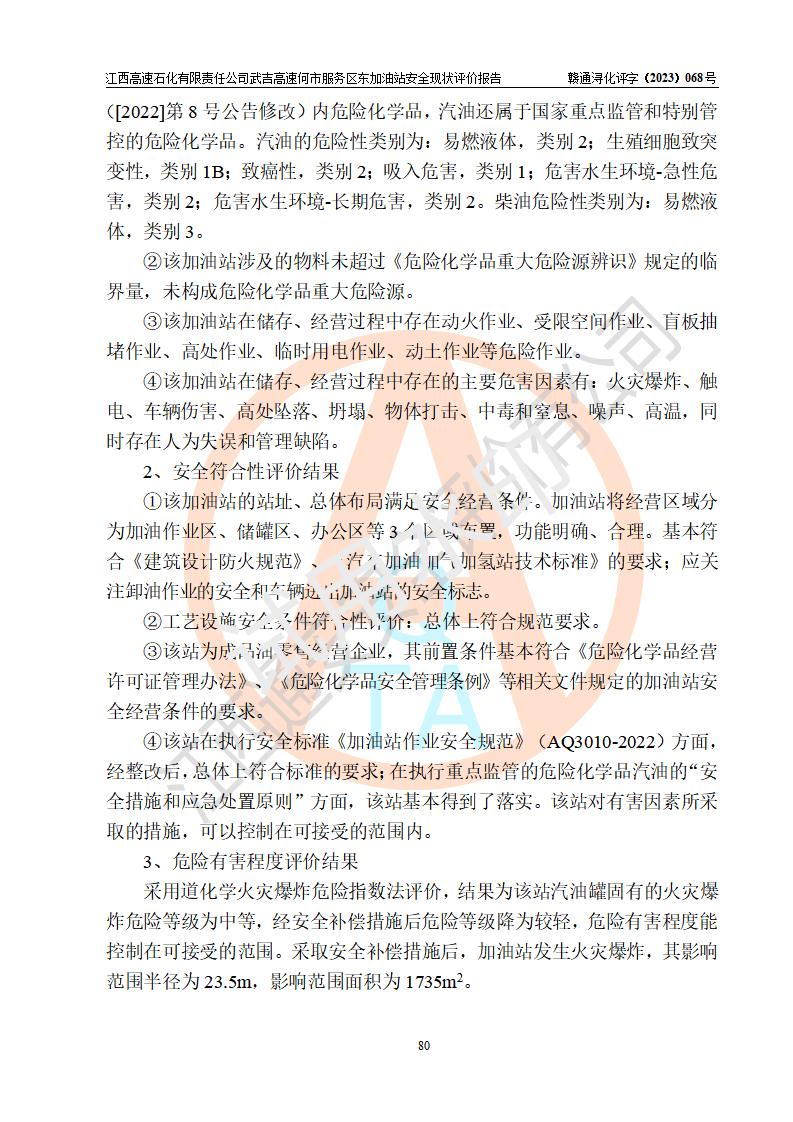評價結(jié)論 | 江西高速石化有限責(zé)任公司武吉高速何市服務(wù)區(qū)東加油站涉及的安全條件、安全經(jīng)營條件、安全生產(chǎn)管理符合《危險化學(xué)品經(jīng)營許可證管理辦法》、《汽車加油加氣加氫站技術(shù)標(biāo)準(zhǔn)》等**有關(guān)法規(guī)、標(biāo)準(zhǔn)、規(guī)范要求,能滿足危險化學(xué)品經(jīng)營安全條件。 | |||