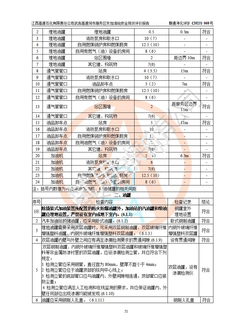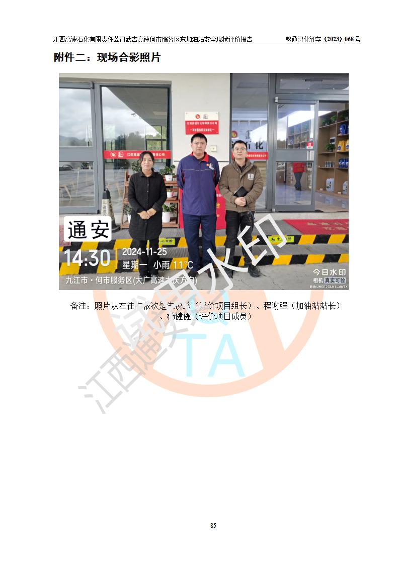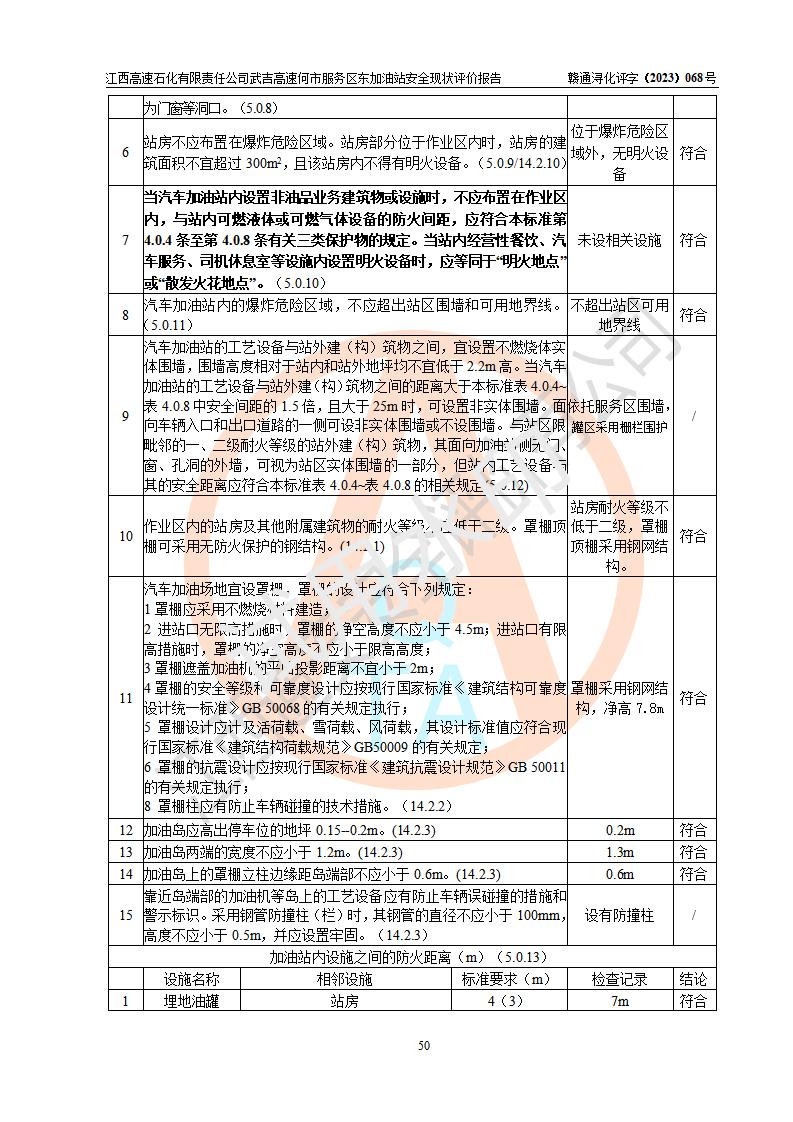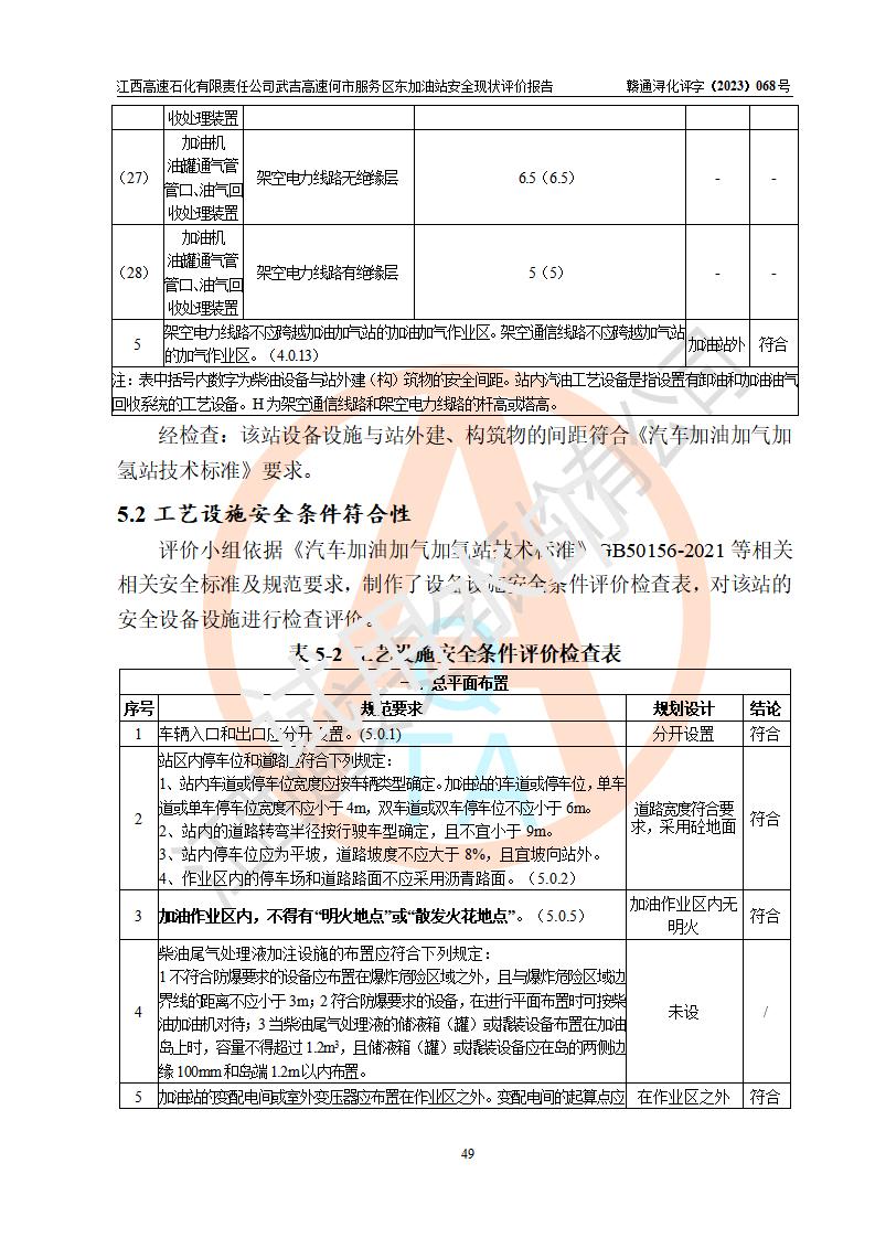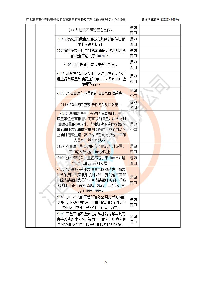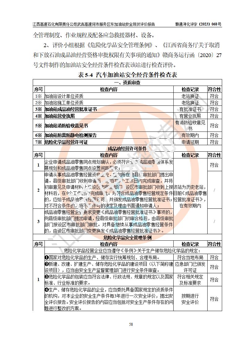 評價結(jié)論 | 江西高速石化有限責(zé)任公司武吉高速何市服務(wù)區(qū)東加油站涉及的安全條件、安全經(jīng)營條件、安全生產(chǎn)管理符合《危險化學(xué)品經(jīng)營許可證管理辦法》、《汽車加油加氣加氫站技術(shù)標(biāo)準(zhǔn)》等**有關(guān)法規(guī)、標(biāo)準(zhǔn)、規(guī)范要求,能滿足危險化學(xué)品經(jīng)營安全條件。 | |||
