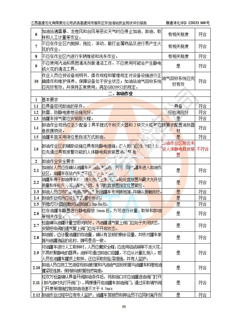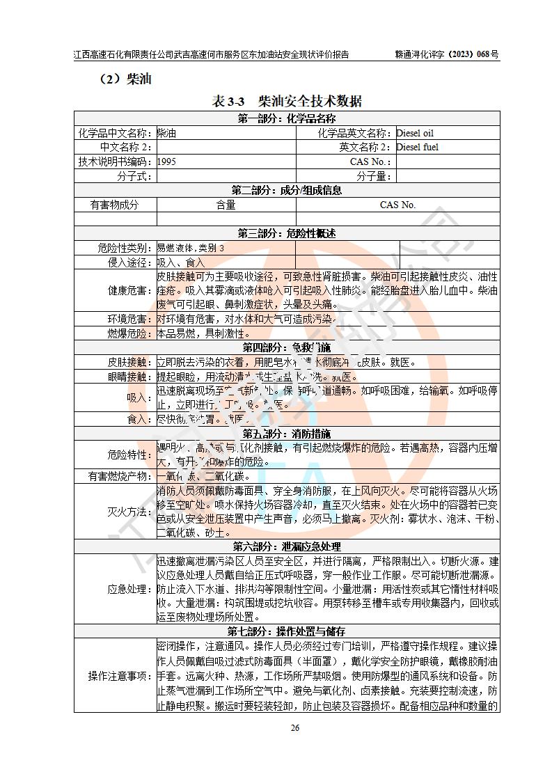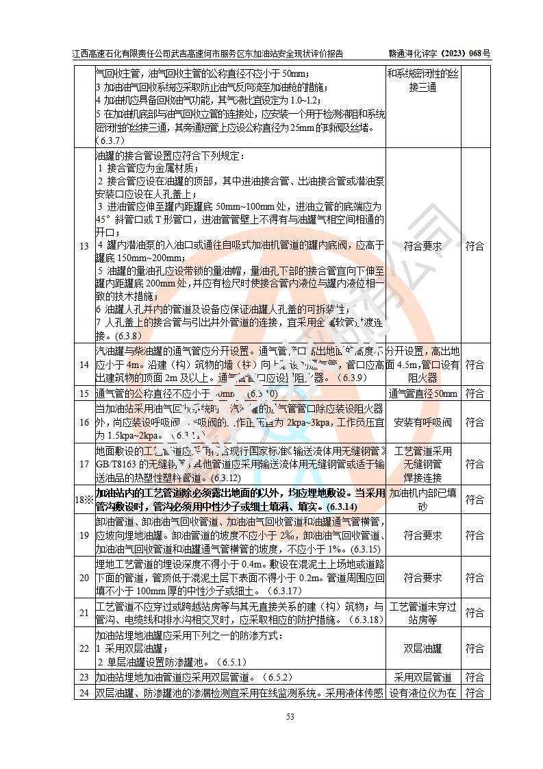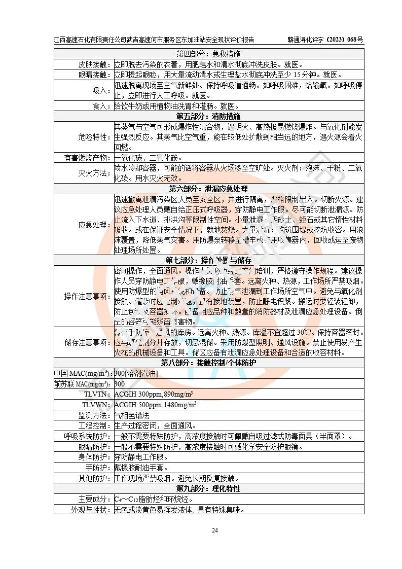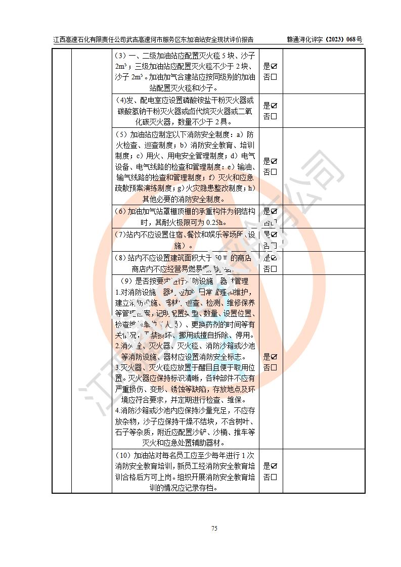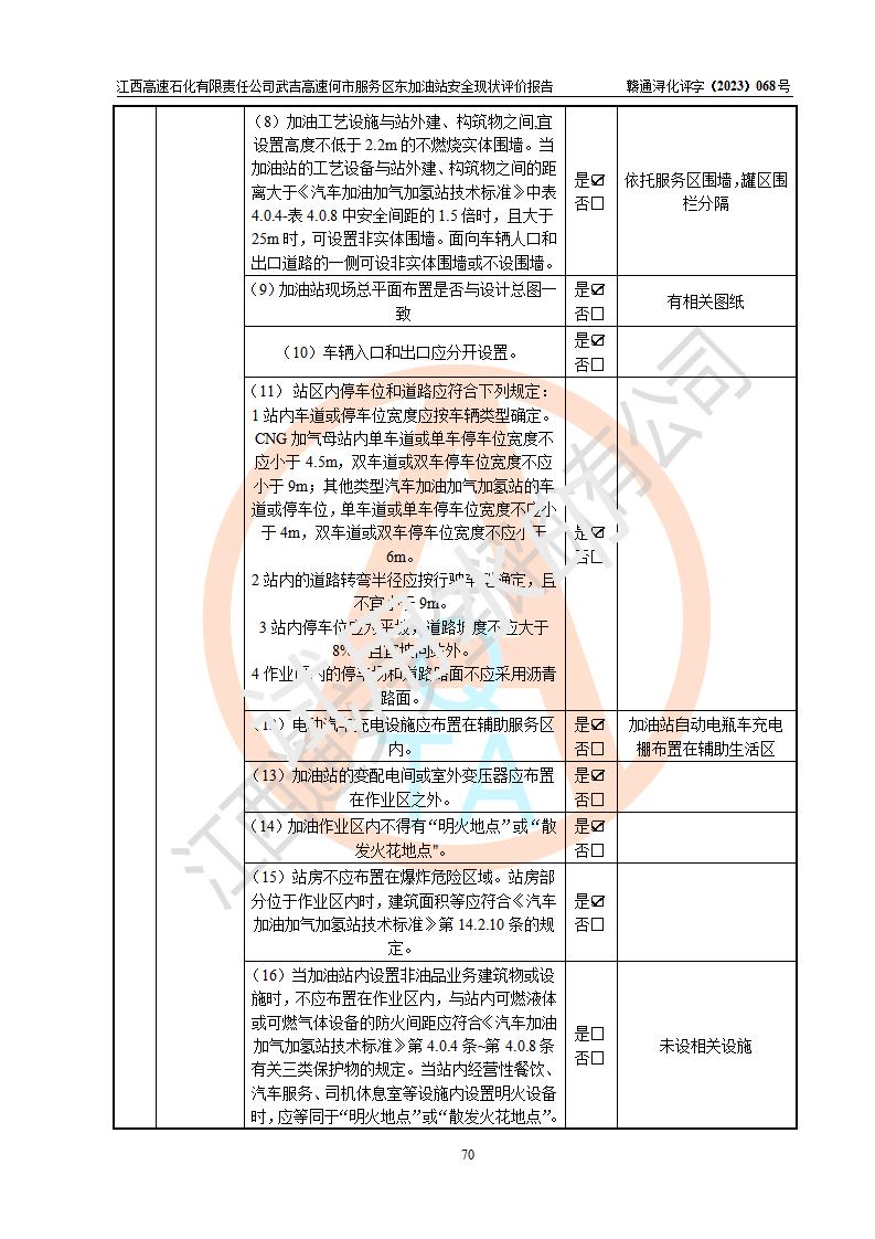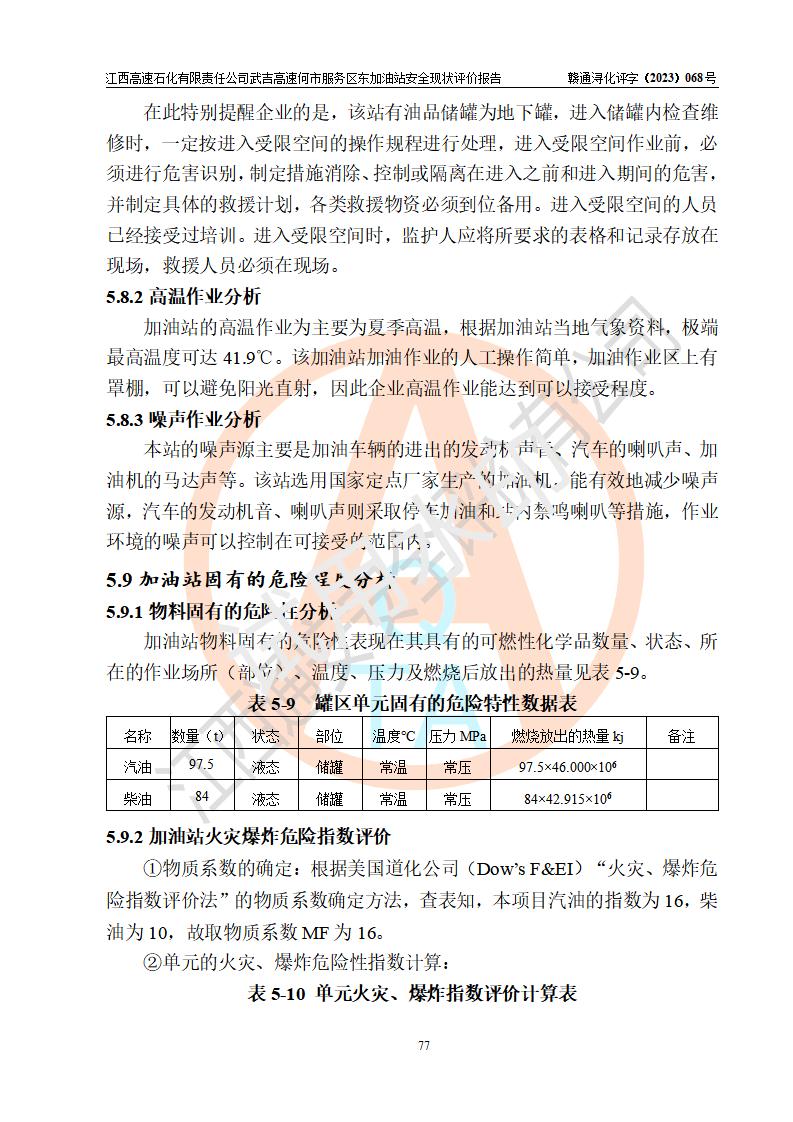 評價結(jié)論 | 江西高速石化有限責(zé)任公司武吉高速何市服務(wù)區(qū)東加油站涉及的安全條件、安全經(jīng)營條件、安全生產(chǎn)管理符合《危險化學(xué)品經(jīng)營許可證管理辦法》、《汽車加油加氣加氫站技術(shù)標(biāo)準(zhǔn)》等**有關(guān)法規(guī)、標(biāo)準(zhǔn)、規(guī)范要求,能滿足危險化學(xué)品經(jīng)營安全條件。 | |||