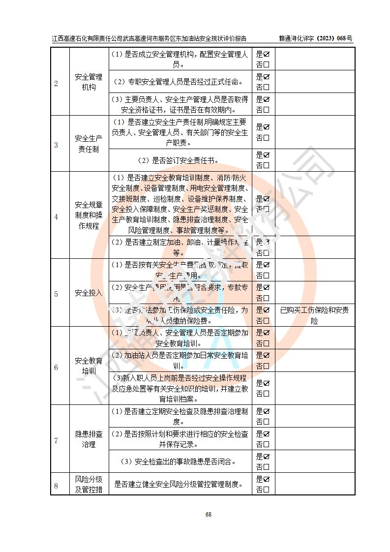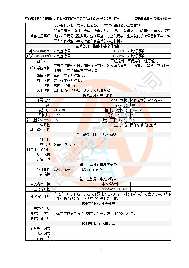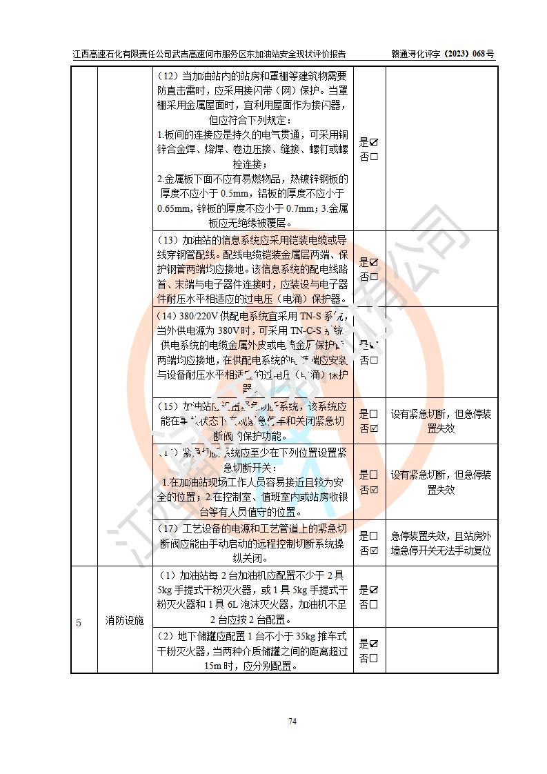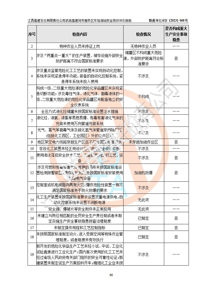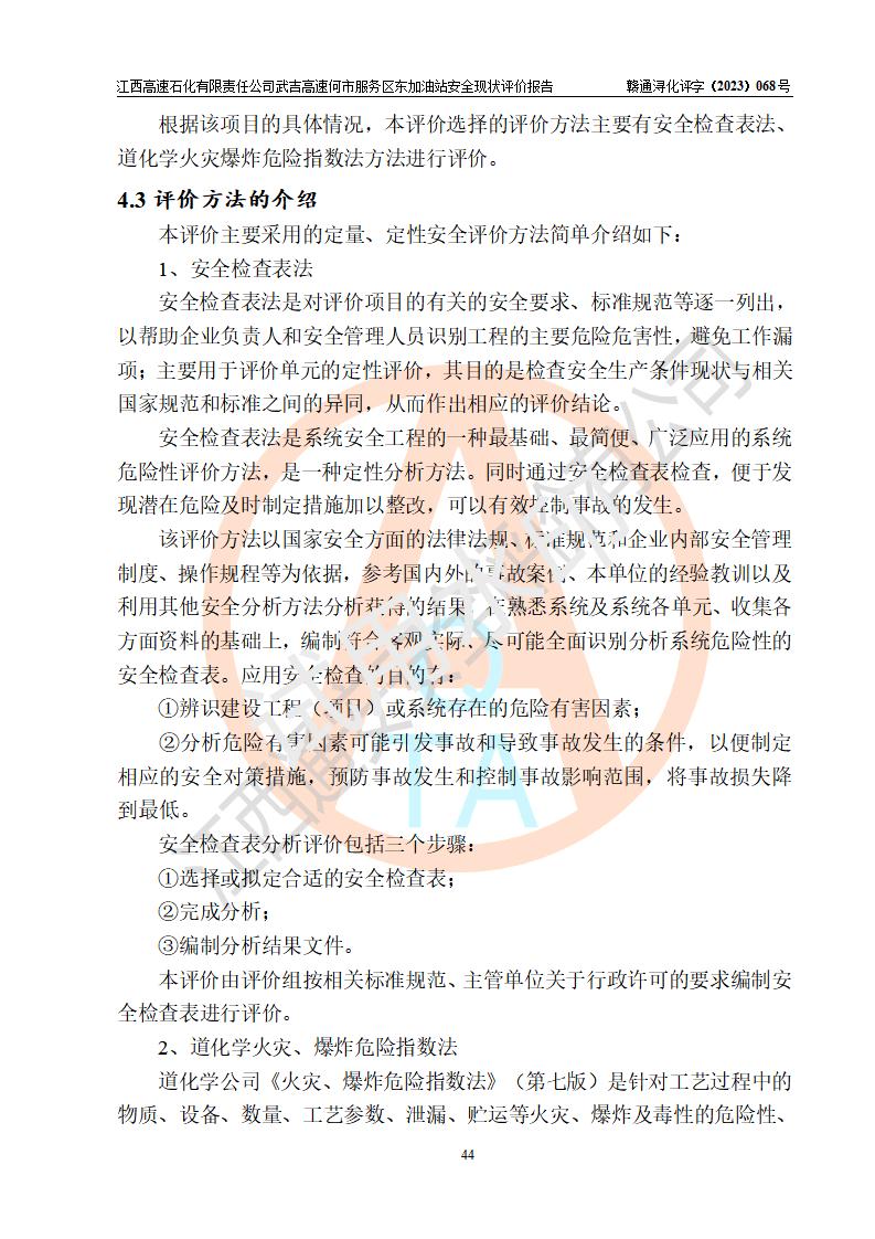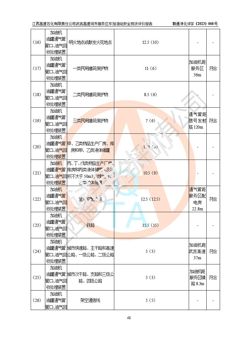 評價結(jié)論 | 江西高速石化有限責(zé)任公司武吉高速何市服務(wù)區(qū)東加油站涉及的安全條件、安全經(jīng)營條件、安全生產(chǎn)管理符合《危險化學(xué)品經(jīng)營許可證管理辦法》、《汽車加油加氣加氫站技術(shù)標(biāo)準(zhǔn)》等**有關(guān)法規(guī)、標(biāo)準(zhǔn)、規(guī)范要求,能滿足危險化學(xué)品經(jīng)營安全條件。 | |||
