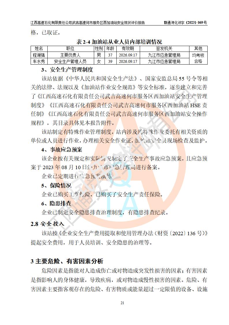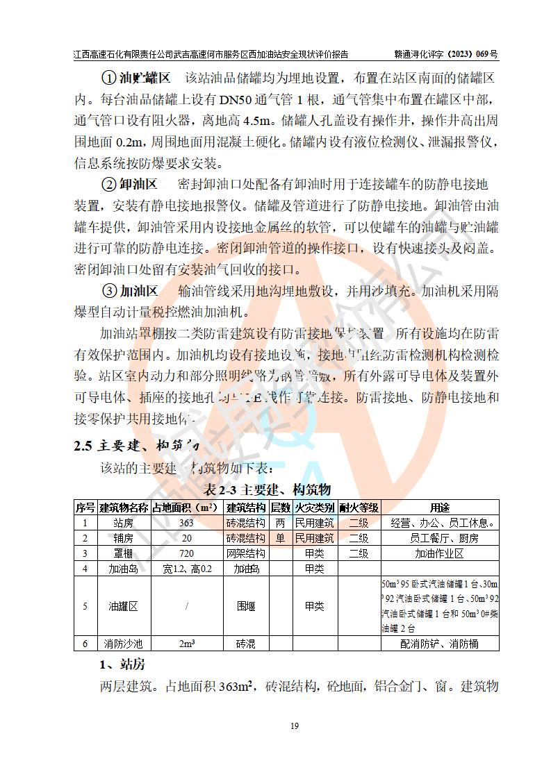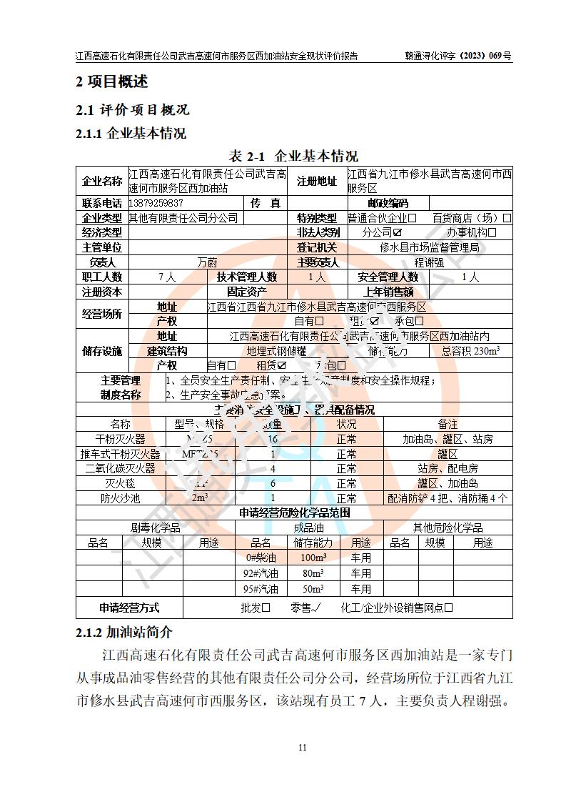 項(xiàng)目簡介 | 江西高速石化有限責(zé)任公司武吉高速何市服務(wù)區(qū)西加油站是一家專門從事成品油零售經(jīng)營的其他有限責(zé)任公司分公司,經(jīng)營場所位于江西省九江市修水縣武吉高速何市西服務(wù)區(qū),該站現(xiàn)有員工7人,主要負(fù)責(zé)人程謝強(qiáng)。 該加油站占地面積約1511.3m2,站內(nèi)設(shè)有地下直埋臥式雙層油罐5臺(tái),分別50m3汽油罐2臺(tái)、30m3汽油罐1臺(tái),50m3柴油罐2臺(tái),儲(chǔ)罐總?cè)莘e230m3,柴油罐容積折半計(jì)入油罐總?cè)莘e則為180m3,按現(xiàn)行《汽車加油加氣加氫站技術(shù)標(biāo)準(zhǔn)》對(duì)加油站的等級(jí)劃分原則,該站屬一級(jí)加油站。 該站由九江市行政審批局換發(fā)《危險(xiǎn)化學(xué)品經(jīng)營許可證》(證號(hào):贛九?;?jīng)字[2023]000093號(hào)),**期限2022年02月26日至2025年02月25日。 | |||