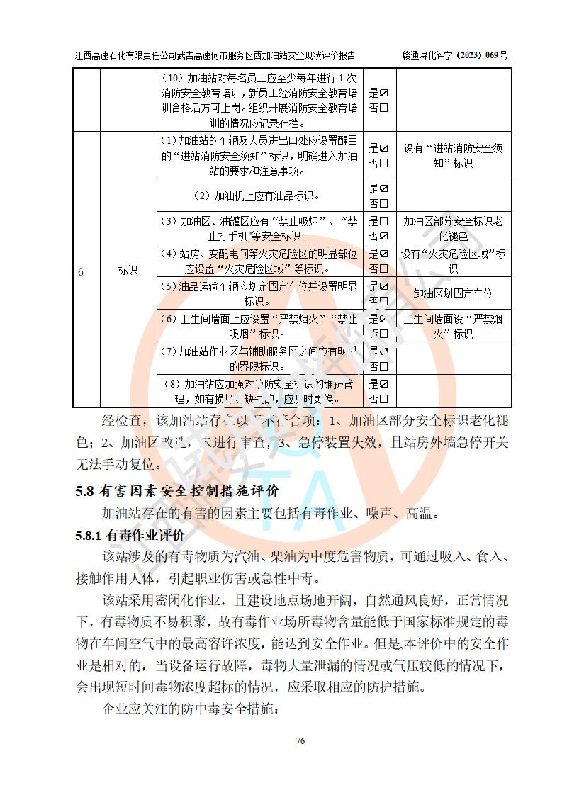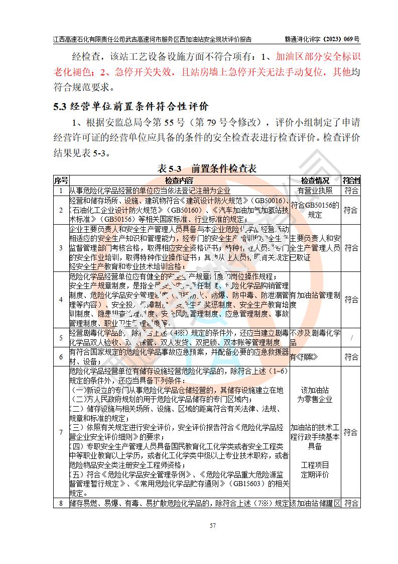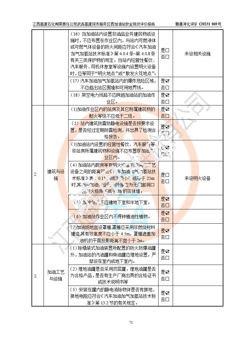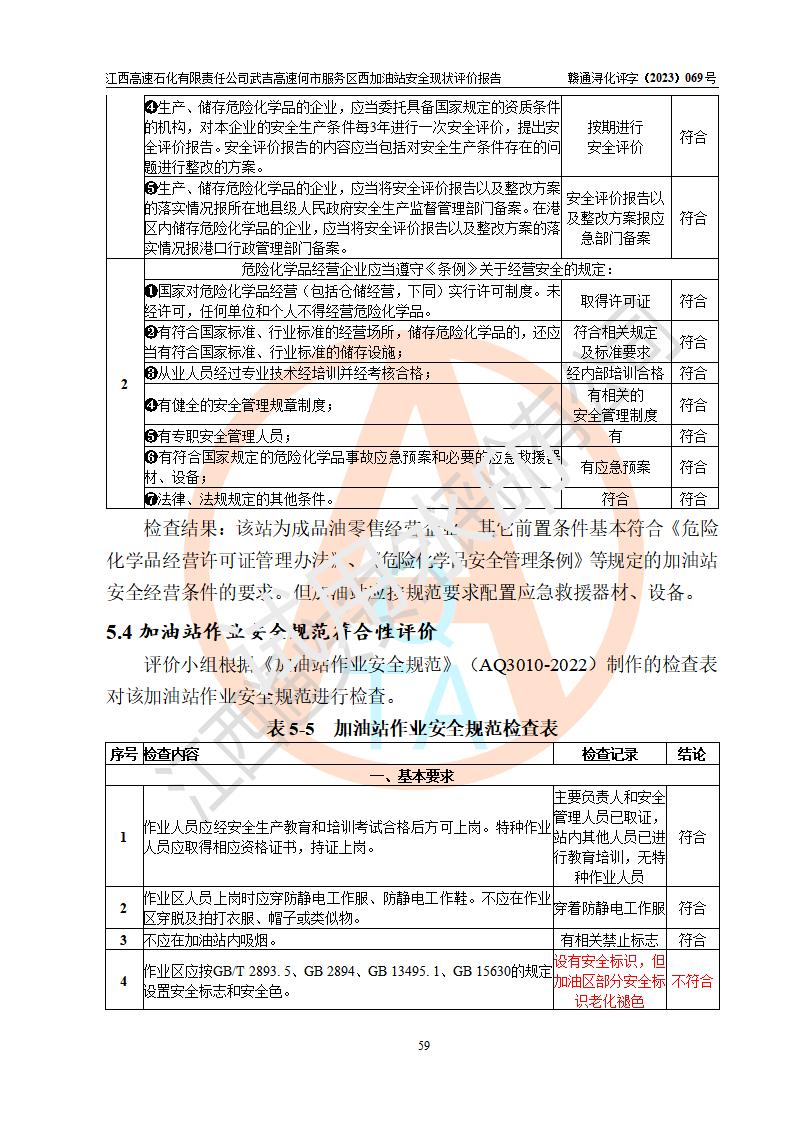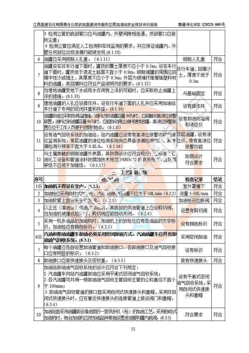 評(píng)價(jià)結(jié)論 | 江西高速石化有限責(zé)任公司武吉高速何市服務(wù)區(qū)西加油站涉及的安全條件、安全經(jīng)營條件、安全生產(chǎn)管理符合《危險(xiǎn)化學(xué)品經(jīng)營許可證管理辦法》、《汽車加油加氣加氫站技術(shù)標(biāo)準(zhǔn)》等**有關(guān)法規(guī)、標(biāo)準(zhǔn)、規(guī)范要求,能滿足危險(xiǎn)化學(xué)品經(jīng)營安全條件。 | |||