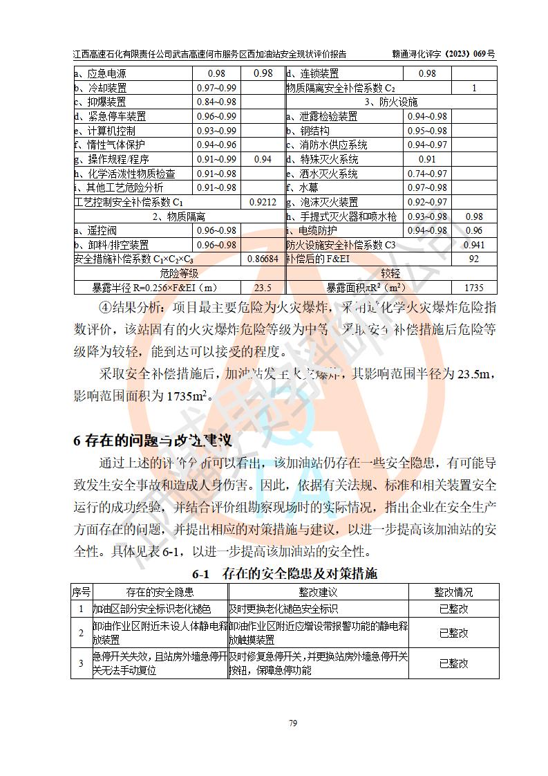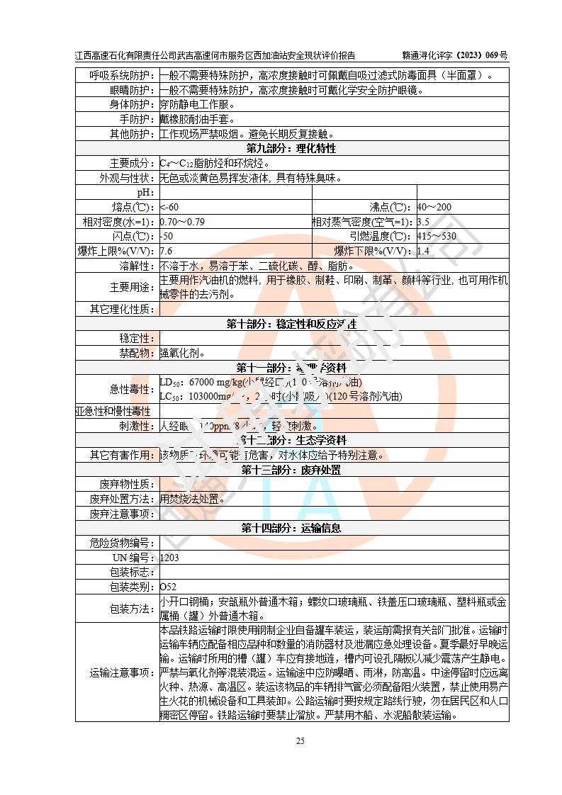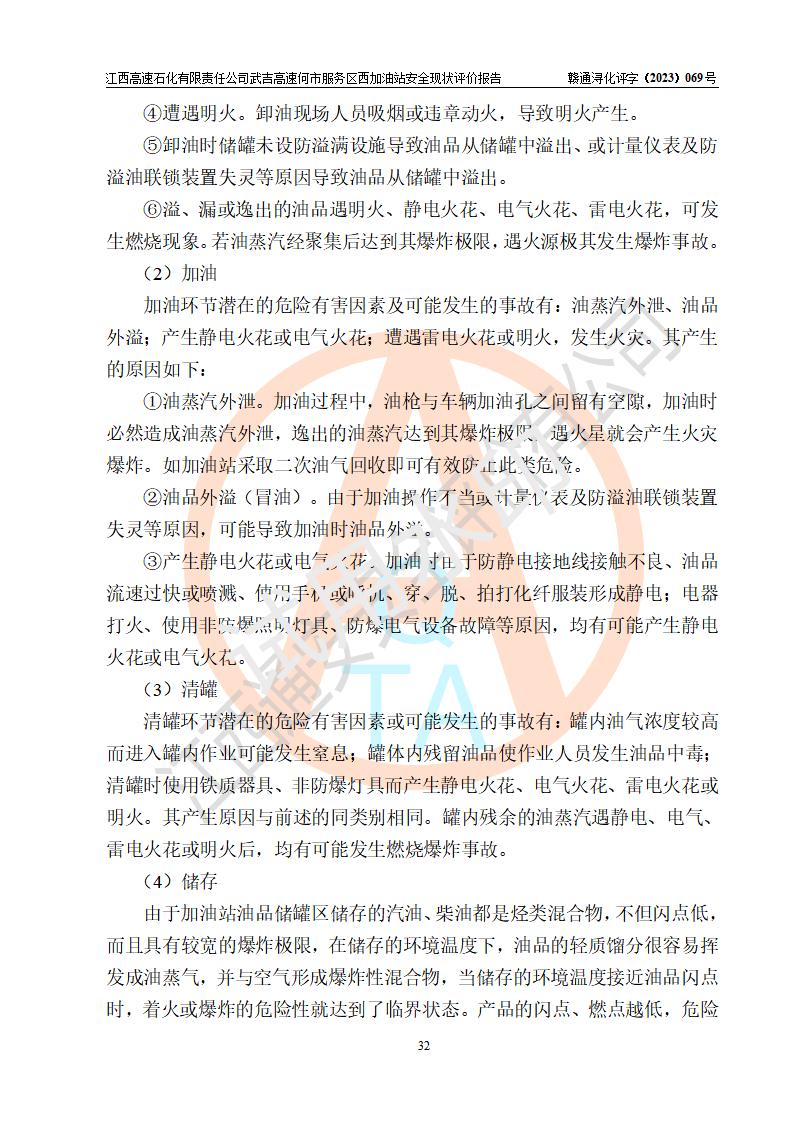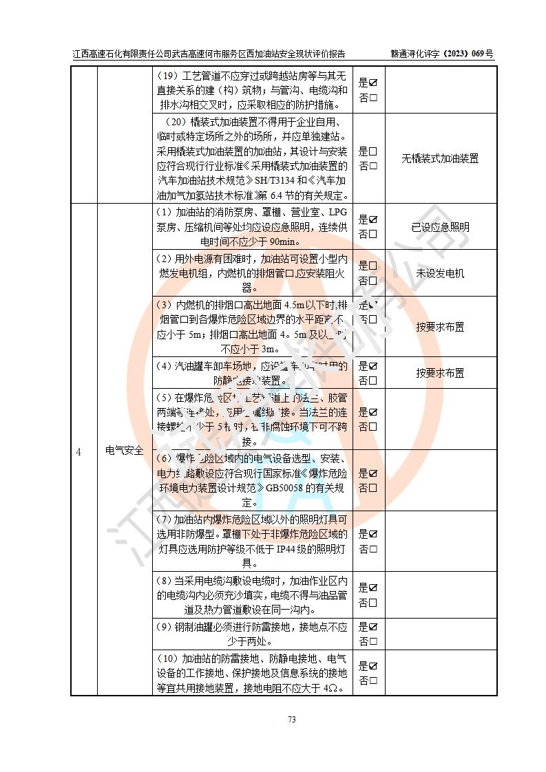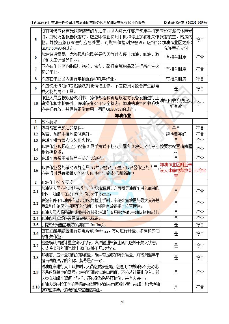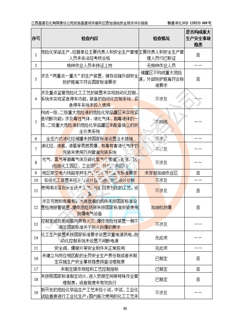 評(píng)價(jià)結(jié)論 | 江西高速石化有限責(zé)任公司武吉高速何市服務(wù)區(qū)西加油站涉及的安全條件、安全經(jīng)營條件、安全生產(chǎn)管理符合《危險(xiǎn)化學(xué)品經(jīng)營許可證管理辦法》、《汽車加油加氣加氫站技術(shù)標(biāo)準(zhǔn)》等**有關(guān)法規(guī)、標(biāo)準(zhǔn)、規(guī)范要求,能滿足危險(xiǎn)化學(xué)品經(jīng)營安全條件。 | |||