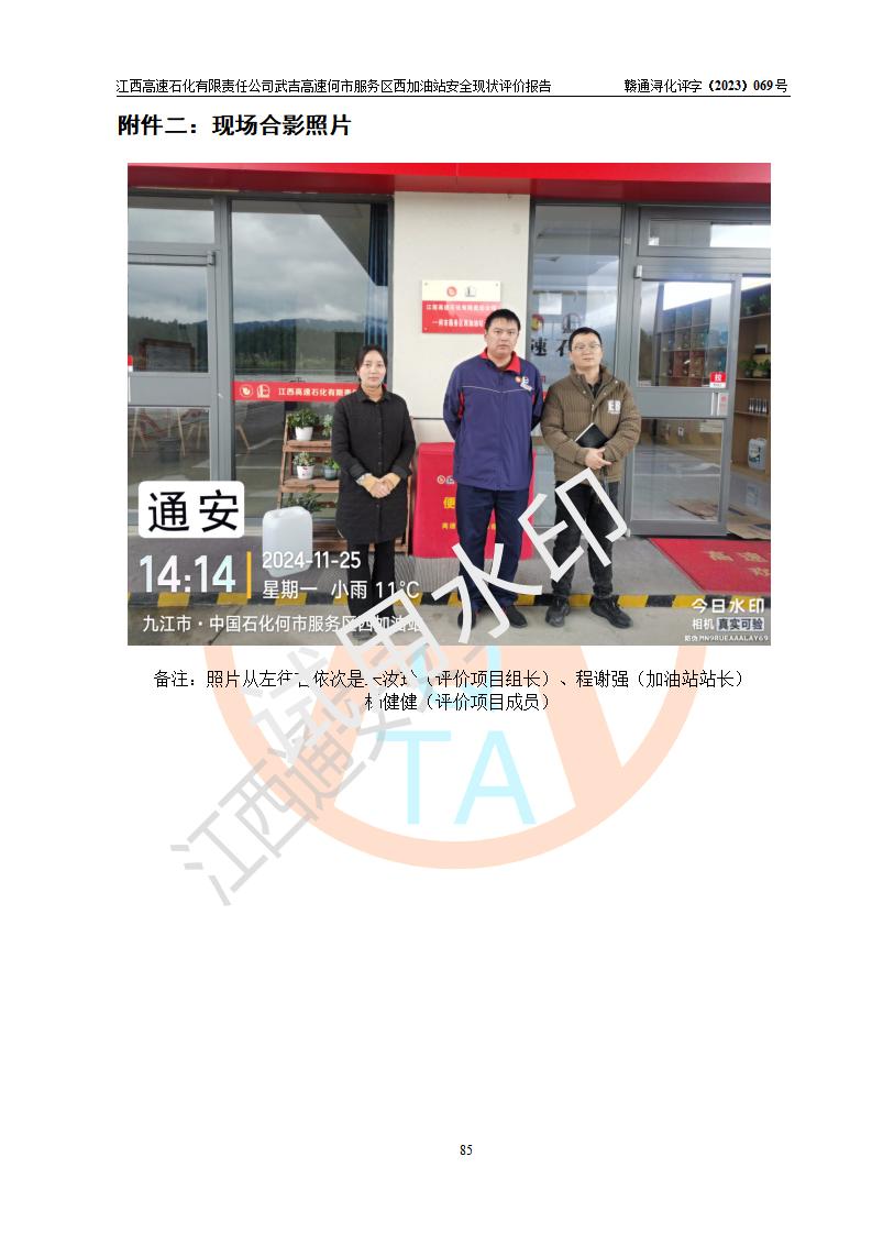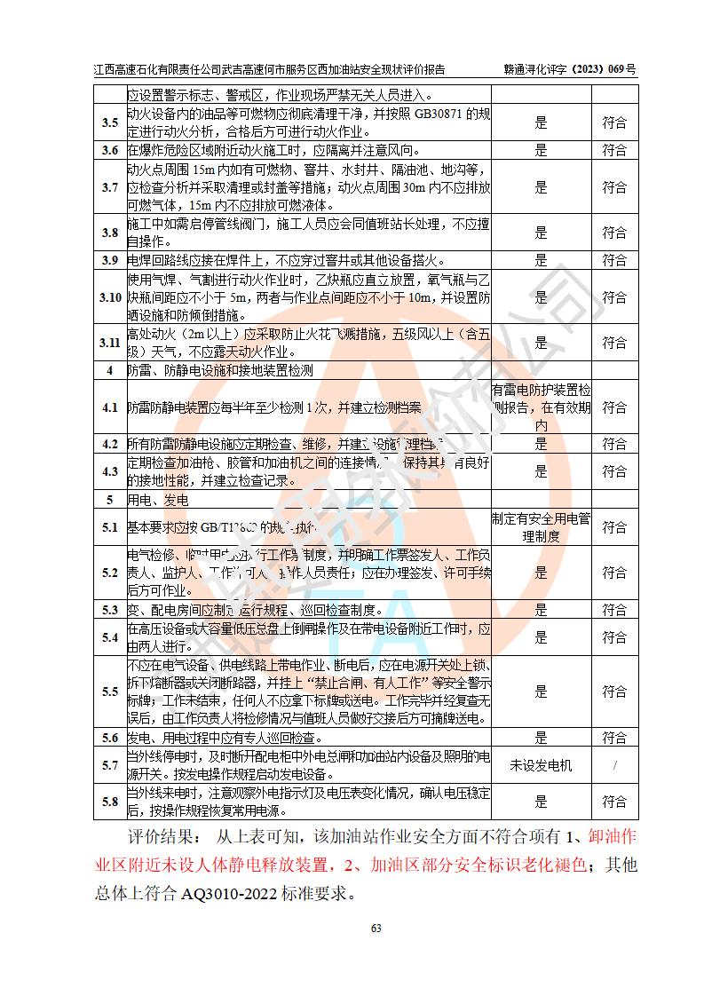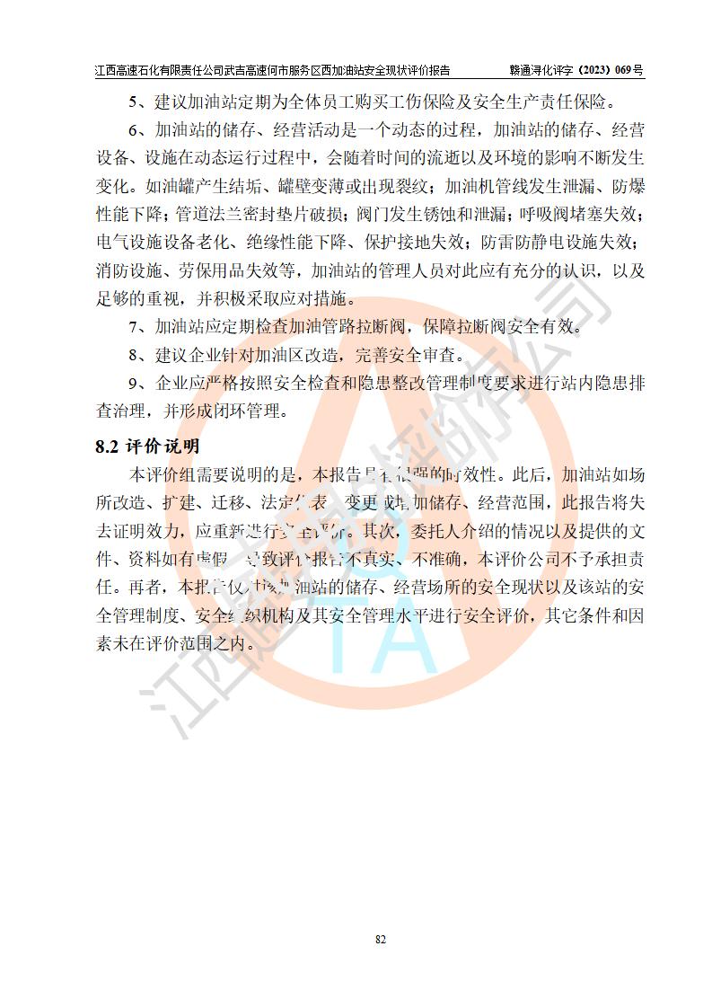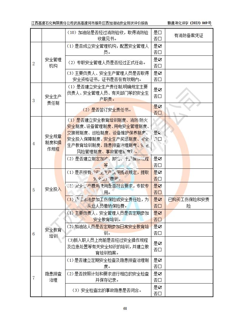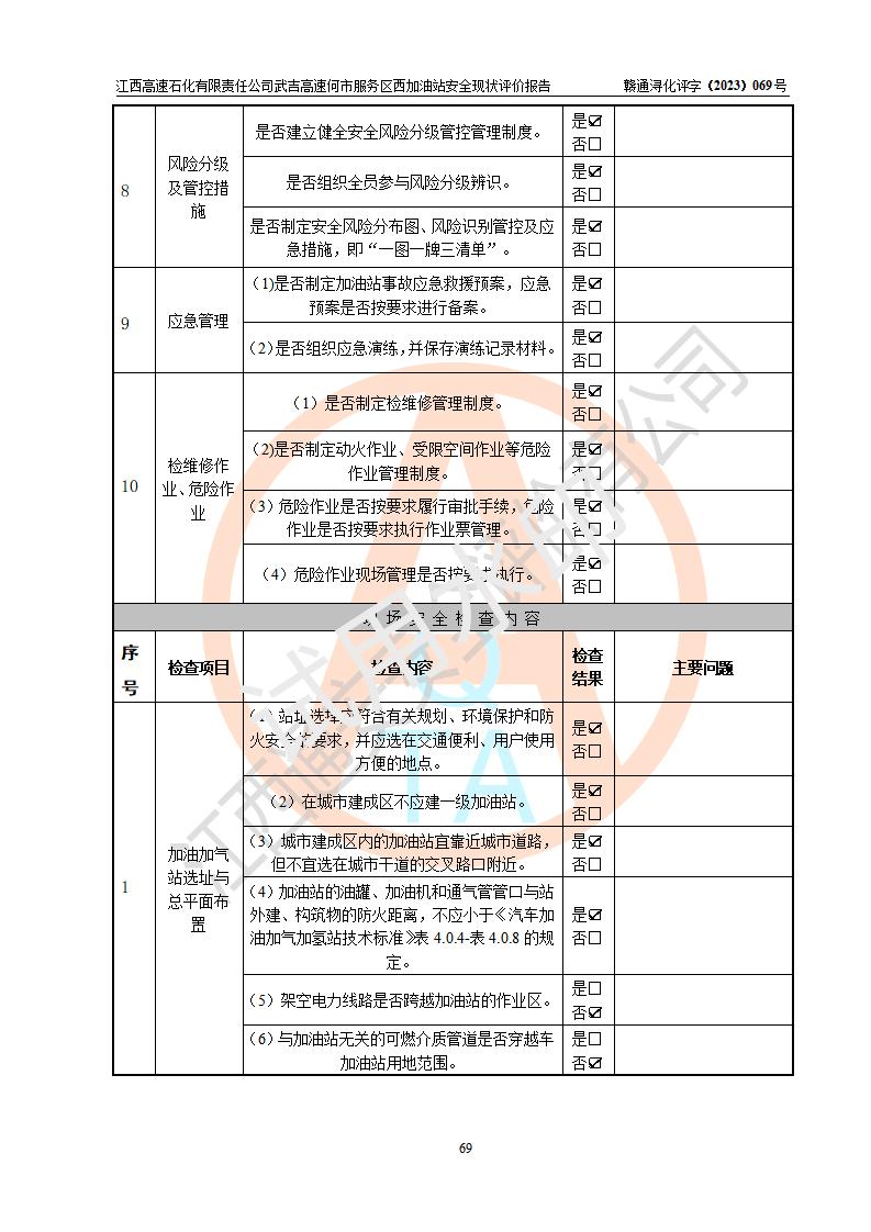 評(píng)價(jià)結(jié)論 | 江西高速石化有限責(zé)任公司武吉高速何市服務(wù)區(qū)西加油站涉及的安全條件、安全經(jīng)營條件、安全生產(chǎn)管理符合《危險(xiǎn)化學(xué)品經(jīng)營許可證管理辦法》、《汽車加油加氣加氫站技術(shù)標(biāo)準(zhǔn)》等**有關(guān)法規(guī)、標(biāo)準(zhǔn)、規(guī)范要求,能滿足危險(xiǎn)化學(xué)品經(jīng)營安全條件。 | |||