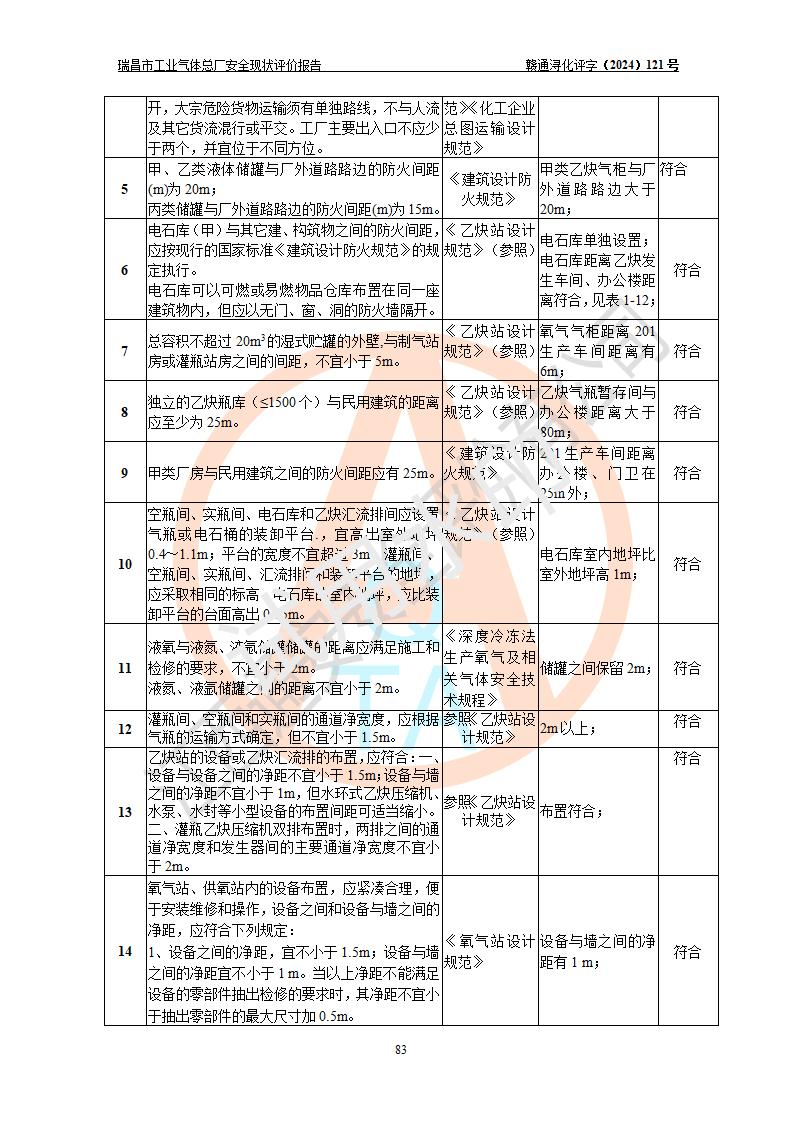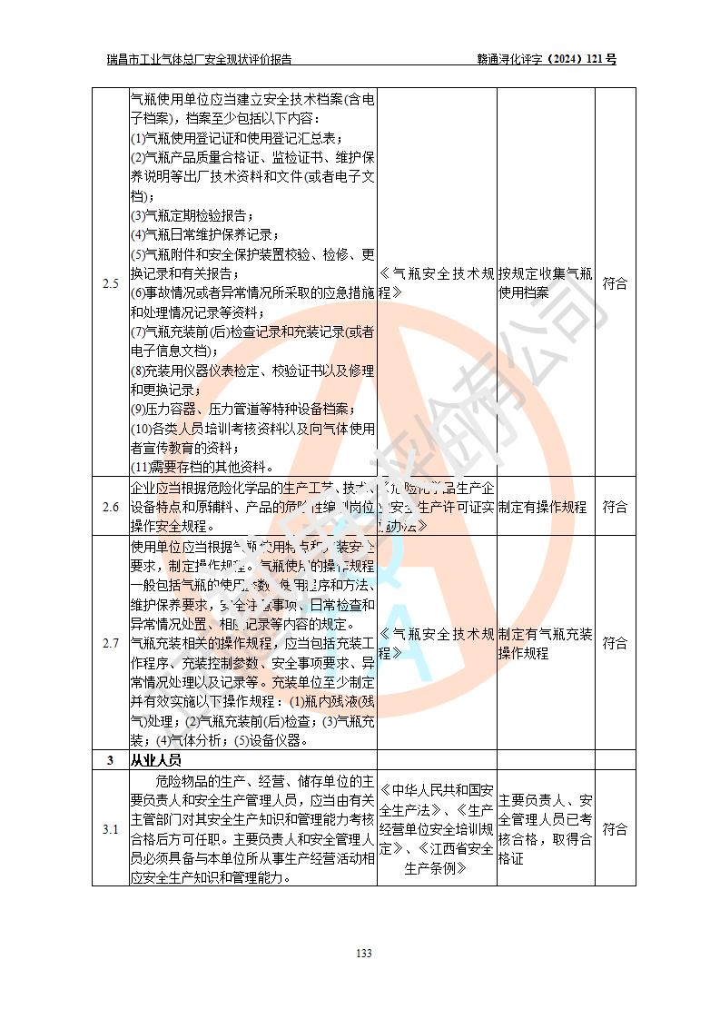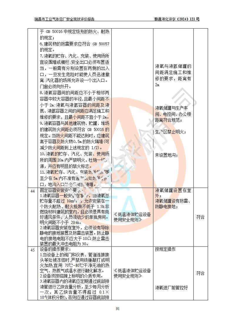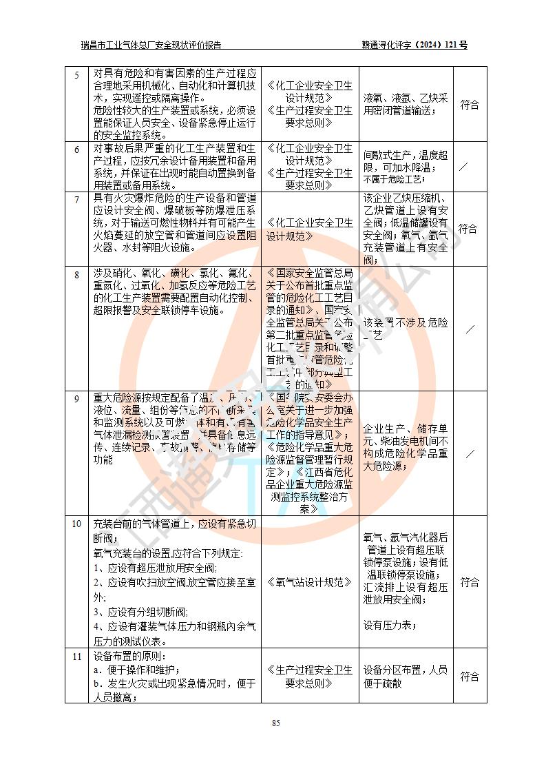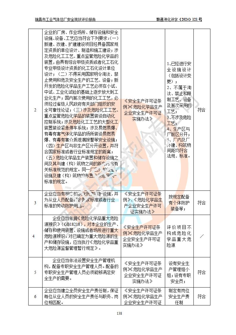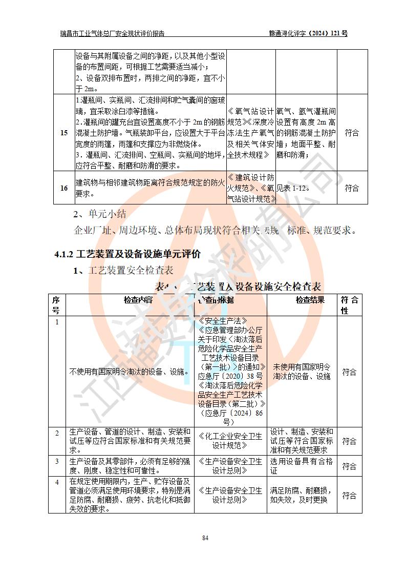 評價結(jié)論 | 瑞昌市工業(yè)氣體總廠廠址、總體布局、設(shè)備布置情況與設(shè)計圖紙一致,在役裝置不涉及危險工藝、重大危險源,企業(yè)主要負責人、安全負責人有相關(guān)化學專業(yè)學歷,且有3年以上化工行業(yè)從業(yè)經(jīng)歷,企業(yè)法人**及安全負責人已取得安全考核合格證。瑞昌市工業(yè)氣體總廠在役裝置配套安全裝置、及采取的安全技術(shù)措施符合**有關(guān)法規(guī)、標準、規(guī)范要求,符合《危險化學品生產(chǎn)企業(yè)安全生產(chǎn)許可證實施辦法》規(guī)定的安全生產(chǎn)條件,風險可控,可滿足安全生產(chǎn)要求。 | ||||