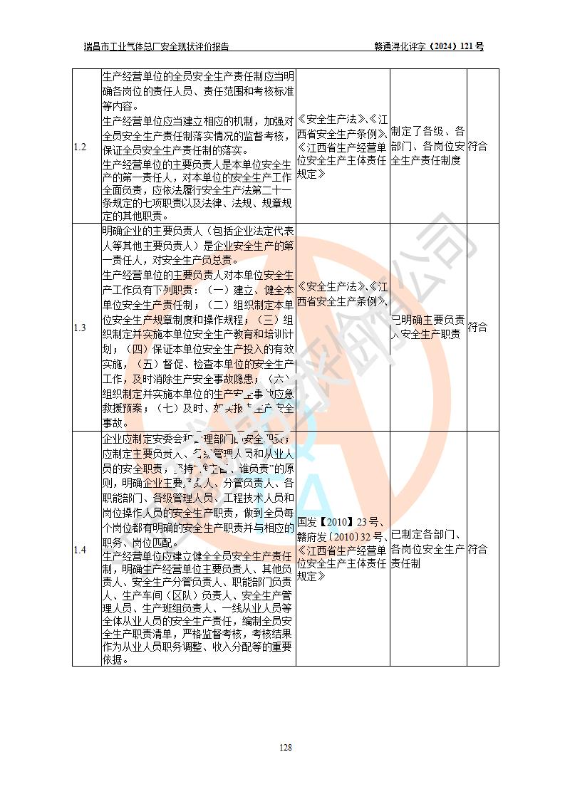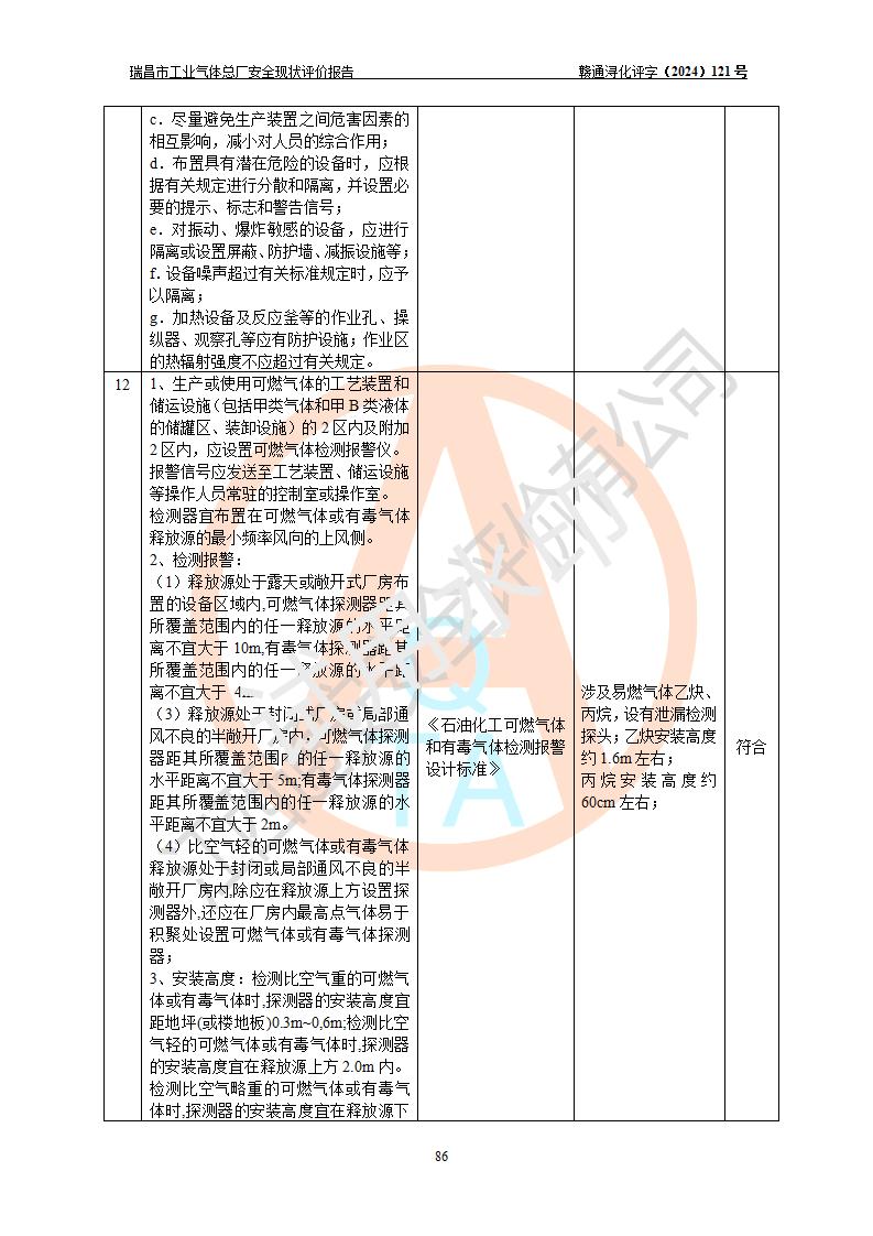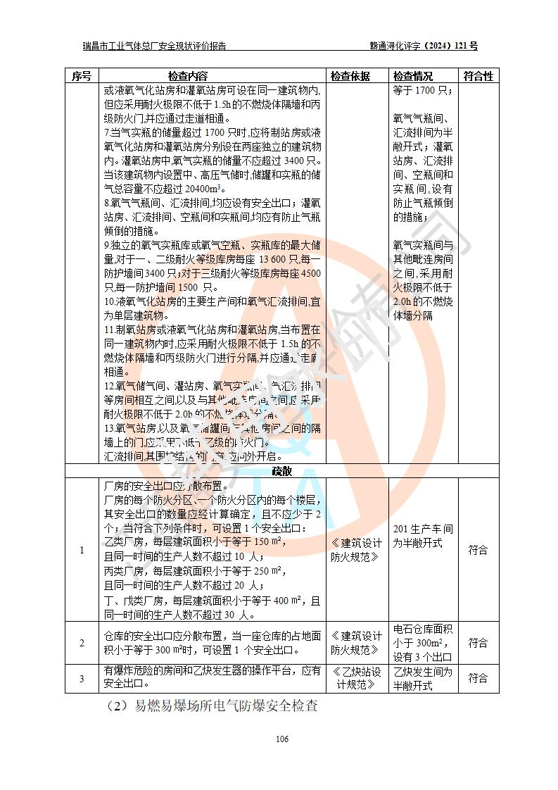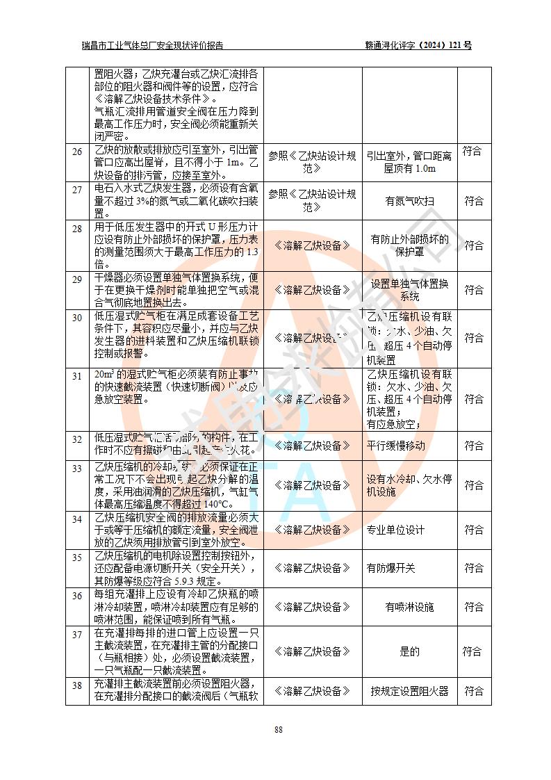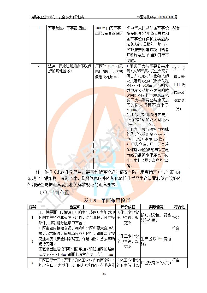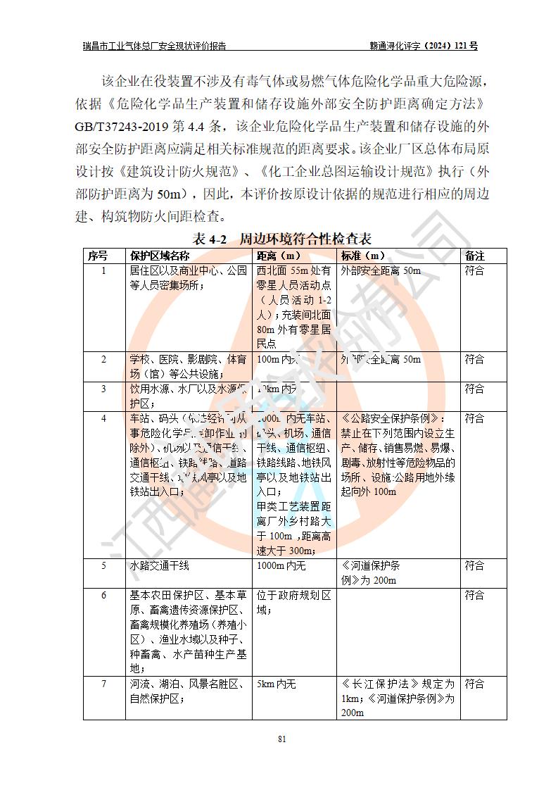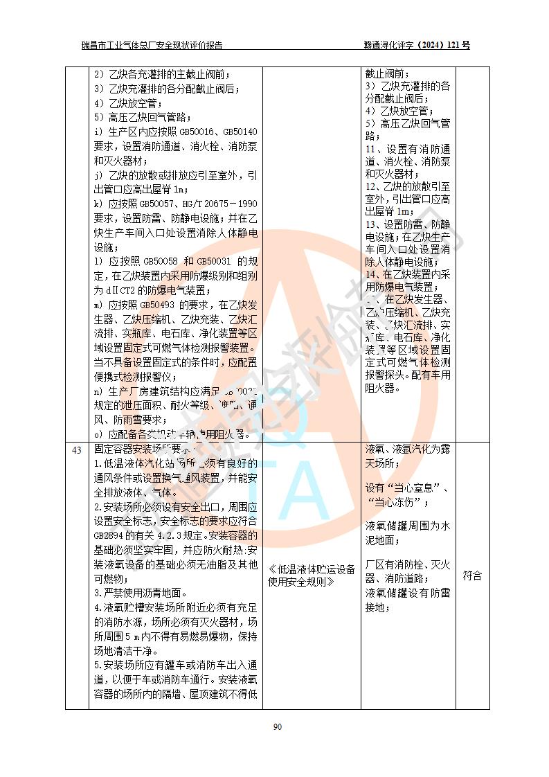 評價結(jié)論 | 瑞昌市工業(yè)氣體總廠廠址、總體布局、設(shè)備布置情況與設(shè)計圖紙一致,在役裝置不涉及危險工藝、重大危險源,企業(yè)主要負責人、安全負責人有相關(guān)化學專業(yè)學歷,且有3年以上化工行業(yè)從業(yè)經(jīng)歷,企業(yè)法人**及安全負責人已取得安全考核合格證。瑞昌市工業(yè)氣體總廠在役裝置配套安全裝置、及采取的安全技術(shù)措施符合**有關(guān)法規(guī)、標準、規(guī)范要求,符合《危險化學品生產(chǎn)企業(yè)安全生產(chǎn)許可證實施辦法》規(guī)定的安全生產(chǎn)條件,風險可控,可滿足安全生產(chǎn)要求。 | ||||