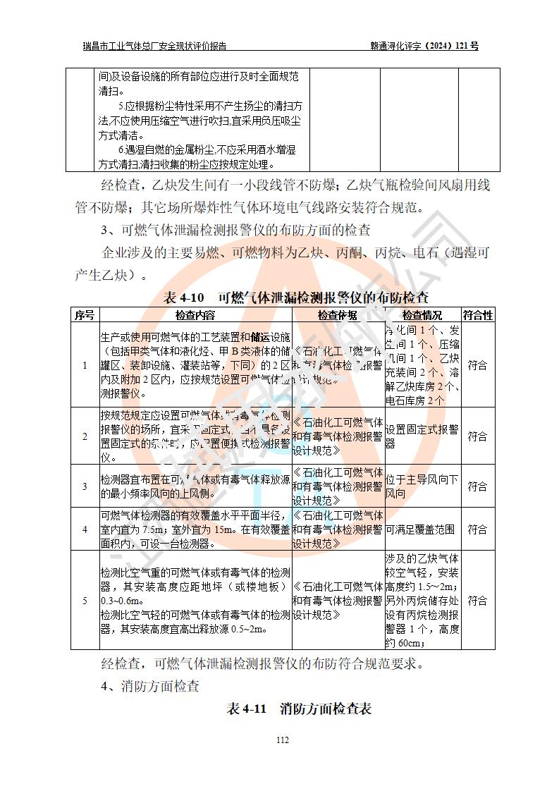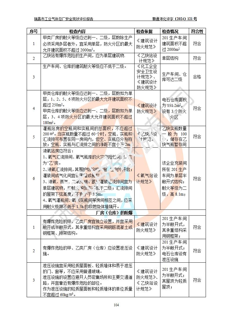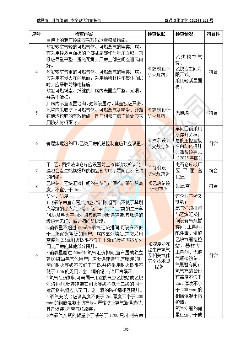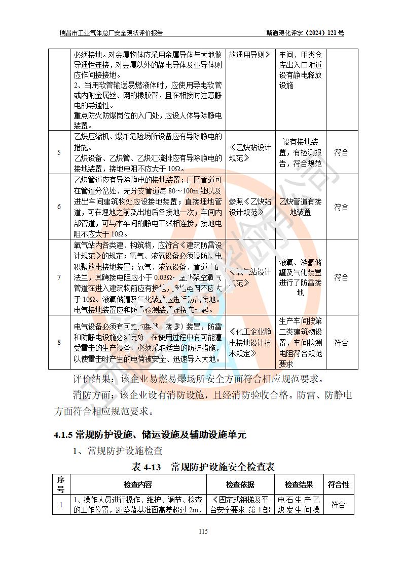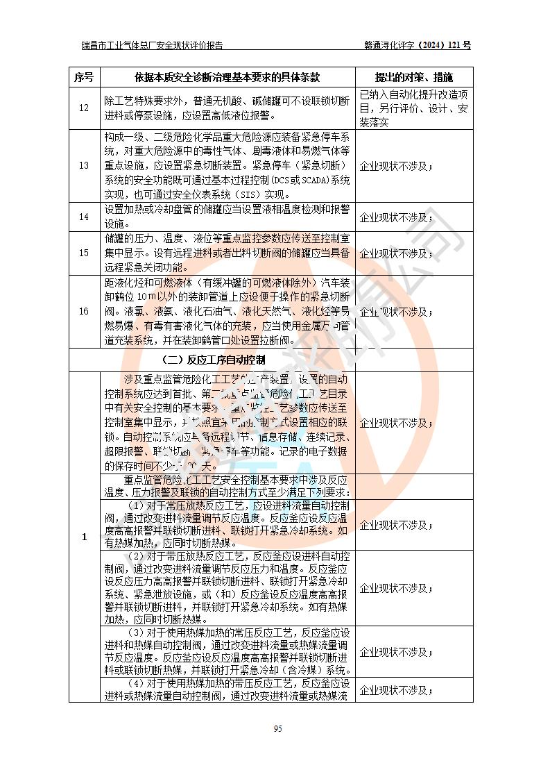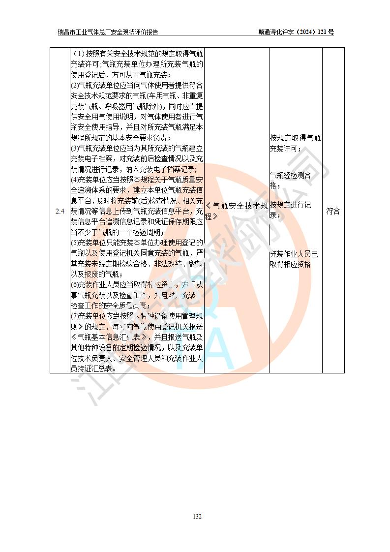 評價結(jié)論 | 瑞昌市工業(yè)氣體總廠廠址、總體布局、設(shè)備布置情況與設(shè)計圖紙一致,在役裝置不涉及危險工藝、重大危險源,企業(yè)主要負責人、安全負責人有相關(guān)化學專業(yè)學歷,且有3年以上化工行業(yè)從業(yè)經(jīng)歷,企業(yè)法人**及安全負責人已取得安全考核合格證。瑞昌市工業(yè)氣體總廠在役裝置配套安全裝置、及采取的安全技術(shù)措施符合**有關(guān)法規(guī)、標準、規(guī)范要求,符合《危險化學品生產(chǎn)企業(yè)安全生產(chǎn)許可證實施辦法》規(guī)定的安全生產(chǎn)條件,風險可控,可滿足安全生產(chǎn)要求。 | ||||
