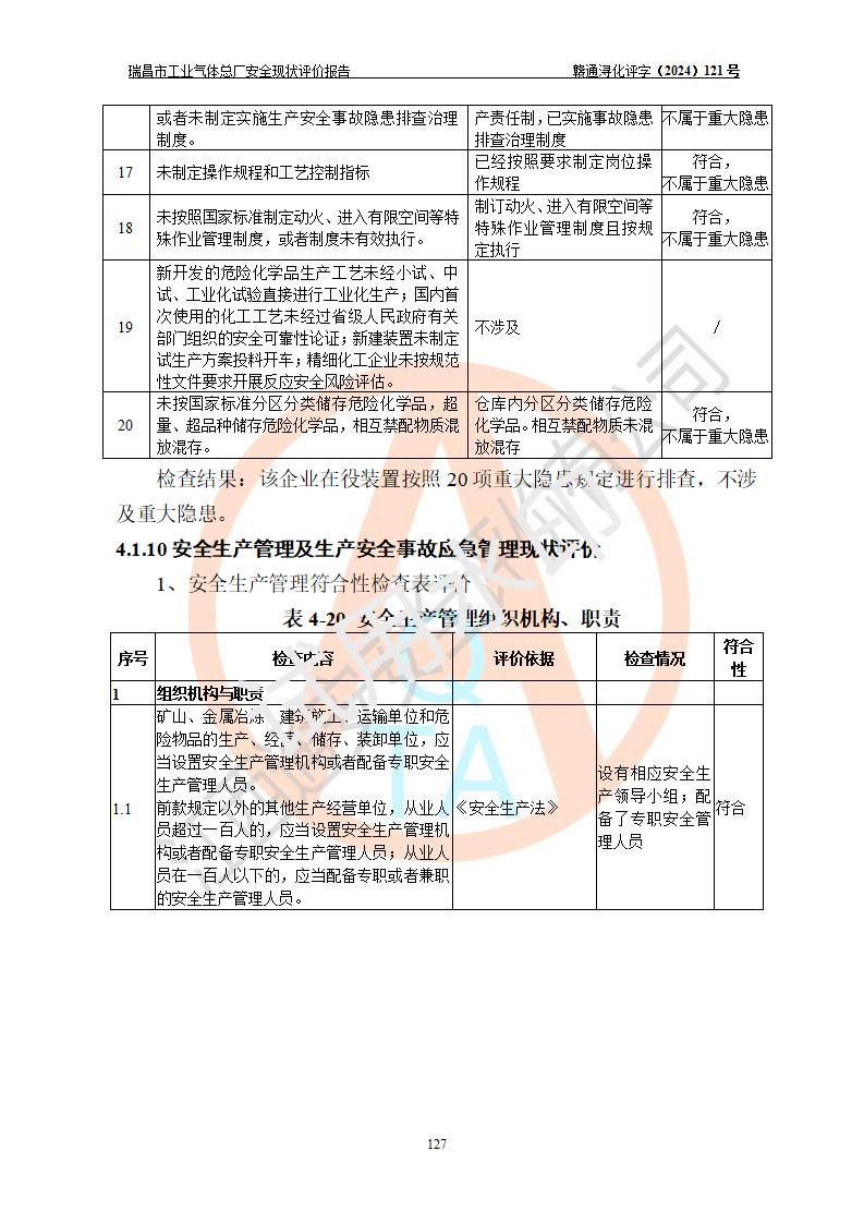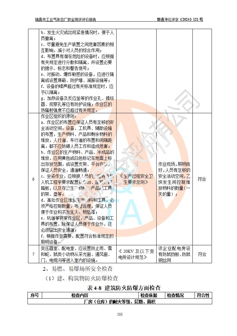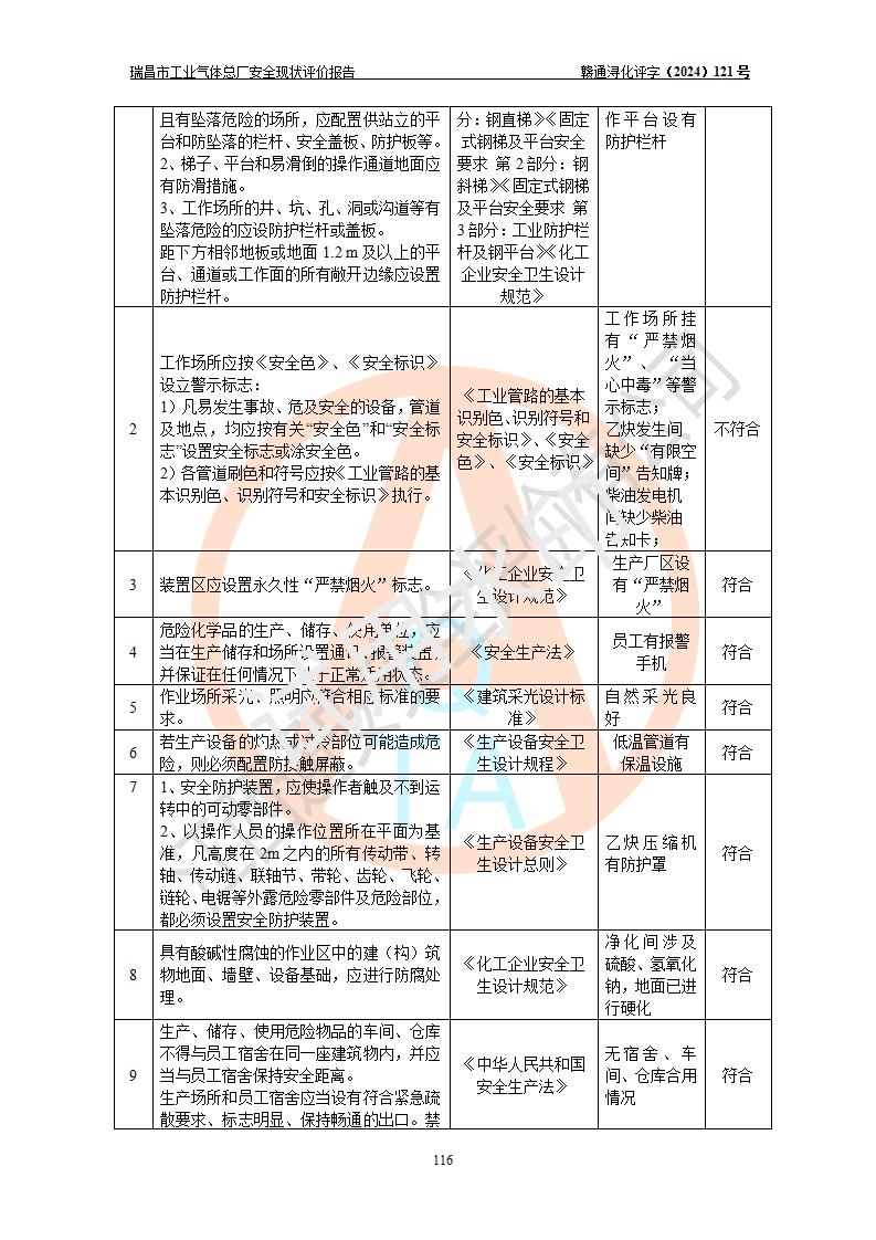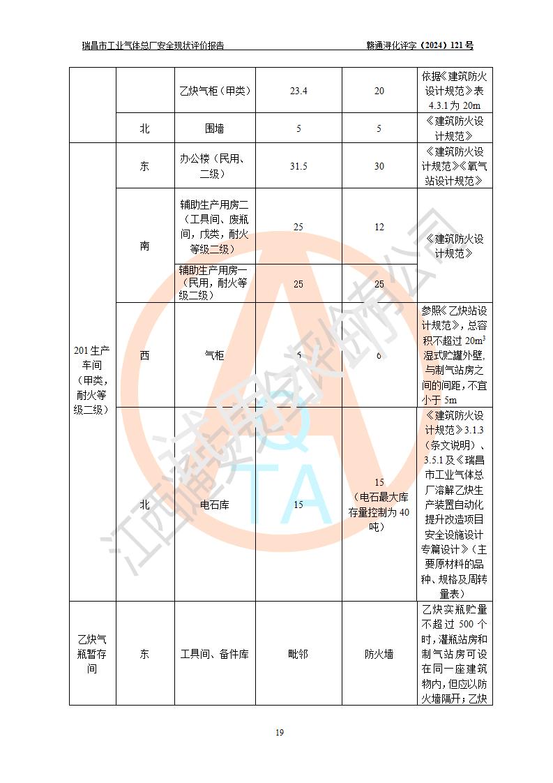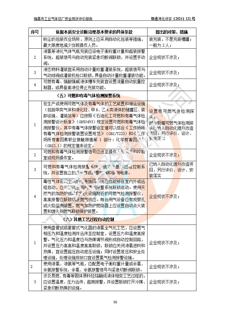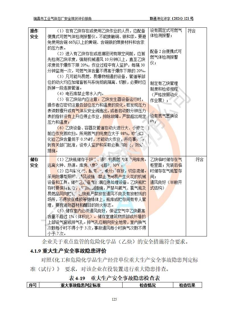 評價結(jié)論 | 瑞昌市工業(yè)氣體總廠廠址、總體布局、設(shè)備布置情況與設(shè)計圖紙一致,在役裝置不涉及危險工藝、重大危險源,企業(yè)主要負責人、安全負責人有相關(guān)化學專業(yè)學歷,且有3年以上化工行業(yè)從業(yè)經(jīng)歷,企業(yè)法人**及安全負責人已取得安全考核合格證。瑞昌市工業(yè)氣體總廠在役裝置配套安全裝置、及采取的安全技術(shù)措施符合**有關(guān)法規(guī)、標準、規(guī)范要求,符合《危險化學品生產(chǎn)企業(yè)安全生產(chǎn)許可證實施辦法》規(guī)定的安全生產(chǎn)條件,風險可控,可滿足安全生產(chǎn)要求。 | ||||