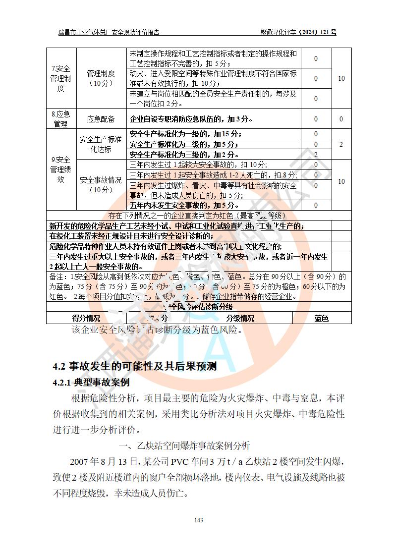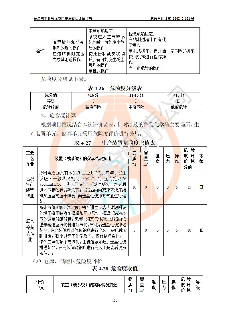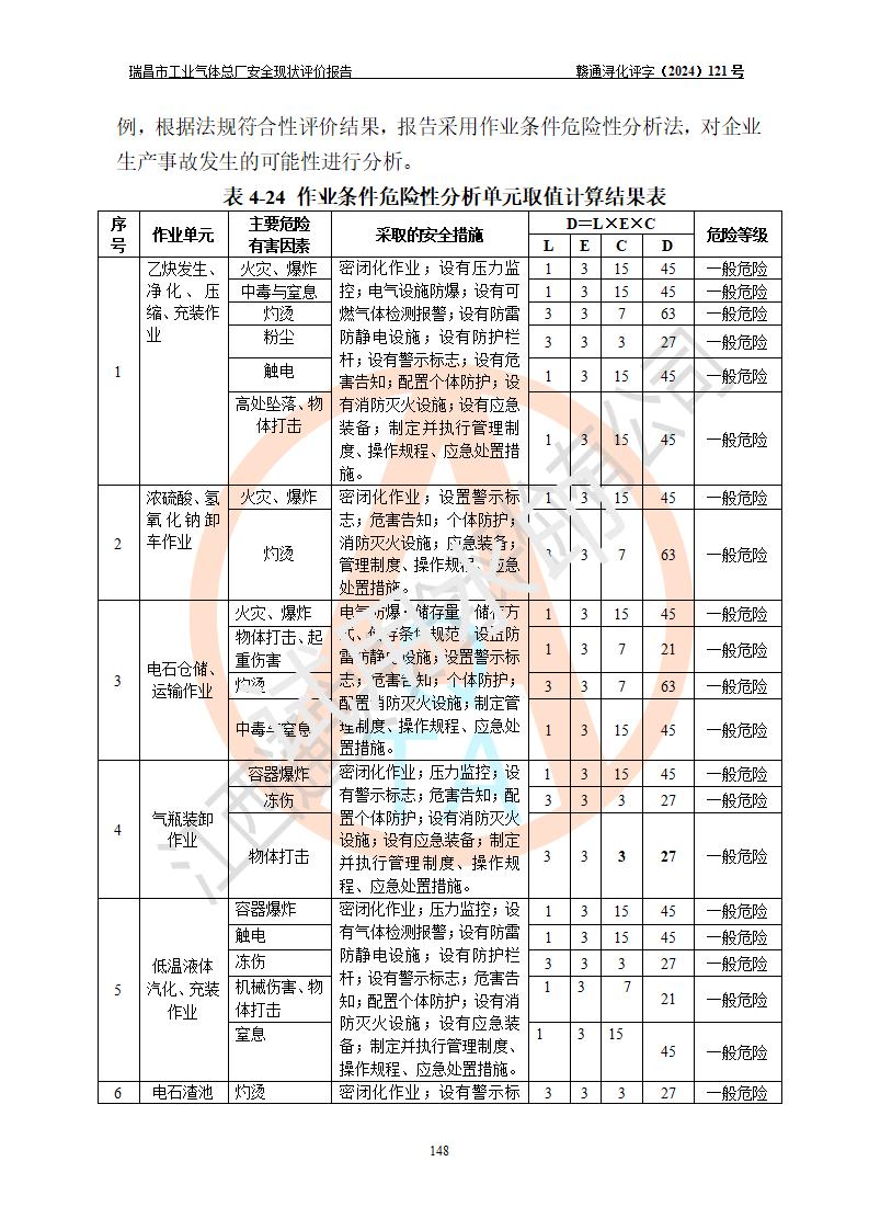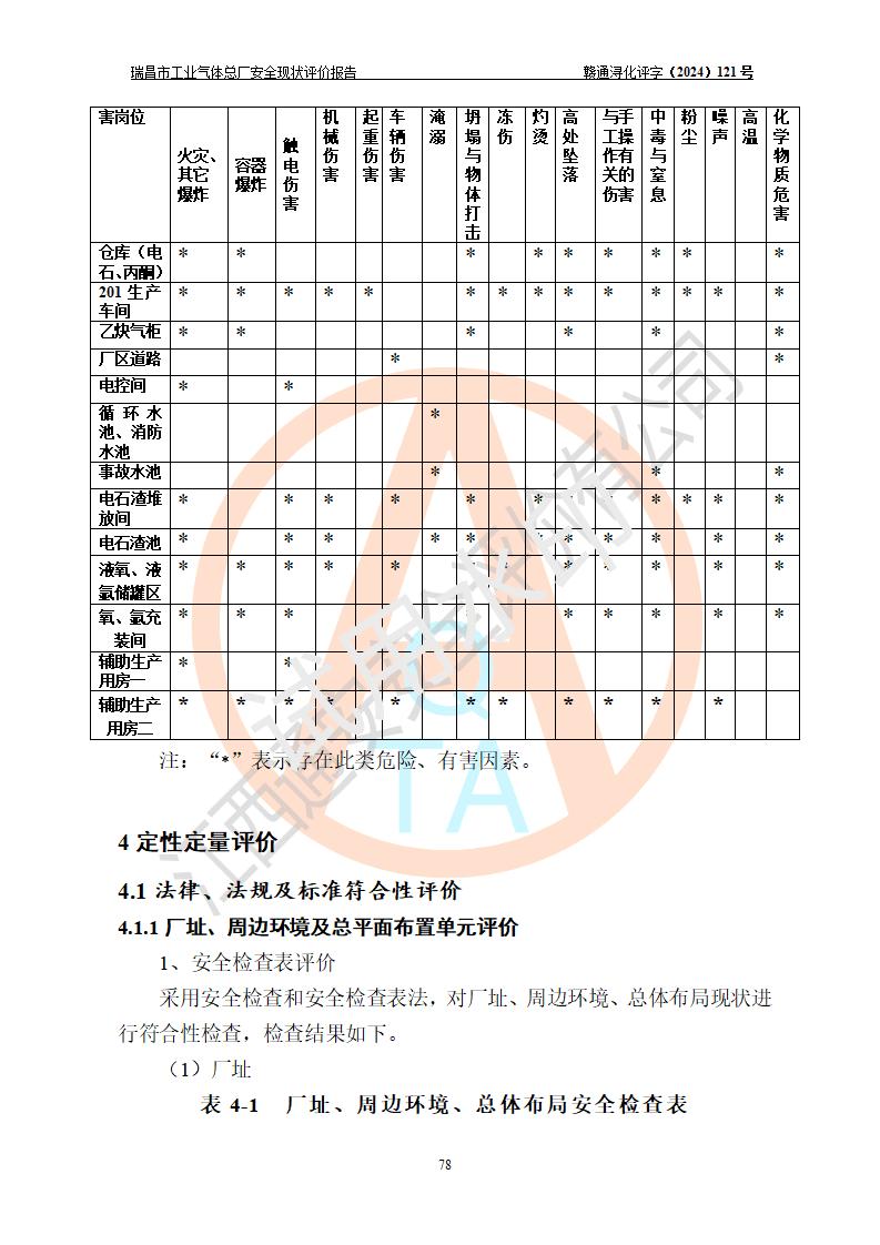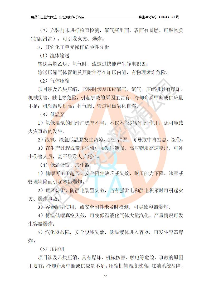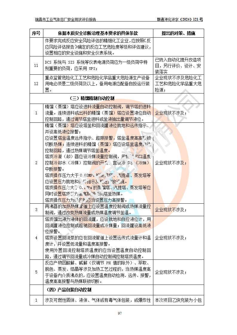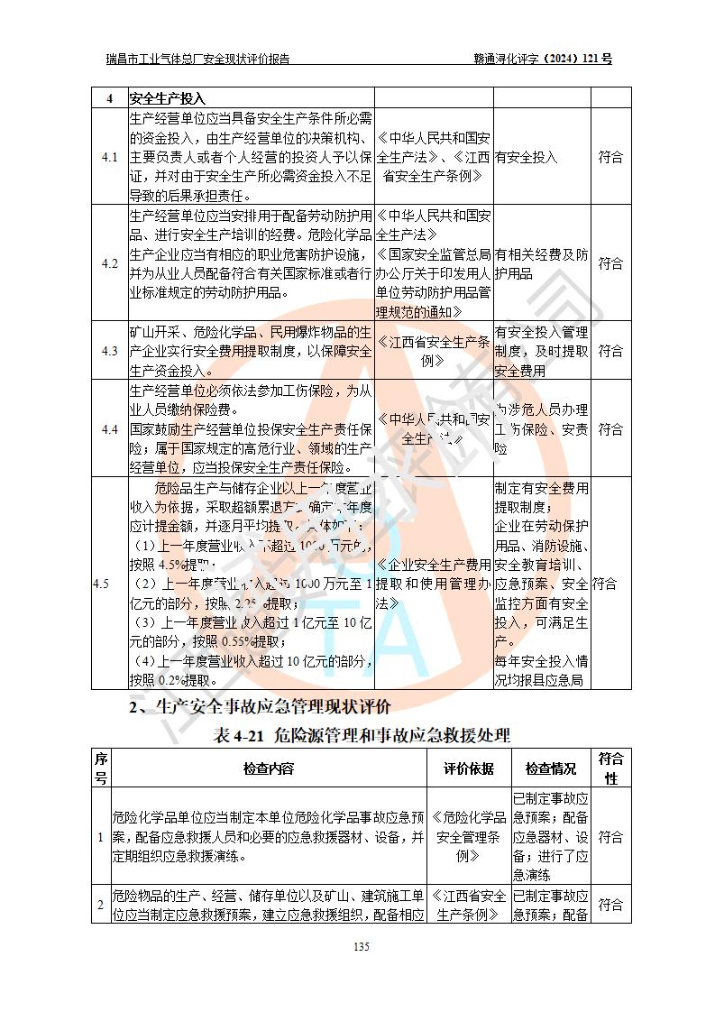 評價結(jié)論 | 瑞昌市工業(yè)氣體總廠廠址、總體布局、設(shè)備布置情況與設(shè)計圖紙一致,在役裝置不涉及危險工藝、重大危險源,企業(yè)主要負責人、安全負責人有相關(guān)化學專業(yè)學歷,且有3年以上化工行業(yè)從業(yè)經(jīng)歷,企業(yè)法人**及安全負責人已取得安全考核合格證。瑞昌市工業(yè)氣體總廠在役裝置配套安全裝置、及采取的安全技術(shù)措施符合**有關(guān)法規(guī)、標準、規(guī)范要求,符合《危險化學品生產(chǎn)企業(yè)安全生產(chǎn)許可證實施辦法》規(guī)定的安全生產(chǎn)條件,風險可控,可滿足安全生產(chǎn)要求。 | ||||