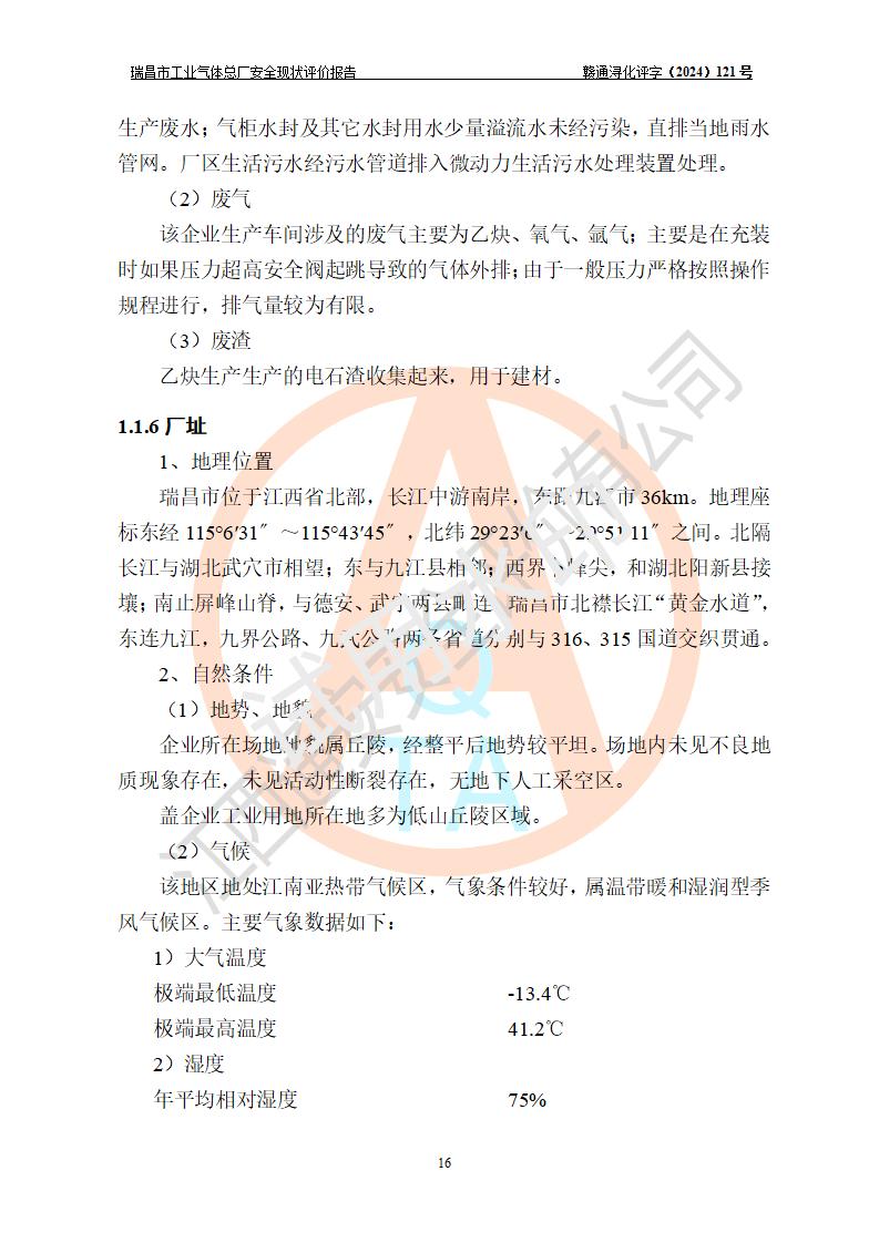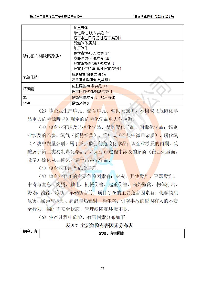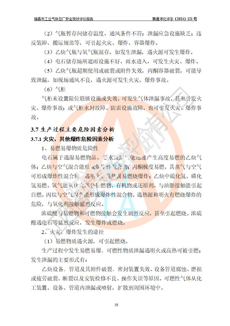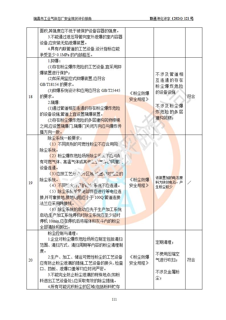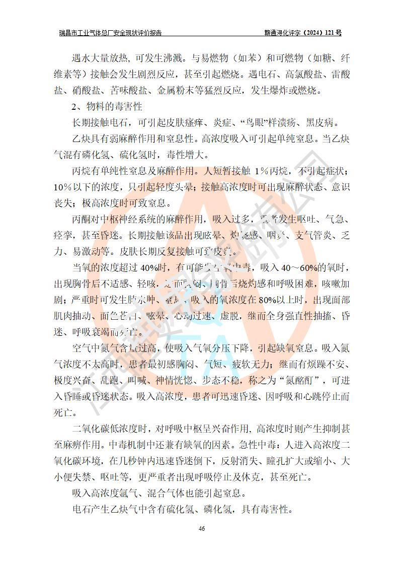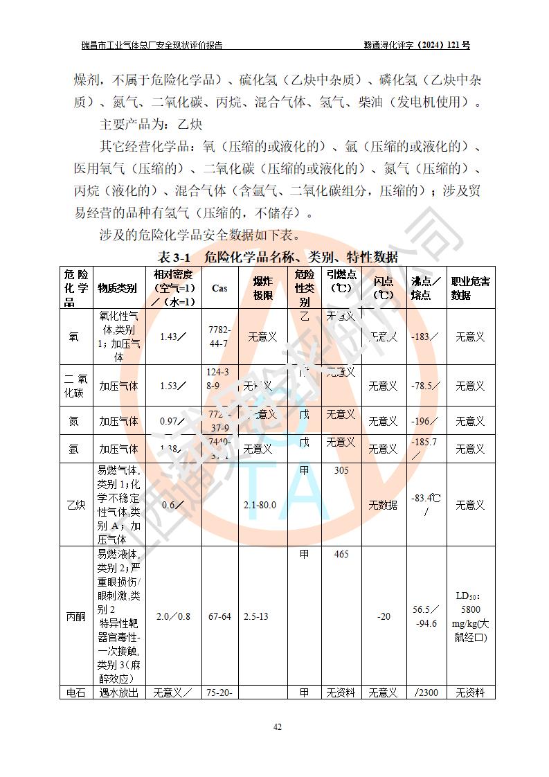 評價結(jié)論 | 瑞昌市工業(yè)氣體總廠廠址、總體布局、設(shè)備布置情況與設(shè)計圖紙一致,在役裝置不涉及危險工藝、重大危險源,企業(yè)主要負責人、安全負責人有相關(guān)化學專業(yè)學歷,且有3年以上化工行業(yè)從業(yè)經(jīng)歷,企業(yè)法人**及安全負責人已取得安全考核合格證。瑞昌市工業(yè)氣體總廠在役裝置配套安全裝置、及采取的安全技術(shù)措施符合**有關(guān)法規(guī)、標準、規(guī)范要求,符合《危險化學品生產(chǎn)企業(yè)安全生產(chǎn)許可證實施辦法》規(guī)定的安全生產(chǎn)條件,風險可控,可滿足安全生產(chǎn)要求。 | ||||