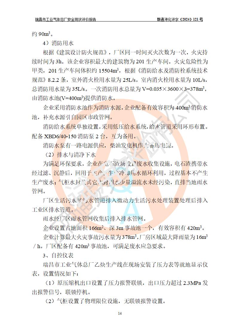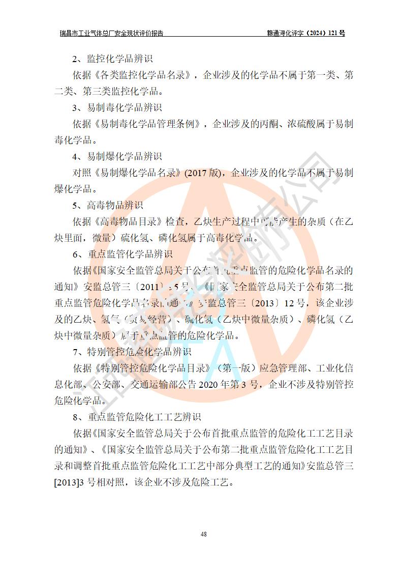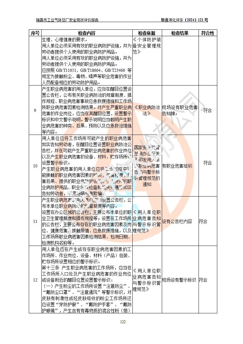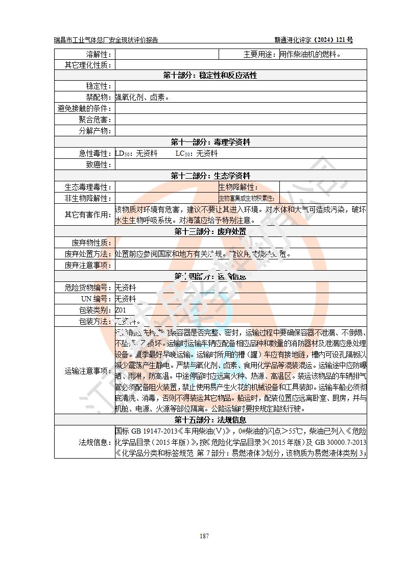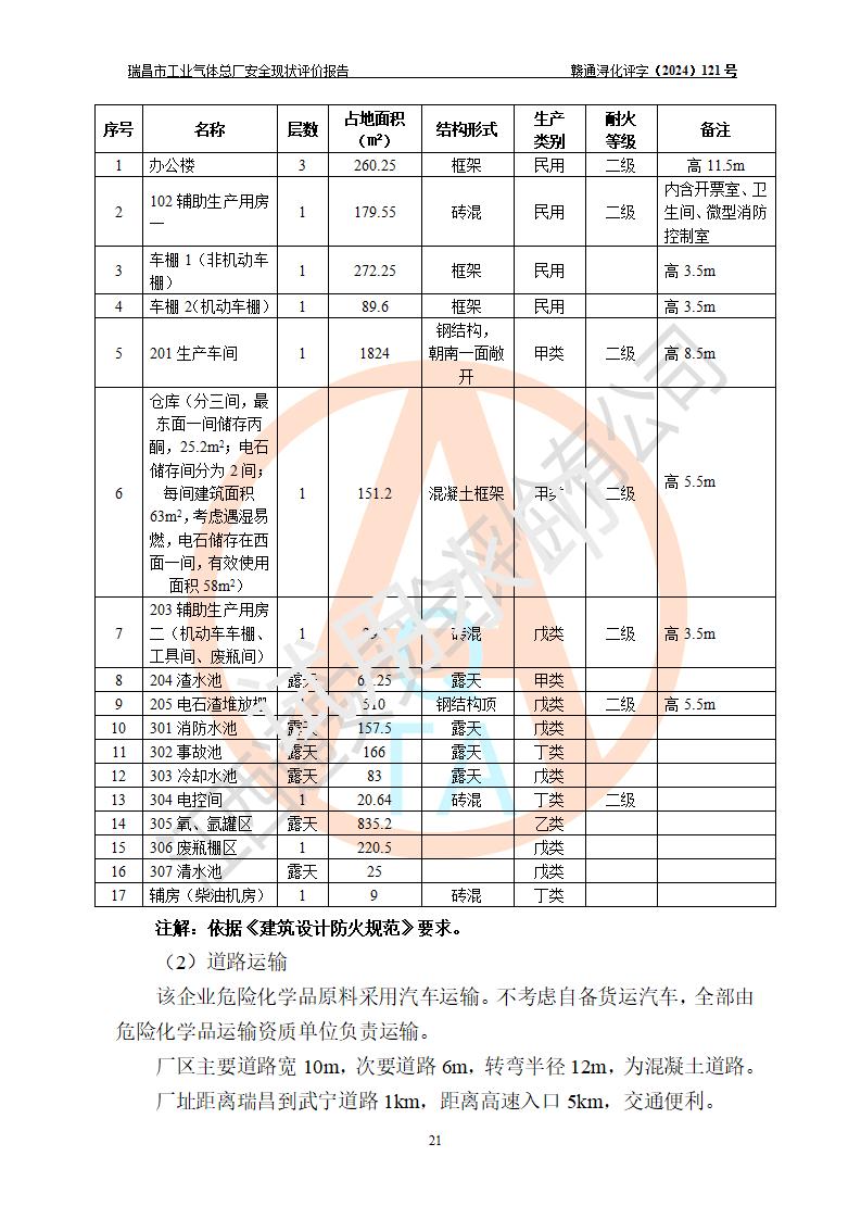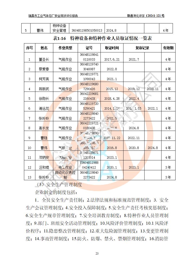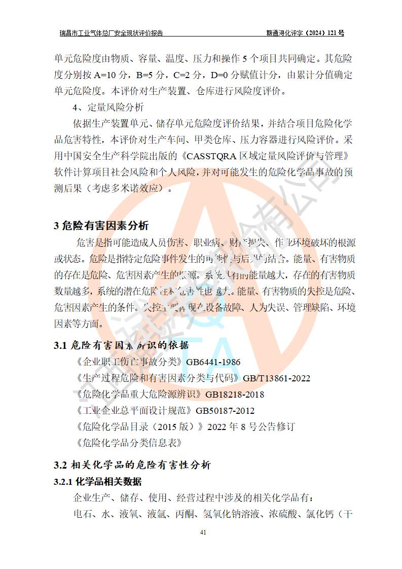 評價結(jié)論 | 瑞昌市工業(yè)氣體總廠廠址、總體布局、設(shè)備布置情況與設(shè)計圖紙一致,在役裝置不涉及危險工藝、重大危險源,企業(yè)主要負責人、安全負責人有相關(guān)化學專業(yè)學歷,且有3年以上化工行業(yè)從業(yè)經(jīng)歷,企業(yè)法人**及安全負責人已取得安全考核合格證。瑞昌市工業(yè)氣體總廠在役裝置配套安全裝置、及采取的安全技術(shù)措施符合**有關(guān)法規(guī)、標準、規(guī)范要求,符合《危險化學品生產(chǎn)企業(yè)安全生產(chǎn)許可證實施辦法》規(guī)定的安全生產(chǎn)條件,風險可控,可滿足安全生產(chǎn)要求。 | ||||
