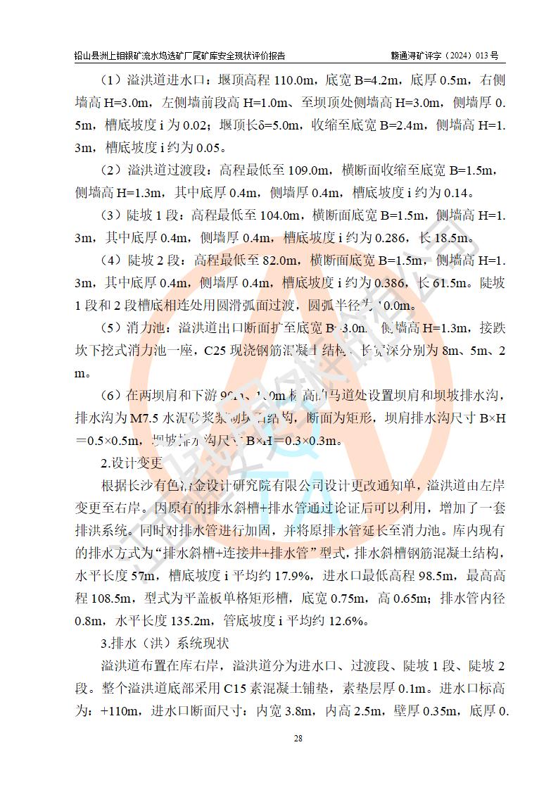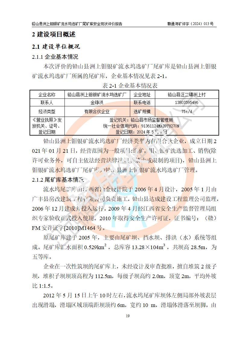 項(xiàng)目簡(jiǎn)介 | 鉛山縣洲上鉬銀礦流水塢選礦廠(chǎng)尾礦庫(kù)由江西省冶金設(shè)計(jì)院于2006年4月設(shè)計(jì),2005年1月由廣豐縣房改建筑工程有限公司負(fù)責(zé)施工,鉛山縣達(dá)成建設(shè)工程監(jiān)理公司監(jiān)理,2006年12月建成并投入運(yùn)行。2009年4月經(jīng)江西省安全生產(chǎn)監(jiān)督管理局組織專(zhuān)家驗(yàn)收正式投入使用。2010年取得安全生產(chǎn)許可證,證書(shū)編號(hào):(贛)FM安許證字[2010]M1464號(hào)。 原設(shè)計(jì)總壩高24m,總庫(kù)容10.06萬(wàn)立方,服務(wù)年限5年,尾礦庫(kù)運(yùn)行后,企業(yè)擅自堆筑2級(jí)子壩。2012年5月15日,尾礦庫(kù)壩體左側(cè)局部外坡表層發(fā)生坍塌事故。經(jīng)江西省安全生產(chǎn)監(jiān)督管理局專(zhuān)家現(xiàn)場(chǎng)指導(dǎo)、當(dāng)?shù)?*全力組織搶險(xiǎn),5月20日險(xiǎn)情得以解除。為消除鉛山縣洲上鉬銀礦流水塢選礦廠(chǎng)尾礦庫(kù)存在的安全隱患,江西西園實(shí)業(yè)有限公司決定實(shí)施尾礦庫(kù)整改工程。 2012年9月委托江西鷹潭九一二工程勘察院編制了《巖土工程勘察報(bào)告》,2012年11月委托江西贛安安全生產(chǎn)科學(xué)技術(shù)咨詢(xún)服務(wù)中心編制了《江西西園實(shí)業(yè)有限公司鉛山縣洲上鉬銀礦流水塢選礦廠(chǎng)尾礦庫(kù)整改工程安全預(yù)評(píng)價(jià)報(bào)告》,2012年12月由長(zhǎng)沙有色冶金設(shè)計(jì)研究院有限公司編制《江西西園實(shí)業(yè)有限公司鉛山縣洲上鉬銀礦流水塢選礦廠(chǎng)尾礦庫(kù)初步設(shè)計(jì)及安全專(zhuān)篇》,2013年1月企業(yè)取得設(shè)計(jì)批復(fù),編號(hào):贛安監(jiān)非煤項(xiàng)目設(shè)審[2013]006號(hào)。 工程于2013年1月18日開(kāi)工,2013年12月31日竣工。項(xiàng)目竣工后由企業(yè)組織設(shè)計(jì)、施工、監(jiān)理單位進(jìn)行了四方聯(lián)合驗(yàn)收,進(jìn)行了試運(yùn)行,通過(guò)試運(yùn)行,尾礦庫(kù)運(yùn)行工況良好。 2015年5月由江西礦安安全生產(chǎn)科學(xué)技術(shù)咨詢(xún)中心有限公司提交《江西西園實(shí)業(yè)有限公司鉛山縣洲上鉬銀礦流水塢選礦廠(chǎng)尾礦庫(kù)整改工程安全驗(yàn)收評(píng)價(jià)報(bào)告》,并于2015年5月28-29日,通過(guò)原江西省安全生產(chǎn)監(jiān)督管理局非煤礦山處組織的專(zhuān)家組評(píng)審;同時(shí)專(zhuān)家組對(duì)現(xiàn)場(chǎng)安全設(shè)施進(jìn)行了現(xiàn)場(chǎng)驗(yàn)收,提出了整改意見(jiàn)。后因企業(yè)經(jīng)營(yíng)方面原因,一直未辦理安全生產(chǎn)許可證,尾礦庫(kù)亦一直未投入生產(chǎn)使用。2021年8月,江西西園實(shí)業(yè)有限公司委托南昌安達(dá)安全技術(shù)咨詢(xún)有限公司對(duì)尾礦庫(kù)再次進(jìn)行驗(yàn)收評(píng)價(jià),作為辦理安全生產(chǎn)許可證技術(shù)材料。2021年10月24日,江西西園實(shí)業(yè)有限公司組織相關(guān)專(zhuān)家對(duì)鉛山縣洲上鉬銀礦流水塢選礦廠(chǎng)尾礦庫(kù)整改工程進(jìn)行了竣工驗(yàn)收,并經(jīng)過(guò)專(zhuān)家組及南昌安達(dá)安全技術(shù)咨詢(xún)有限公司評(píng)價(jià)人員復(fù)核通過(guò)。 企業(yè)經(jīng)過(guò)更換安全生產(chǎn)許可證,于2022年8月1日取得安全生產(chǎn)許可證,**期至2025年2月9日,證書(shū)編號(hào):(贛)FM安許證字[2022]M1801號(hào)。現(xiàn)安全生產(chǎn)許可證**期即將到期,依照《非煤礦礦山企業(yè)安全生產(chǎn)許可證延期換證工作》的通知,根據(jù)***《安全生產(chǎn)許可證條例》、《江西省安全生產(chǎn)條例》、《非煤礦山安全生產(chǎn)許可證實(shí)施辦法》、《江西省非煤礦礦山企業(yè)安全生產(chǎn)許可證辦法》規(guī)定的要求,鉛山縣洲上鉬銀礦流水塢選礦廠(chǎng)尾礦庫(kù)在延期換證前,應(yīng)進(jìn)行安全現(xiàn)狀評(píng)價(jià)。 | ||||||