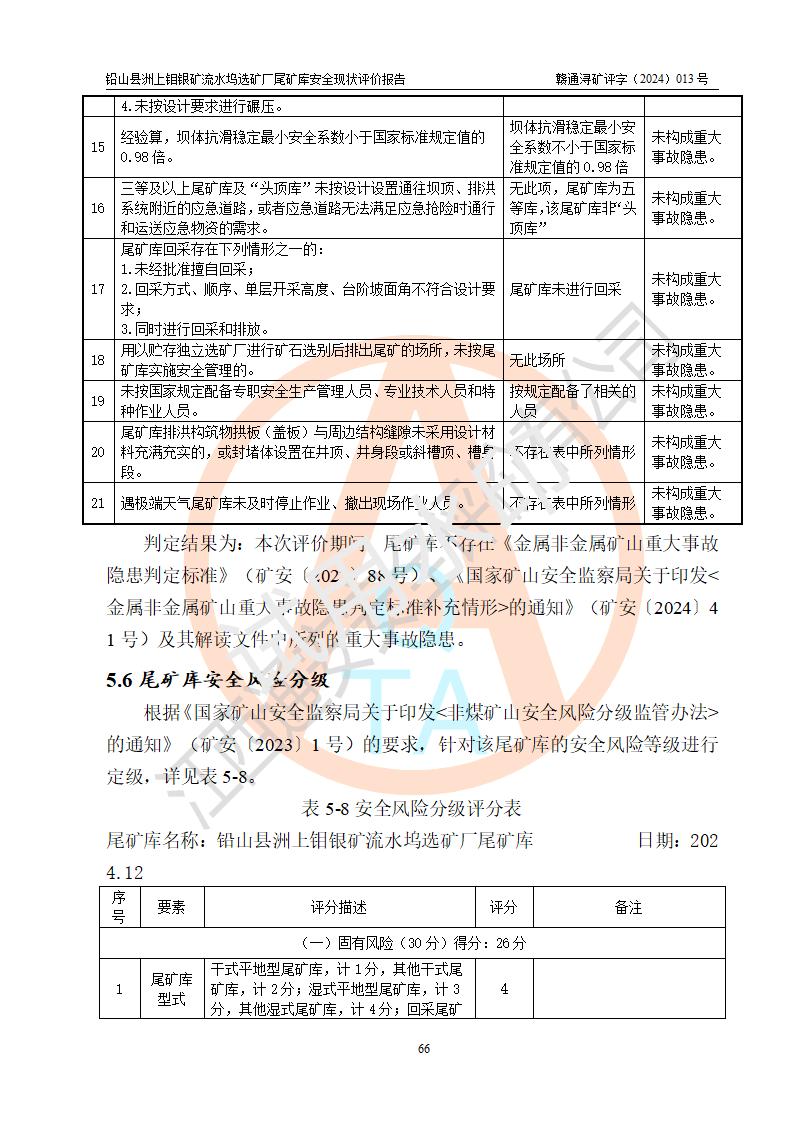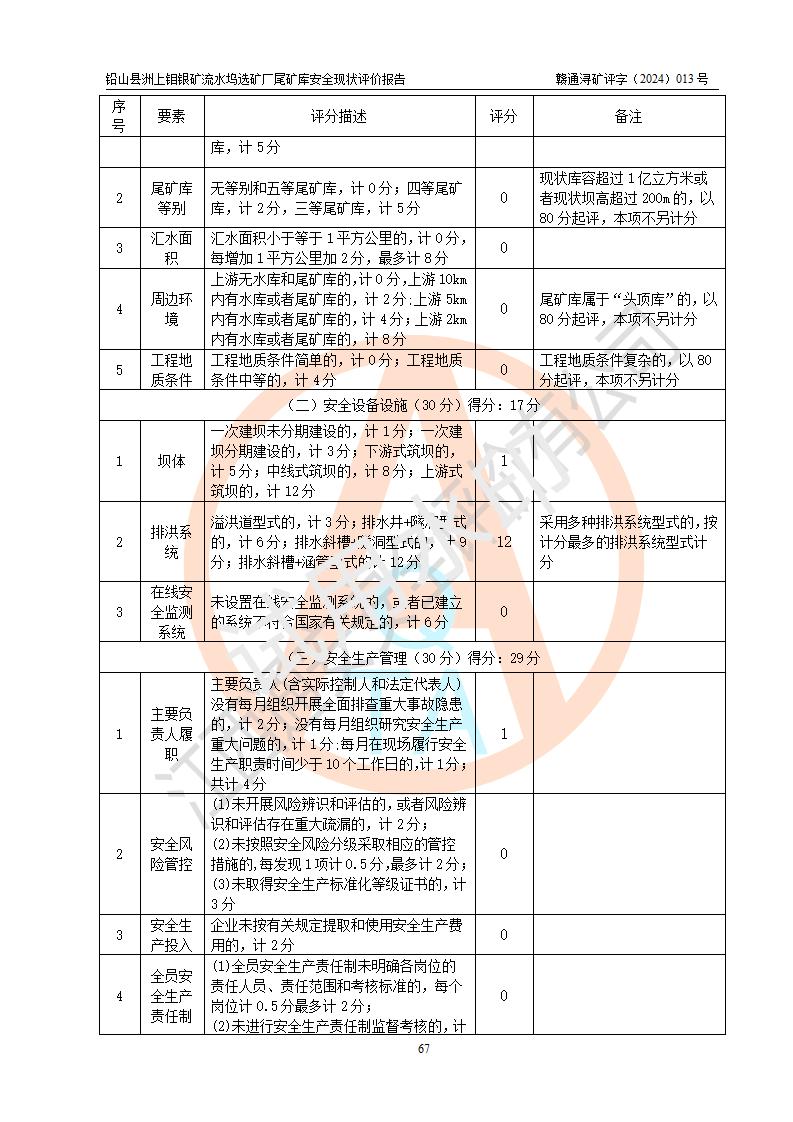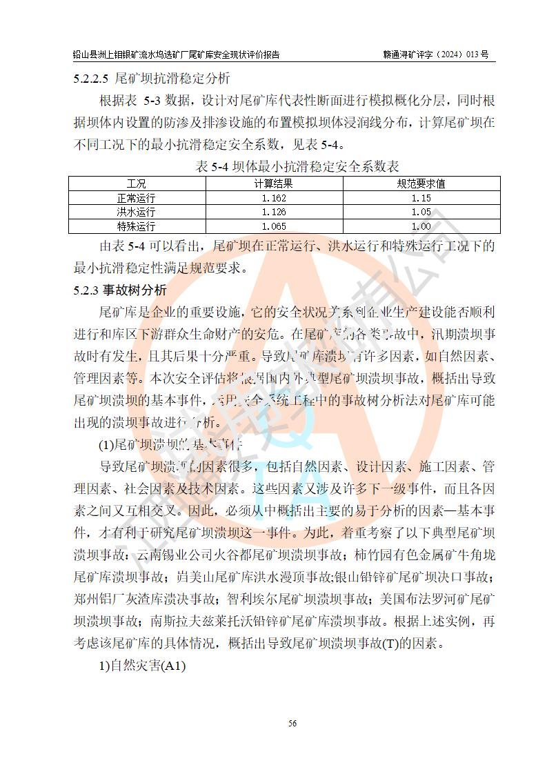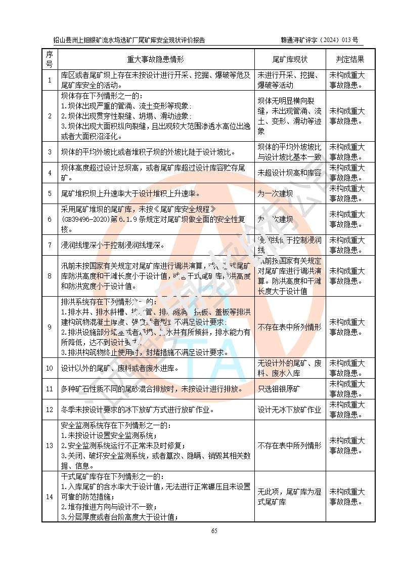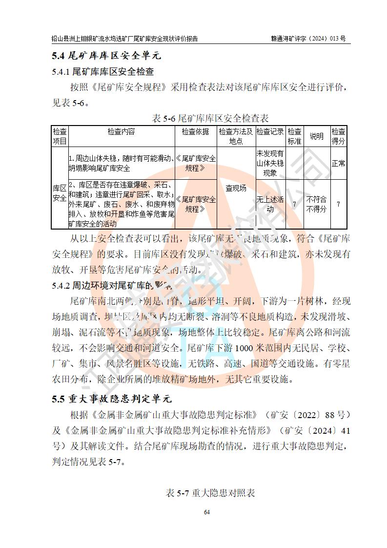 評(píng)價(jià)結(jié)論 | 通過(guò)對(duì)鉛山縣洲上鉬銀礦流水塢選礦廠(chǎng)尾礦庫(kù)的安全現(xiàn)狀評(píng)價(jià),該庫(kù)壩體穩(wěn)定,防洪能力符合設(shè)計(jì)要求;安全管理能夠符合安全生產(chǎn)的要求;尾礦庫(kù)的壩體、排(水)洪系統(tǒng)等工況正常,具備《非煤礦山企業(yè)安全生產(chǎn)許可證實(shí)施辦法》要求的安全生產(chǎn)條件。 | ||||||