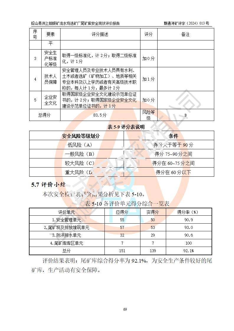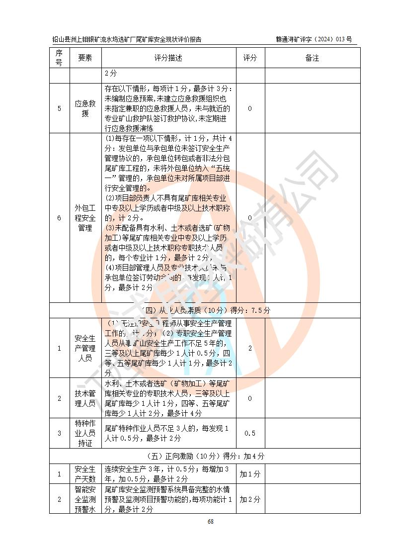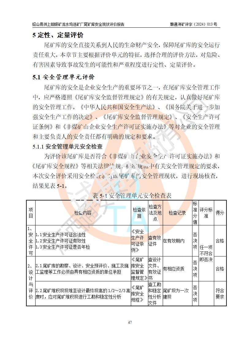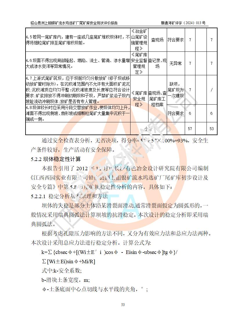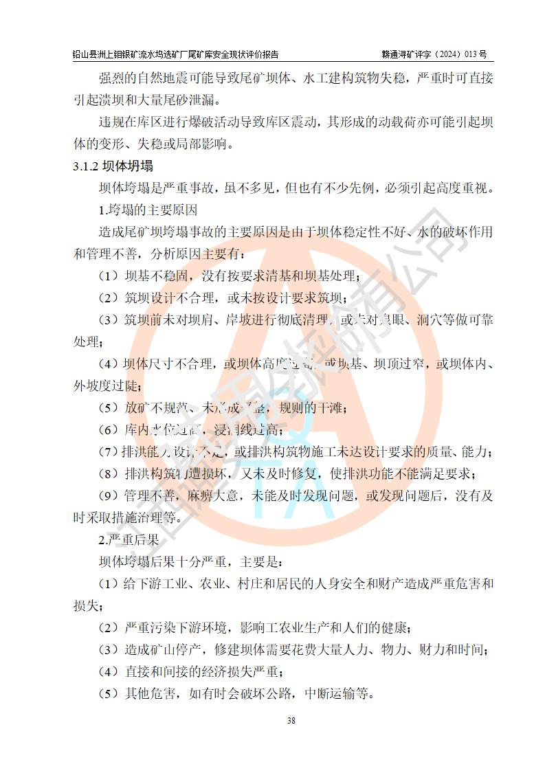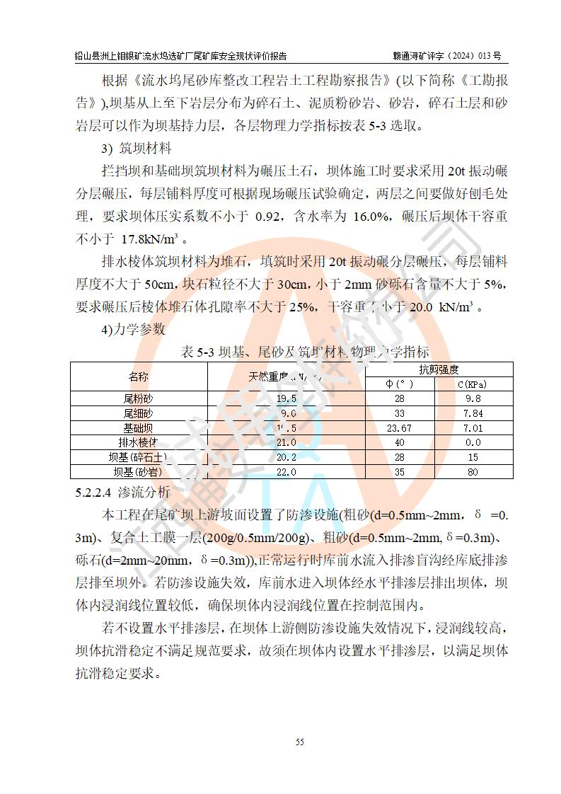 評(píng)價(jià)結(jié)論 | 通過(guò)對(duì)鉛山縣洲上鉬銀礦流水塢選礦廠(chǎng)尾礦庫(kù)的安全現(xiàn)狀評(píng)價(jià),該庫(kù)壩體穩(wěn)定,防洪能力符合設(shè)計(jì)要求;安全管理能夠符合安全生產(chǎn)的要求;尾礦庫(kù)的壩體、排(水)洪系統(tǒng)等工況正常,具備《非煤礦山企業(yè)安全生產(chǎn)許可證實(shí)施辦法》要求的安全生產(chǎn)條件。 | ||||||