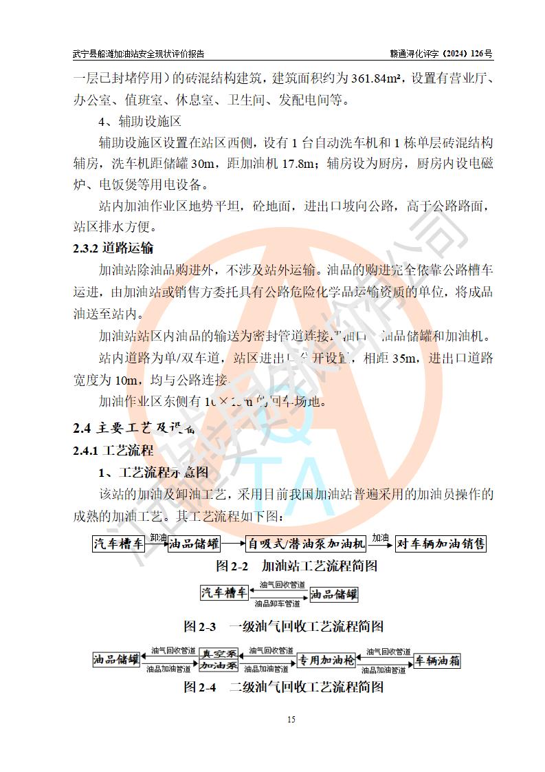 項(xiàng)目簡介 | 武寧縣船灘加油站是一家專門從事成品油零售經(jīng)營的個(gè)體工商戶,經(jīng)營場所位于江西省九江市武寧縣船灘集鎮(zhèn)?,F(xiàn)有從業(yè)人員7名,其中安全管理人員1人,加油站負(fù)責(zé)人華瑞。 該加油站占地面積約2000m2,站區(qū)內(nèi)設(shè)置有4臺雙槍程控燃油加油機(jī)及配套的工藝管線,設(shè)有SF雙層儲罐3臺,其中30m3的92#汽油儲罐1臺、30m3的0#柴油儲罐1臺、30m3的95#汽油儲罐1臺,油品儲罐總?cè)莘e為90m3(折算成汽油為75m3),按現(xiàn)行《汽車加油加氣加氫站技術(shù)標(biāo)準(zhǔn)》對加油站的等級劃分原則,屬三級加油站。 該站由九江市行政審批局換發(fā)《危險(xiǎn)化學(xué)品經(jīng)營許可證》(證號:贛九行審經(jīng)(甲)字[2022]000025號),**期限2022年02月23日至2025年02月22日。 | |||